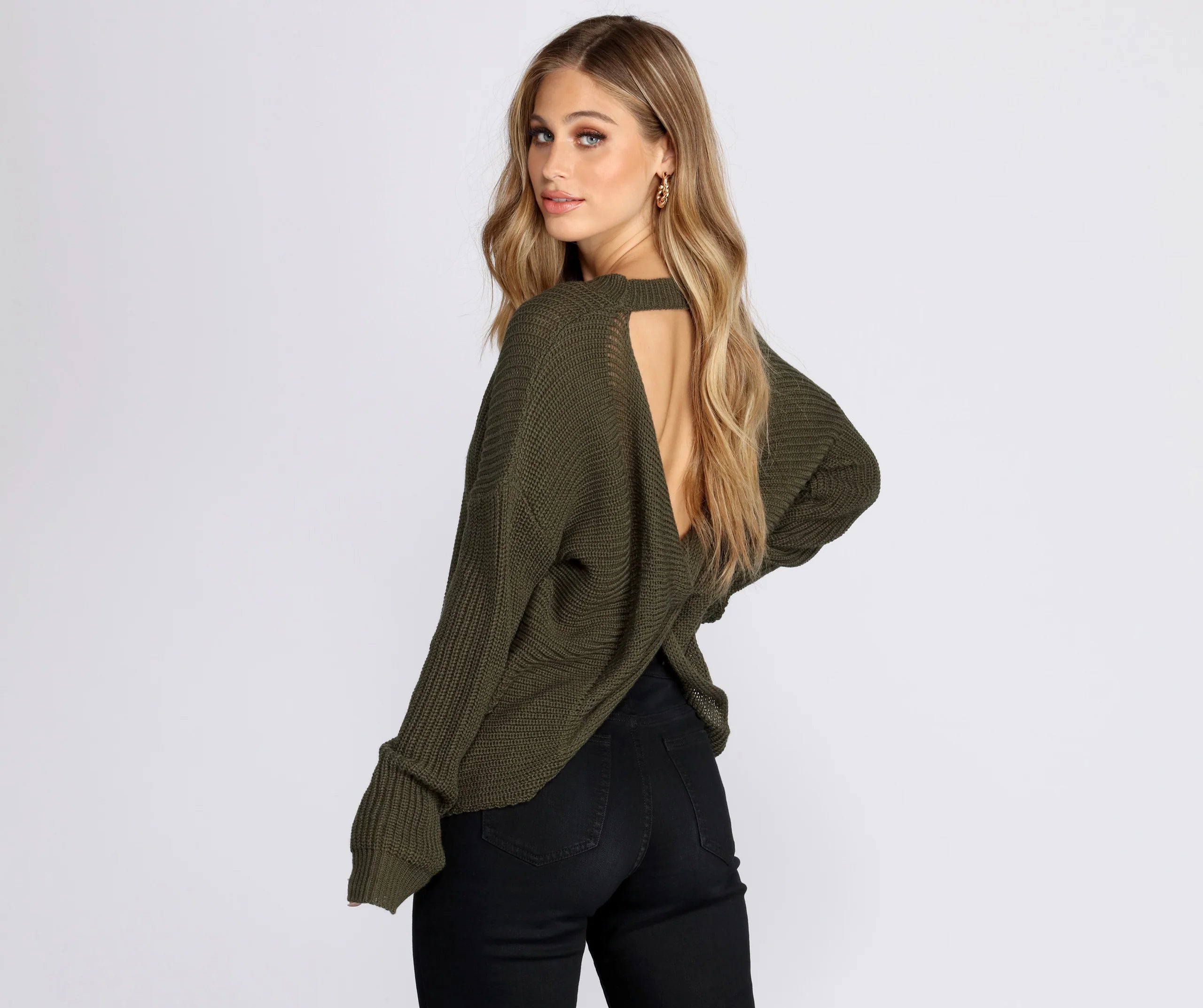 Treat yourself to this pretty sweater this season! It features a wide crew neck, long sleeves with ribbed cuffs and matching ribbed hem. The open back design features a bar strap accent and a lower back twist knot detail. Sweater is composed of a soft to the touch knit fabric that offers a relaxed fit with a moderate stretch.