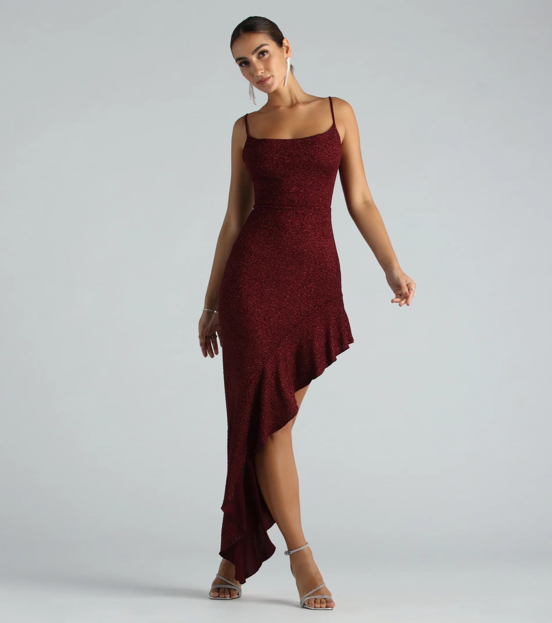 The Kylie formal glitter dress will ensure no one overlooks your entrance. She features a cowl neckline, form-hugging slim silhouette, and glitter crepe knit fabric, this sleeveless dress makes a statement with its sophisticated side slit trimmed with elegant ruffled trim. An eye-catching piece for any evening event, this long-length hem will have you glittering as you make your grand entrance. Complete the look in platform heels and clutch for a school dance or red carpet occasion!