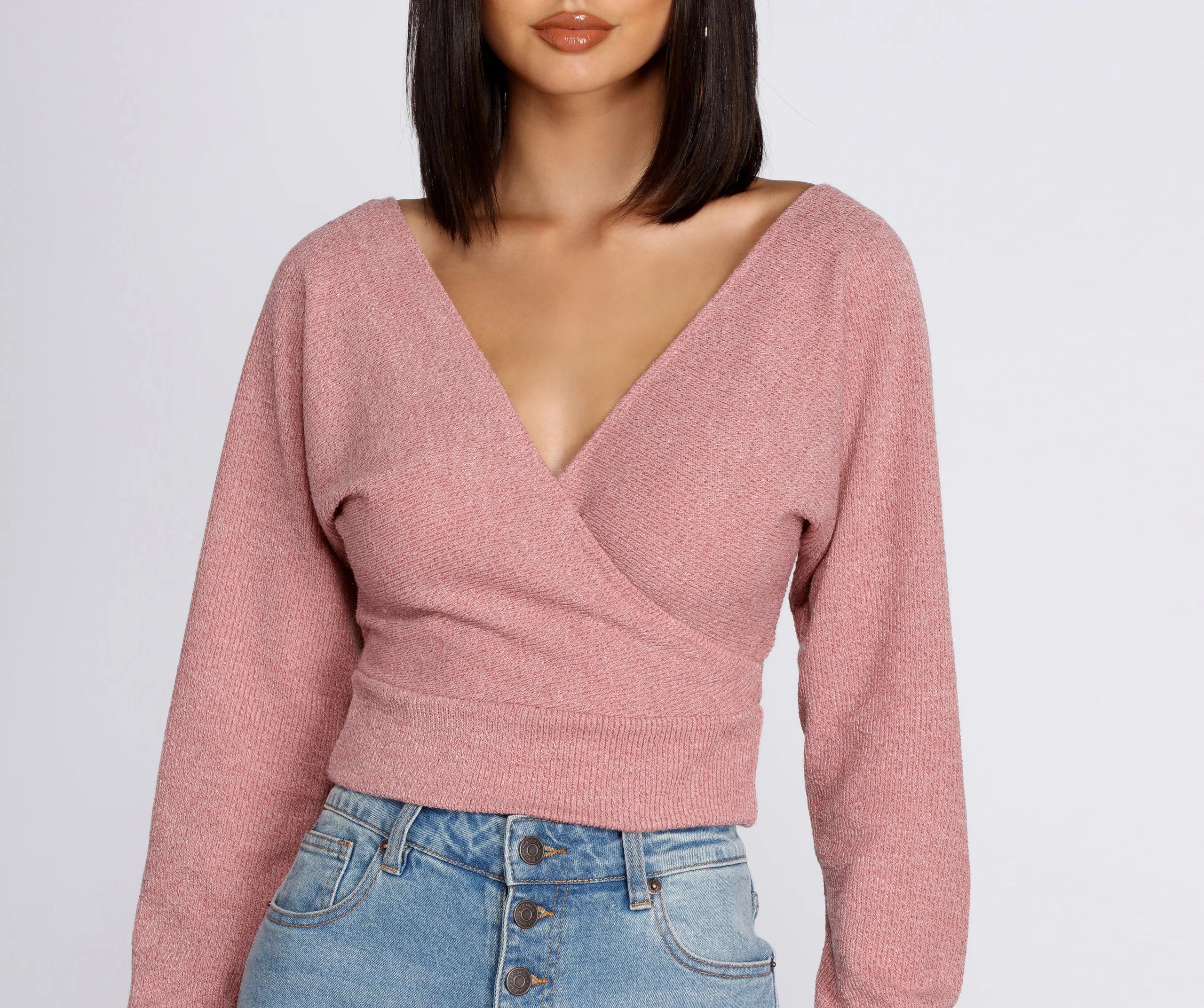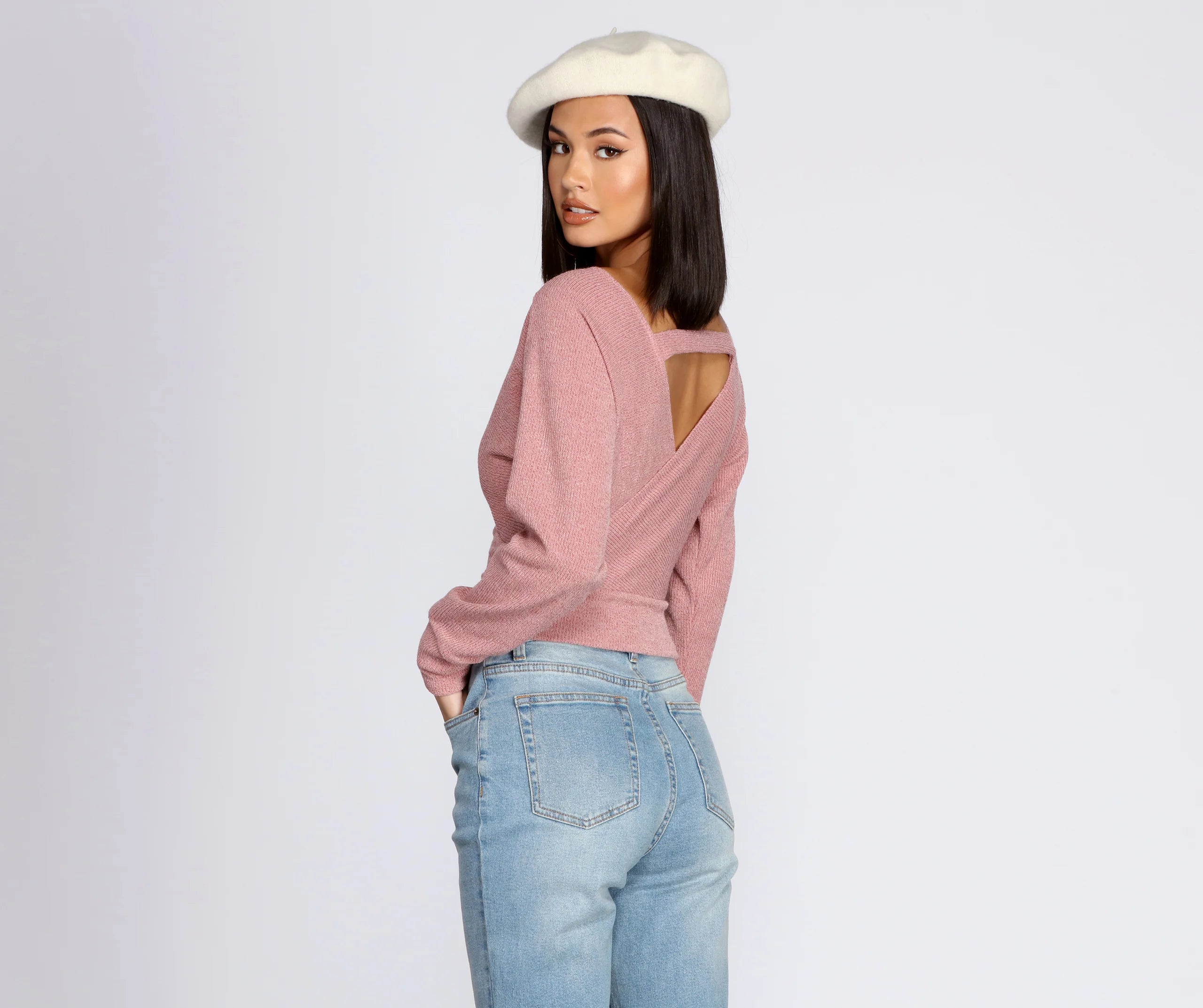 Exert your femme side! Wrap yourself in a knit sweater that features, a v neckline, long sleeves, and a flattering wrap around design. Back of sweater has a cut out and and bar detailing. Hem features a thick waist band, and hits mid torso. Composed of a ribbed knit material that offers moderate stretch.