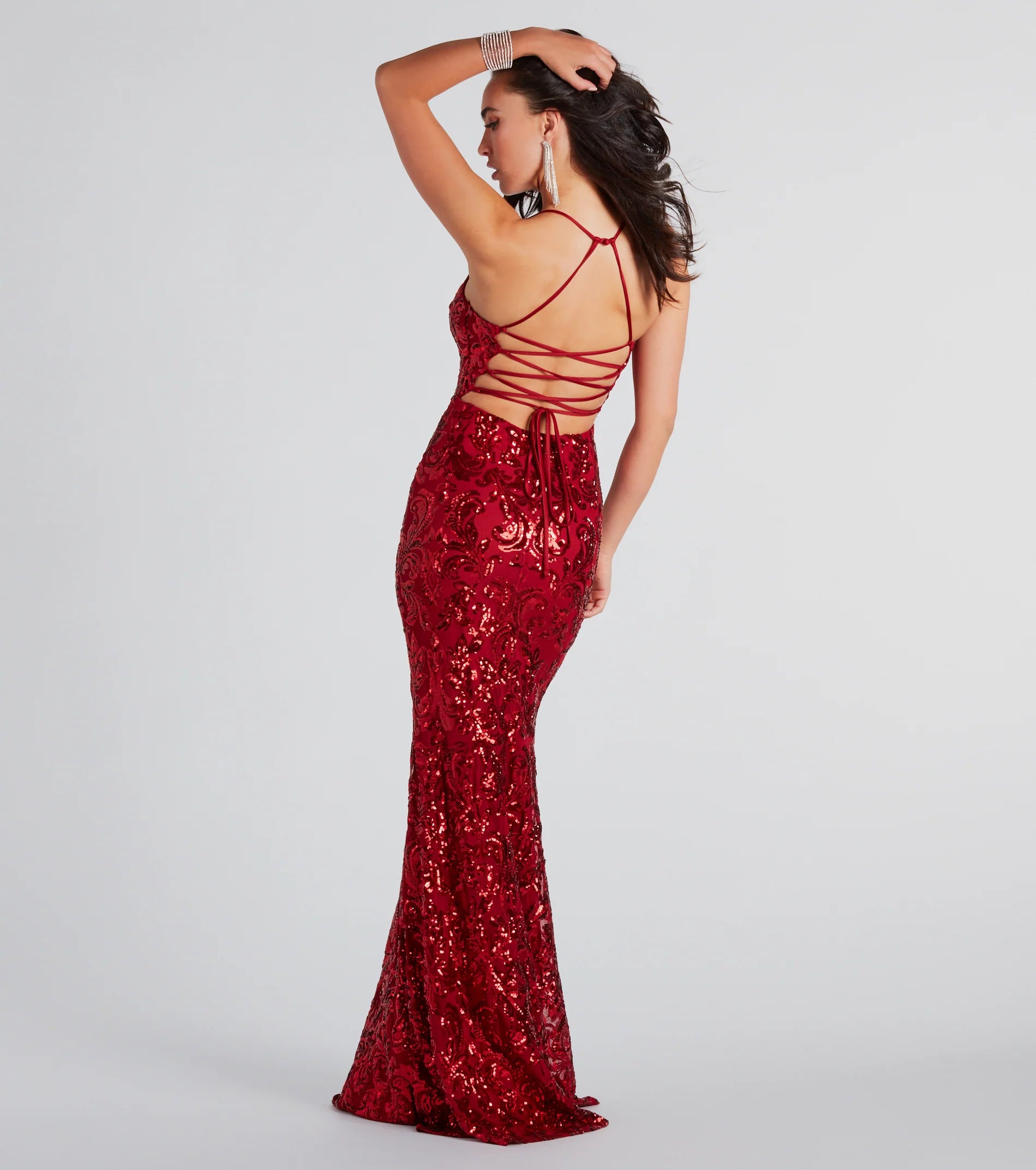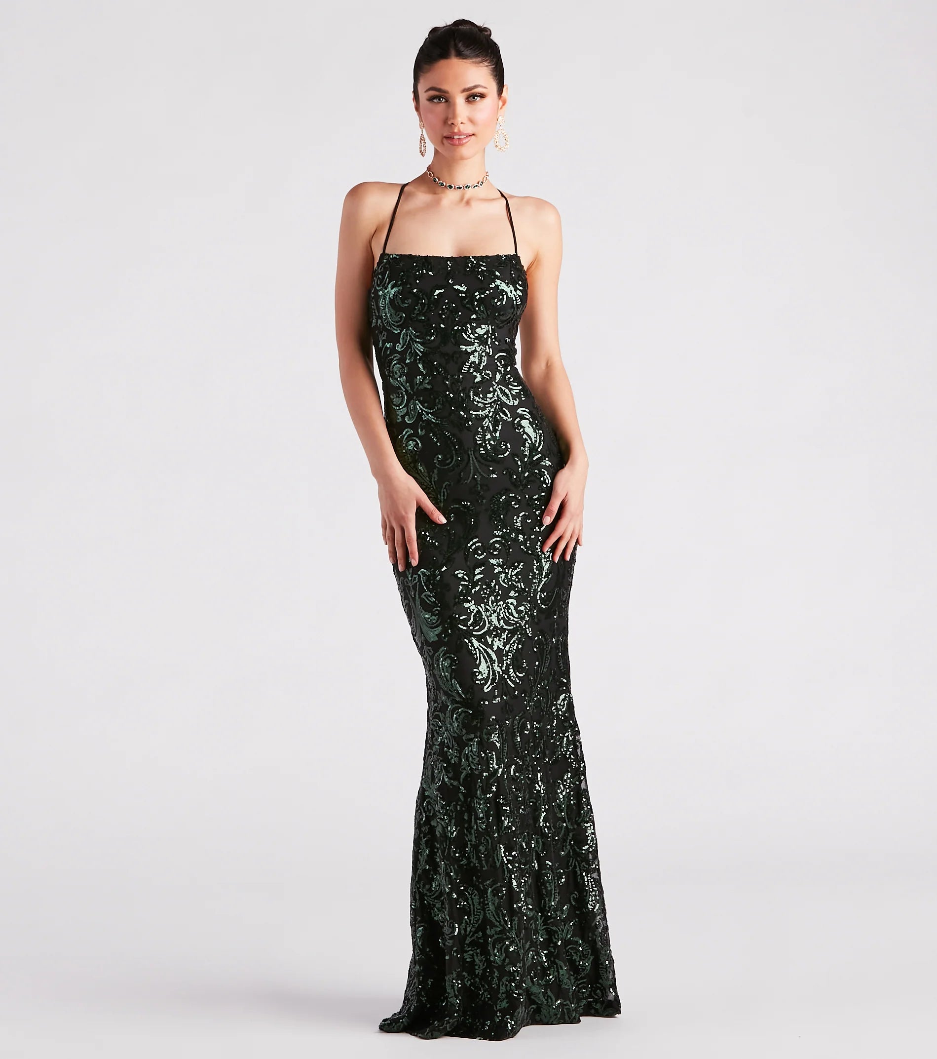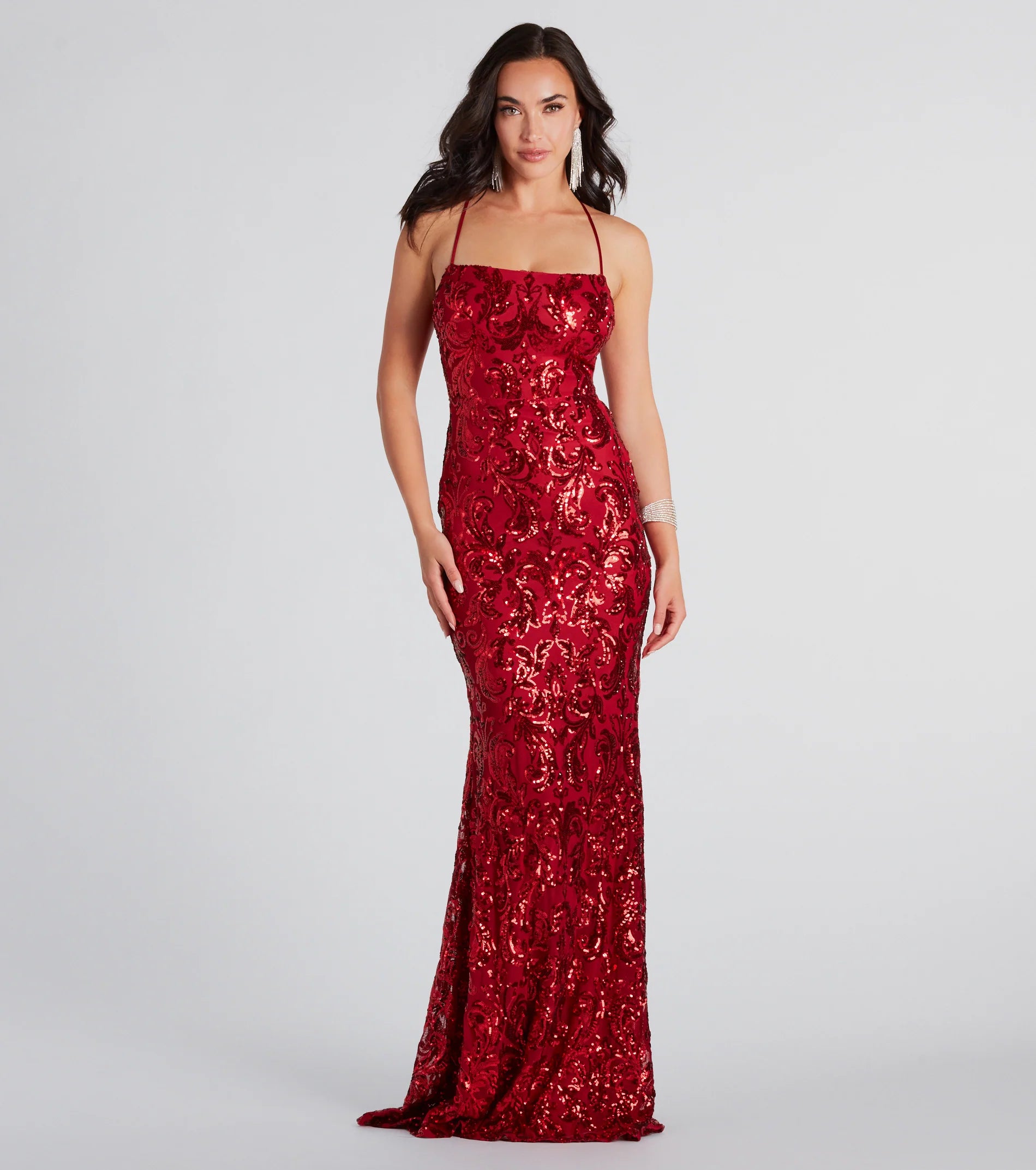 Put a twinkle in everyone's eyes when you strike them with your shine in the Lacie formal sequin long dress at galas, school dances, and anniversary parties! She features a sleeveless square neckline with a non-slip grip lining, a lightly padded bust, halter spaghetti straps with back button closure, an open lace-up back, and a form-hugging mermaid silhouette with a floor-length hem. The formal long-length dress is composed of a sequin-embellished mesh fabric with a stretchy knit lining. Complete the look with a statement choker necklace.