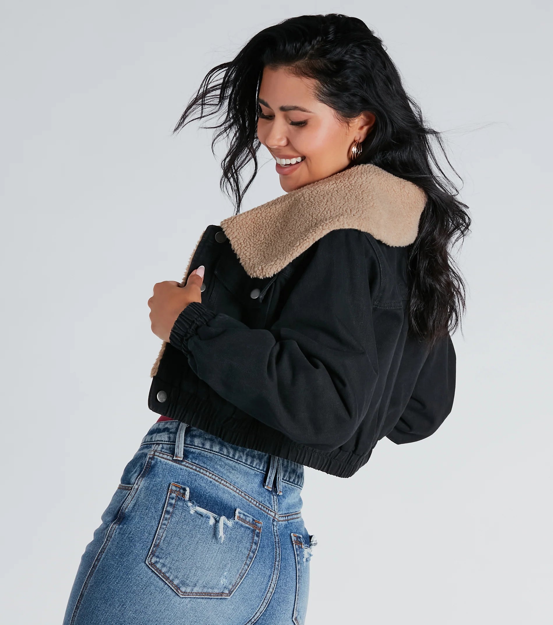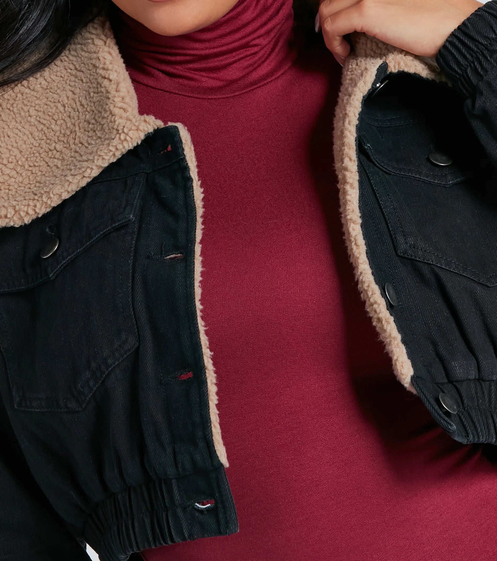 Layer on all the cozy vibes with this adorable faux sherpa denim jacket perf for the season! It features a faux sherpa contrast wide collar, long sleeves with elastic cinched hems, a button-down front, buttoned chest pockets, and a cropped elastic cinched hem. The cotton-blend denim features a cozy faux sherpa lining. Style this trendy jacket over a sweater dress with knee-high boots for a chic 'fit.