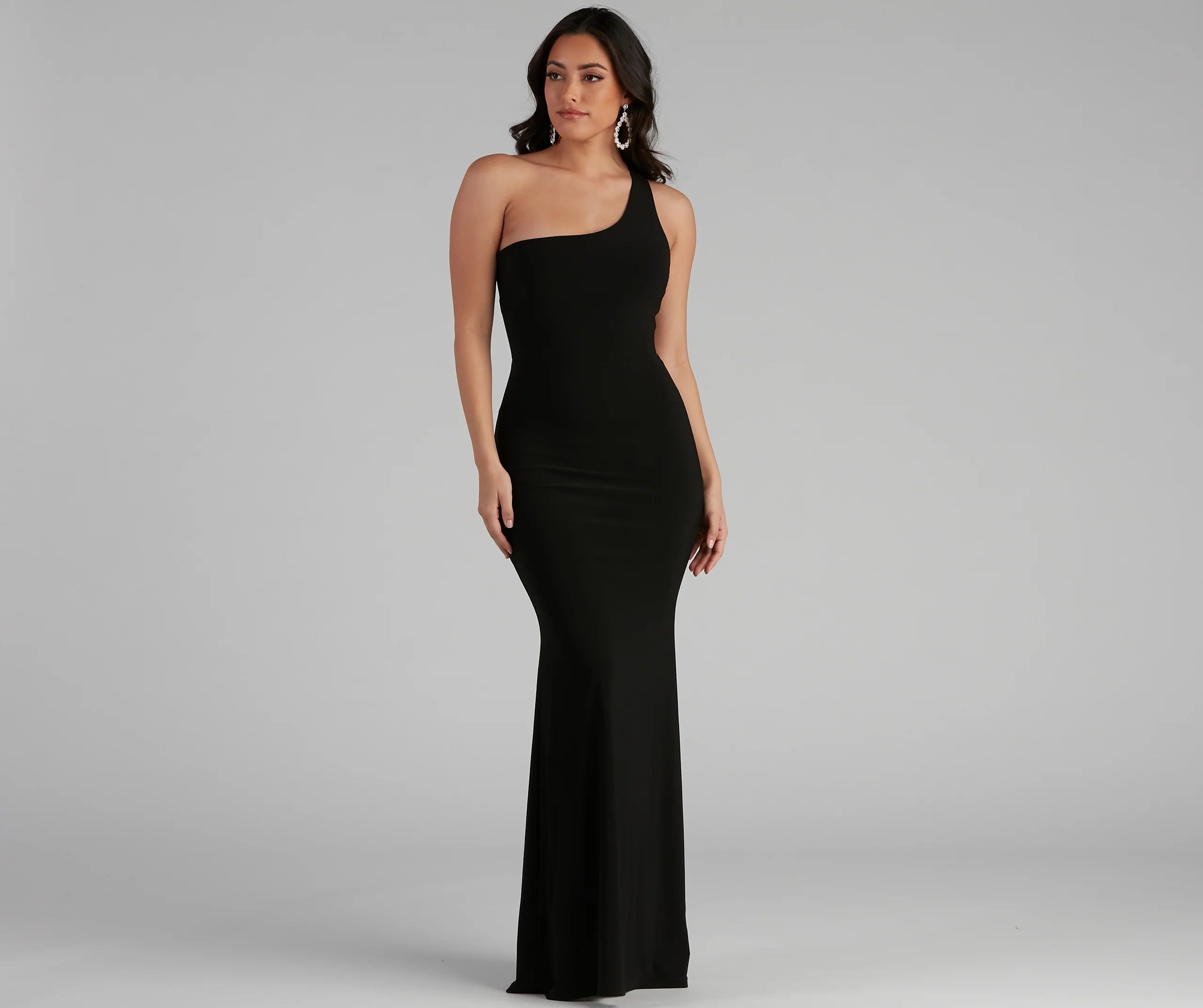 Make a captivating entrance in the breathtaking Leilani formal dress. She features a daring one-shoulder neckline, a tank-like shoulder strap that leads to an asymmetrical back, a sexy open back design, and a mermaid silhouette. The dress is composed of a lined smooth knit fabric that offers a form-hugging fit with a moderate stretch. Complete look with chandelier earrings and heels.