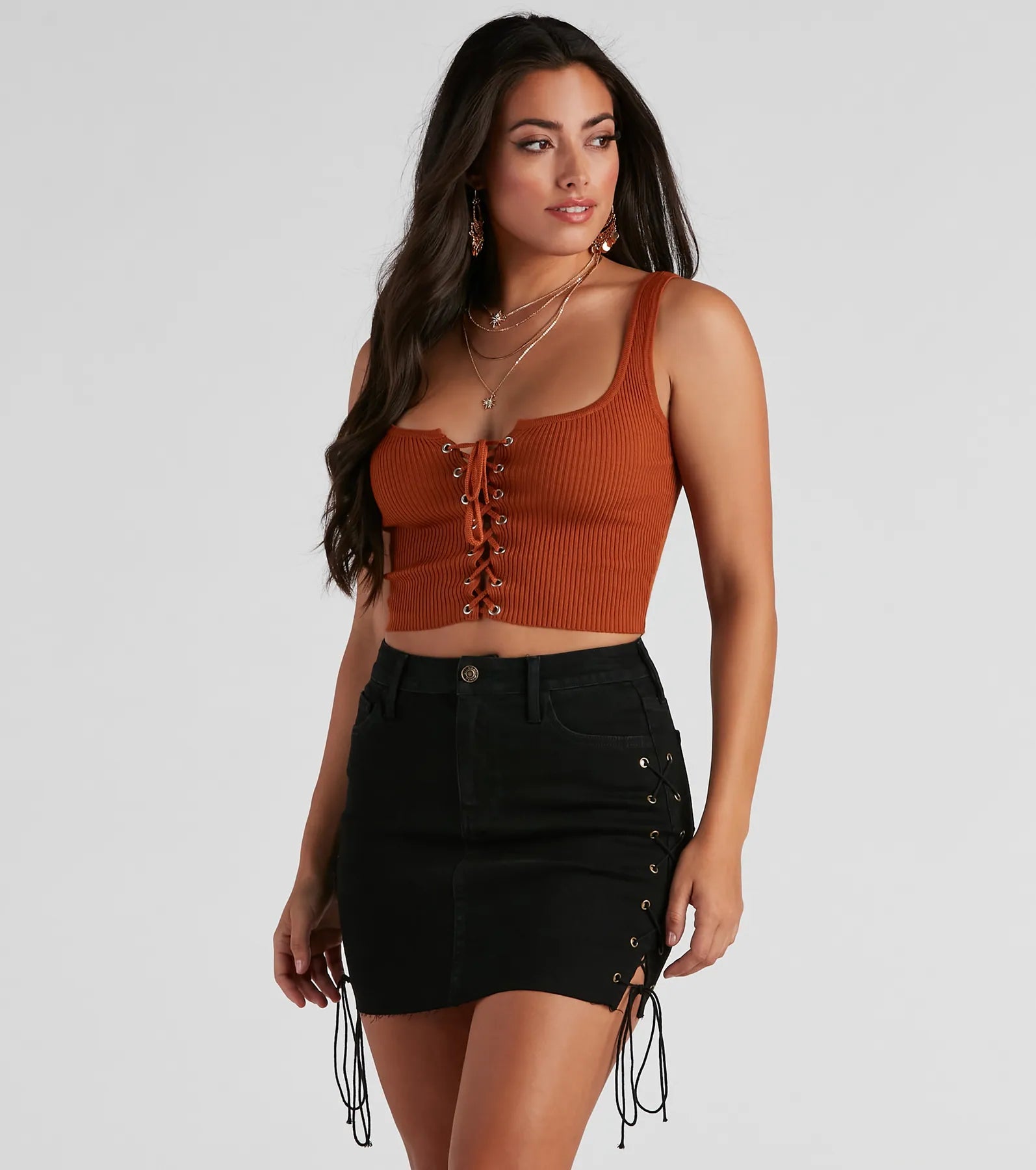 Looking for a light layer? This sweater knit tank top is a cute choice! It features a sleeveless, scoop neck, tank-style straps, a front lace-up placket, cropped hem, and stretchy rib-knit fabric. Complete the look in a denim skirt for a coffee run.