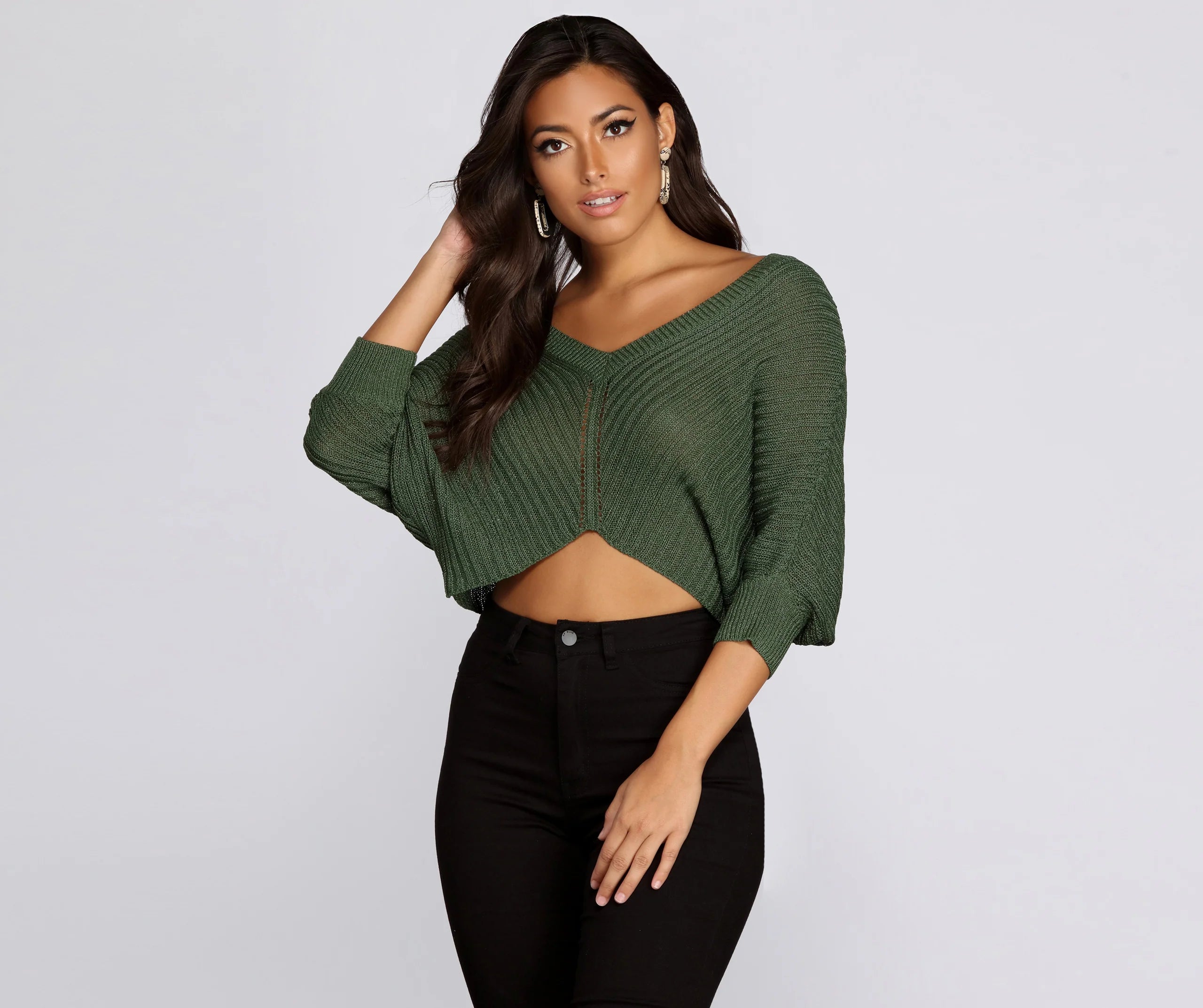 This pullover features a v neckline, long sleeves that are dolman style sleeves, and a cropped hem that rises up at the center front. Top is composed of a knit material adorned with glitter that offers a light weight material that offers moderate stretch.