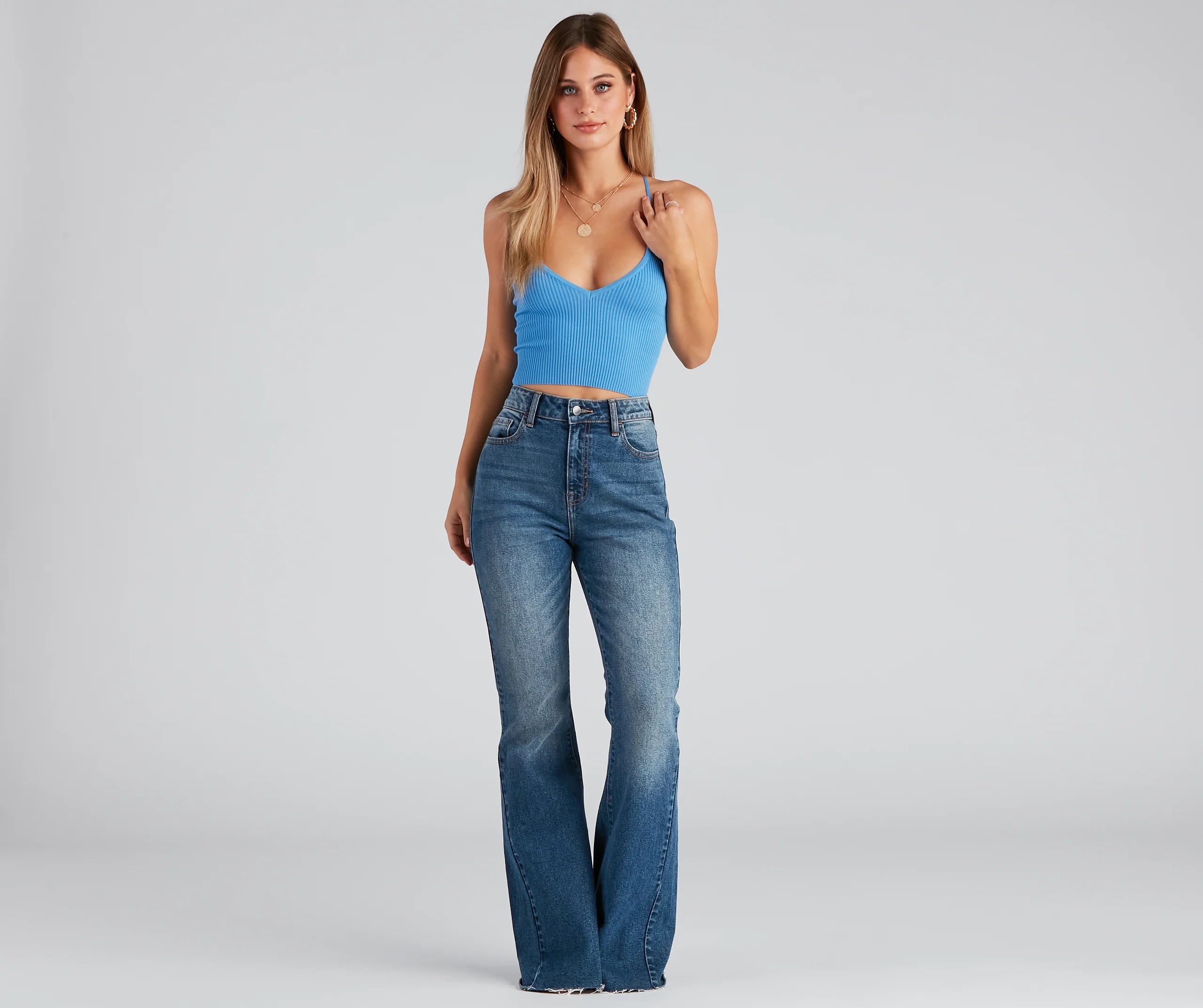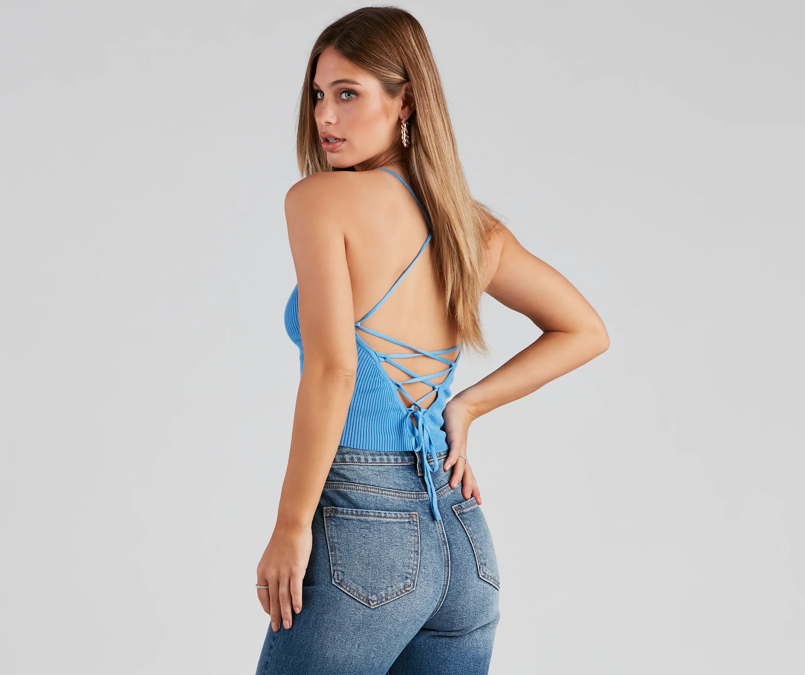 All eyes on you in this sweater knit top featuring a sleeveless, V-neck, cropped hem, and an open back with lace-up detail. Composed of stretchy rib-knit fabric. Finish the look in a mini skirt for a cute vibe.