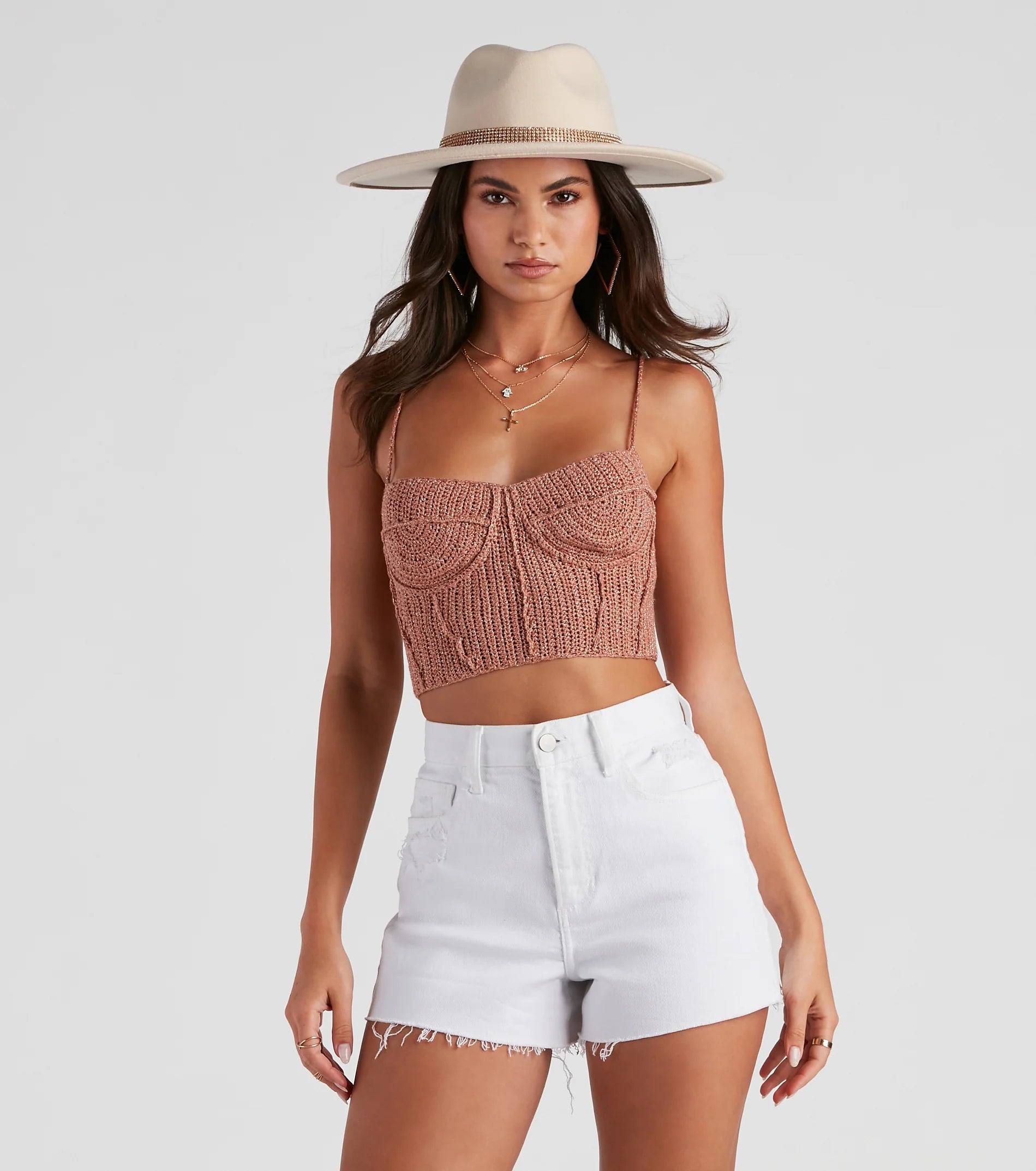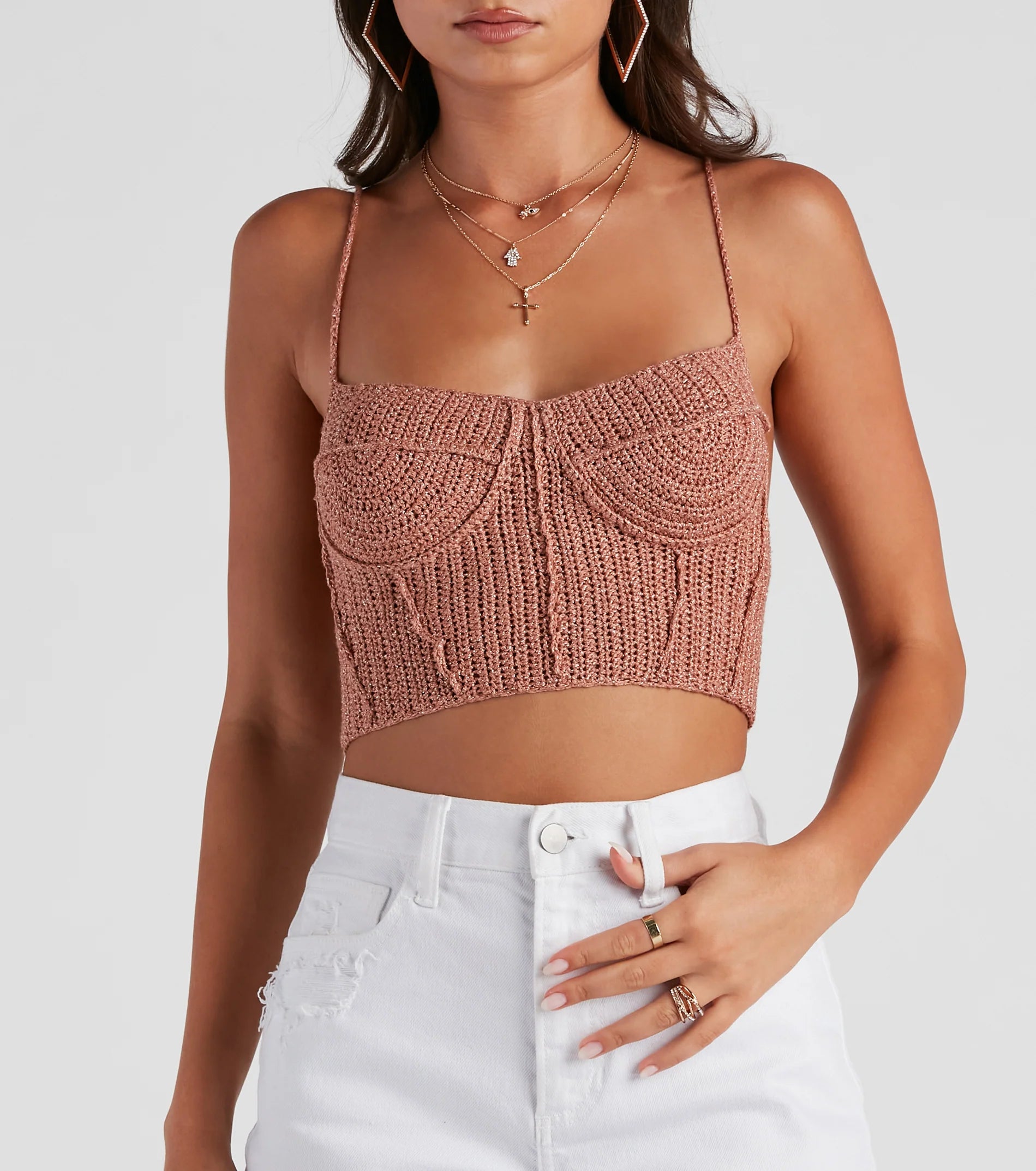 Live that luxe life with a glitzy bustier! The bustier features a sleeveless sweetheart neckline, spaghetti straps that lead to cross back, lace-up back, and a cropped hem. The bustier is composed of a crochet lurex knit fabric that offers a form hugging fit with a moderate stretch. Complete look with high waist jeans.