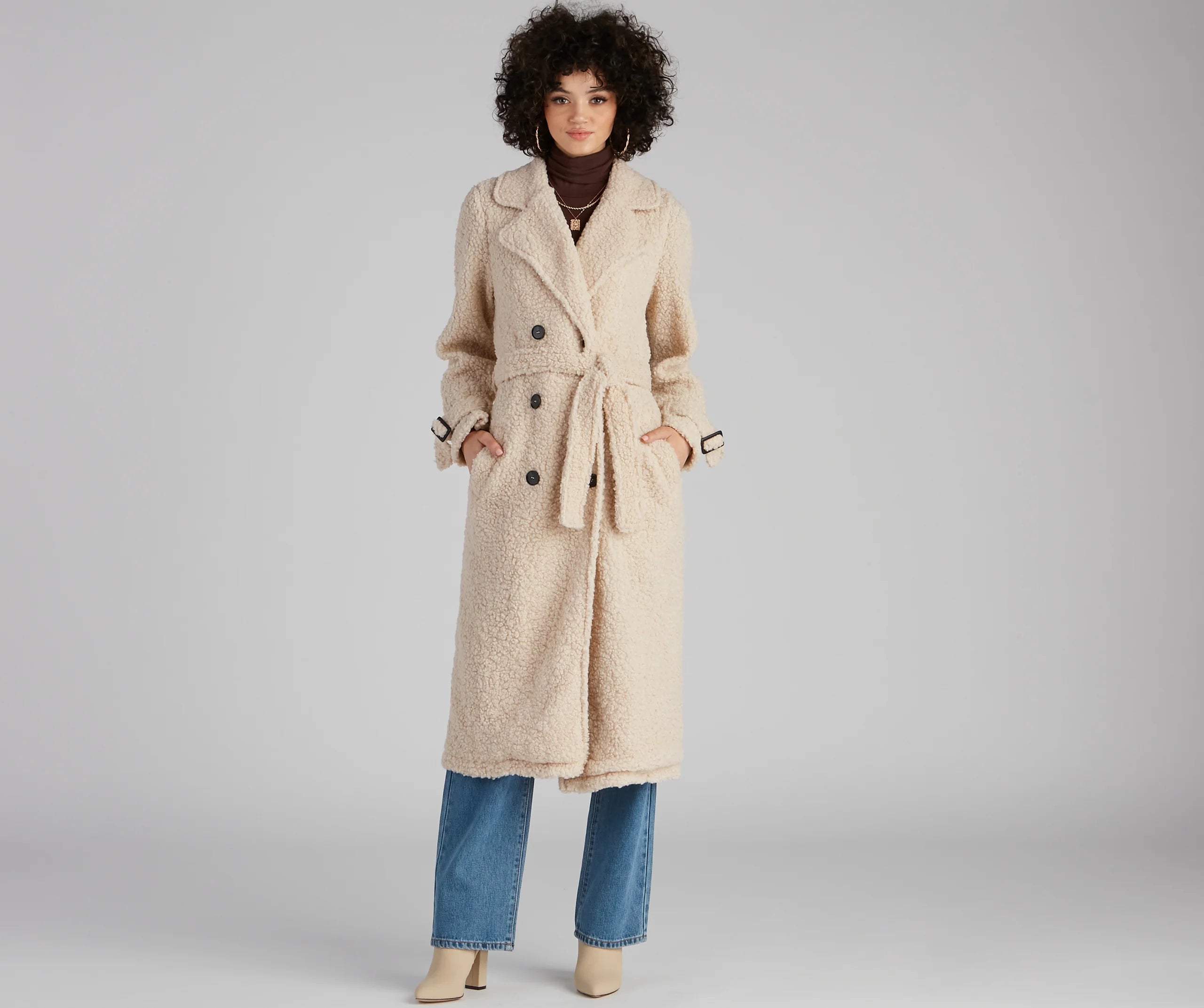 Lock down a chic look with a trench coat that brings the drama to your look! The trench features a collared neckline, long sleeves with an adjustable buckle cuff, a double-breast button closure, a tie waist belt with loops, hidden side pockets, and a below-the-knee length. The coat is composed of faux sherpa knit fabric that offers a relaxed fit with minimal stretch. Complete the look with a bodysuit, dark-wash denim, and booties.