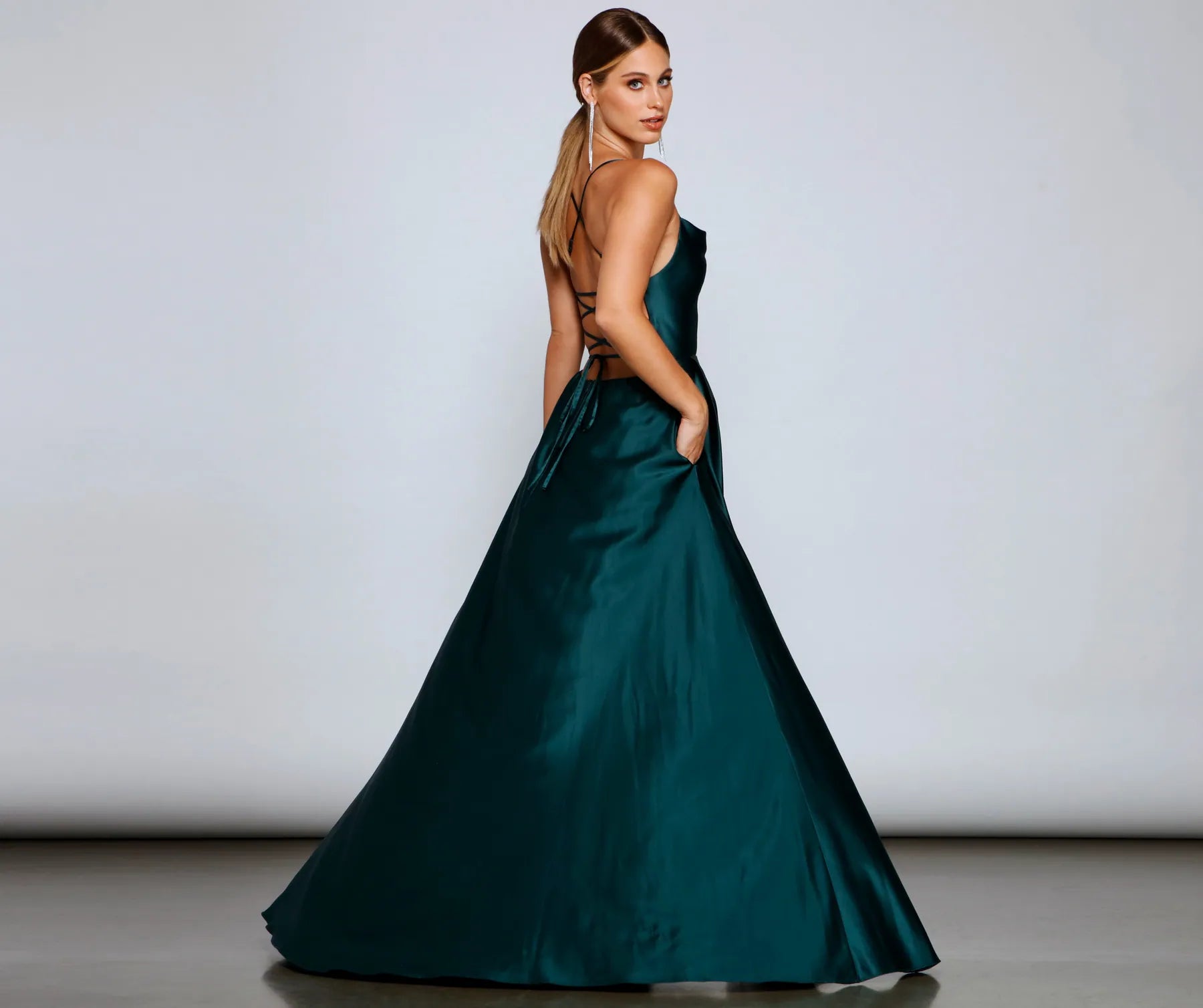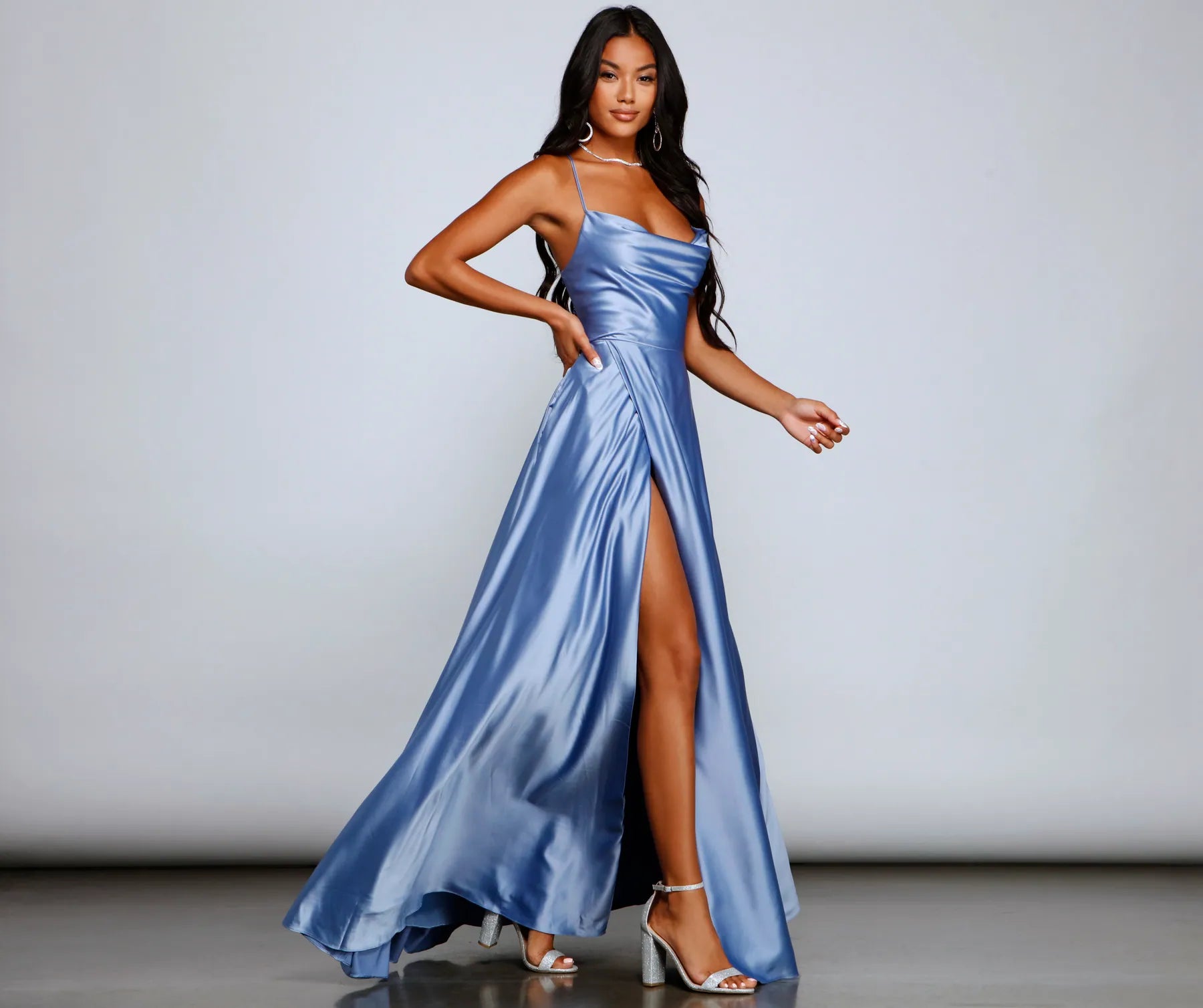 Lace-up in a glam formal dress that makes creates an enchanting entrance! Marixa features a sleeveless cowl neckline, adjustable spaghetti straps that cross at the back, a lace-up back, and a flowy A-line silhouette accented with hidden side pockets. The dress is composed of a lined satin fabric that offers a form hugging fit with minimal stretch. Complete look with rhinestone heels and an anklet.