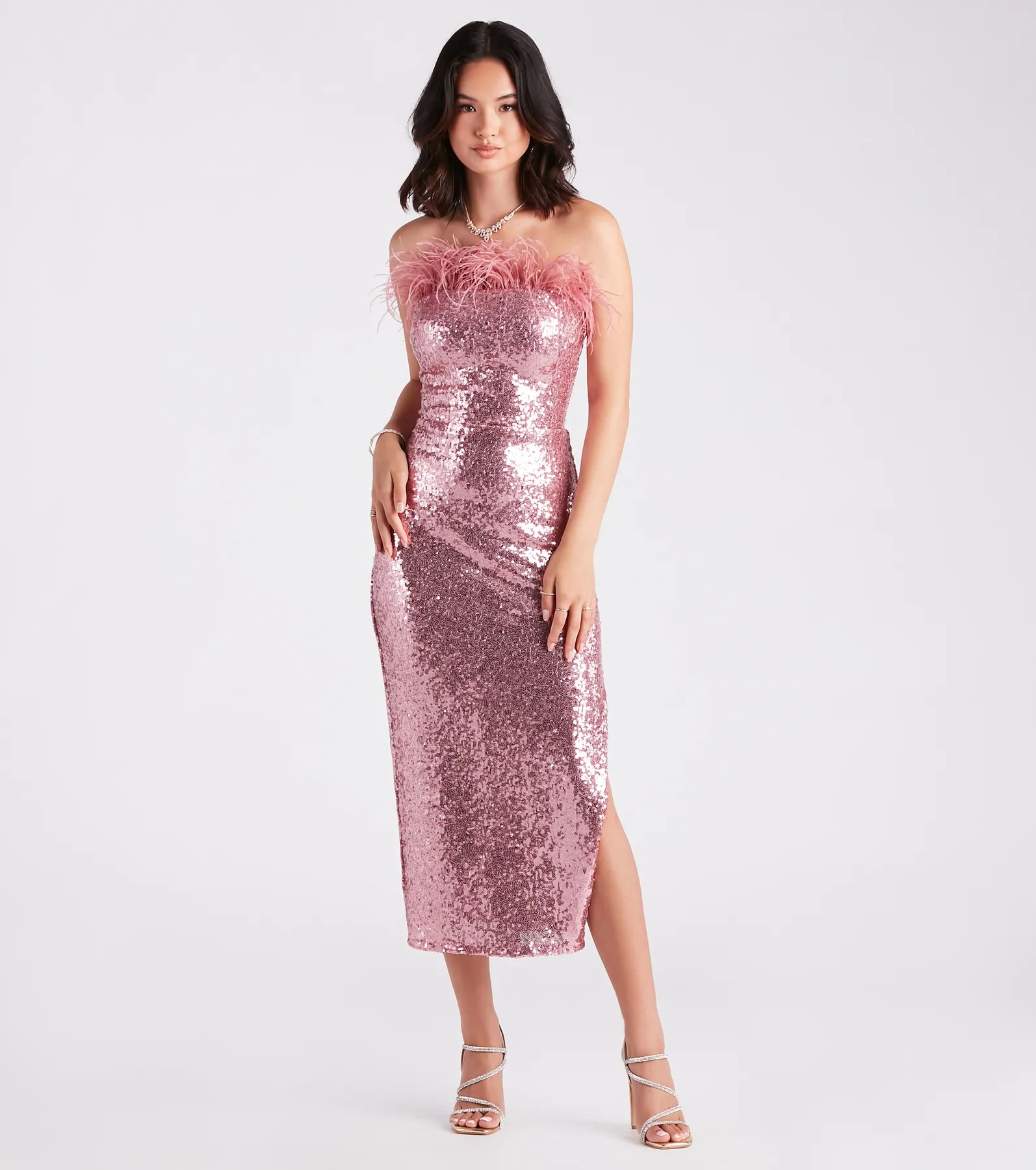 Dare to be divine in the Marlin formal sequin midi dress at black tie parties and celebrations! She features a strapless neckline with a front feathered trim, non-slip grip lining, a lightly padded bust, a flattering bodycon silhouette, a side slit accent, and a fitted midi-length hem. The formal midi dress is composed of a sequin-embellished mesh fabric that sparkles under the light and a stretchy knit lining. Complete the look with an elegant hair accessory for a glam style!