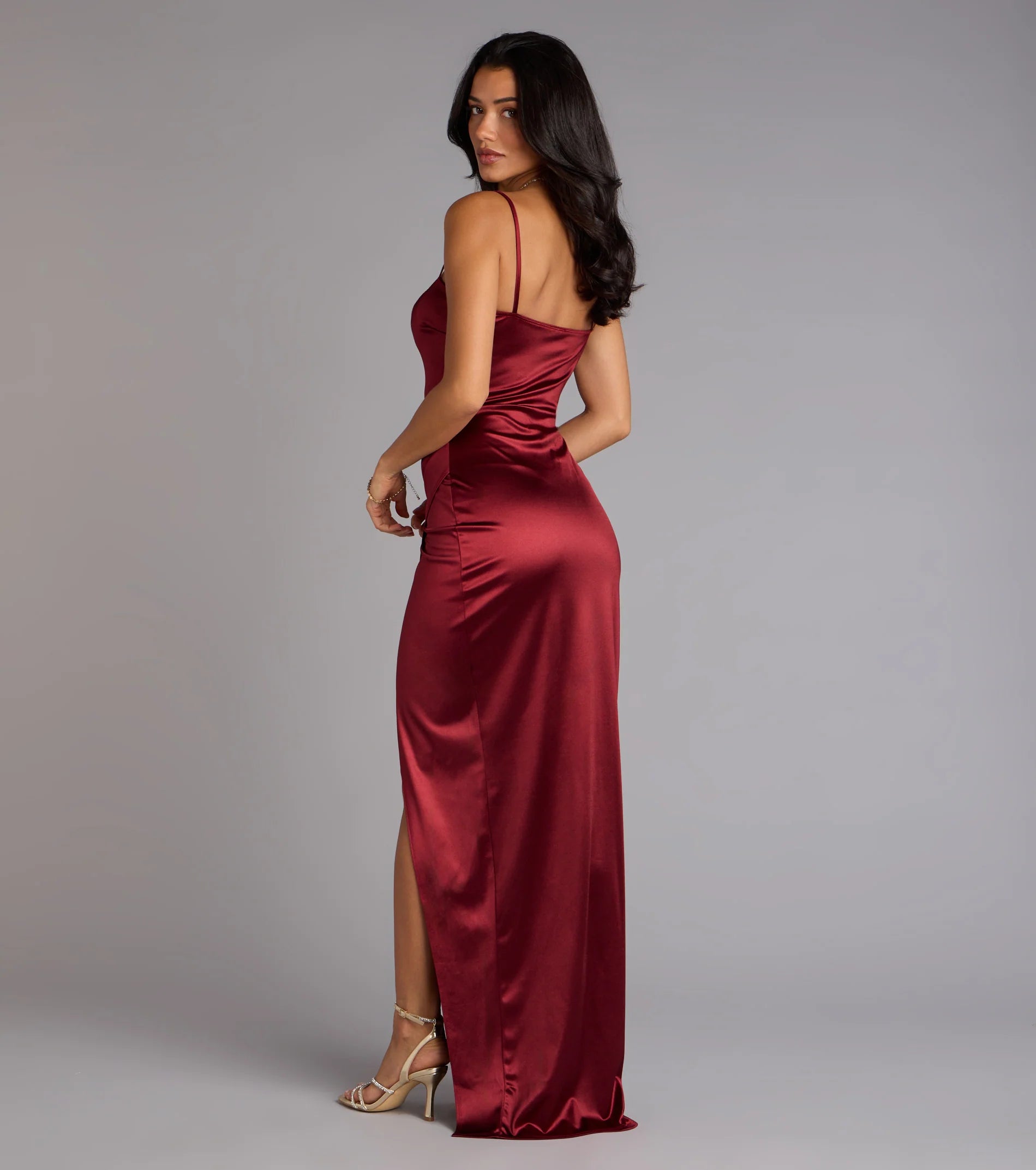Slip into the luxe vibes of Mayra! Designed to highlight your figure, this formal satin dress delivers a chic form-hugging fit and a high slit for effortless movement.