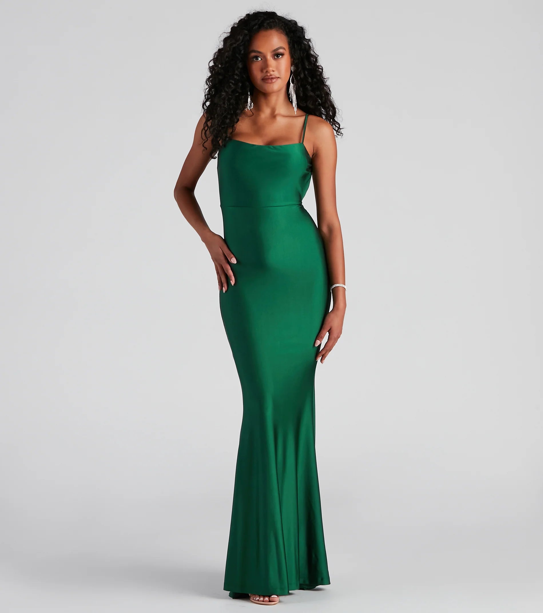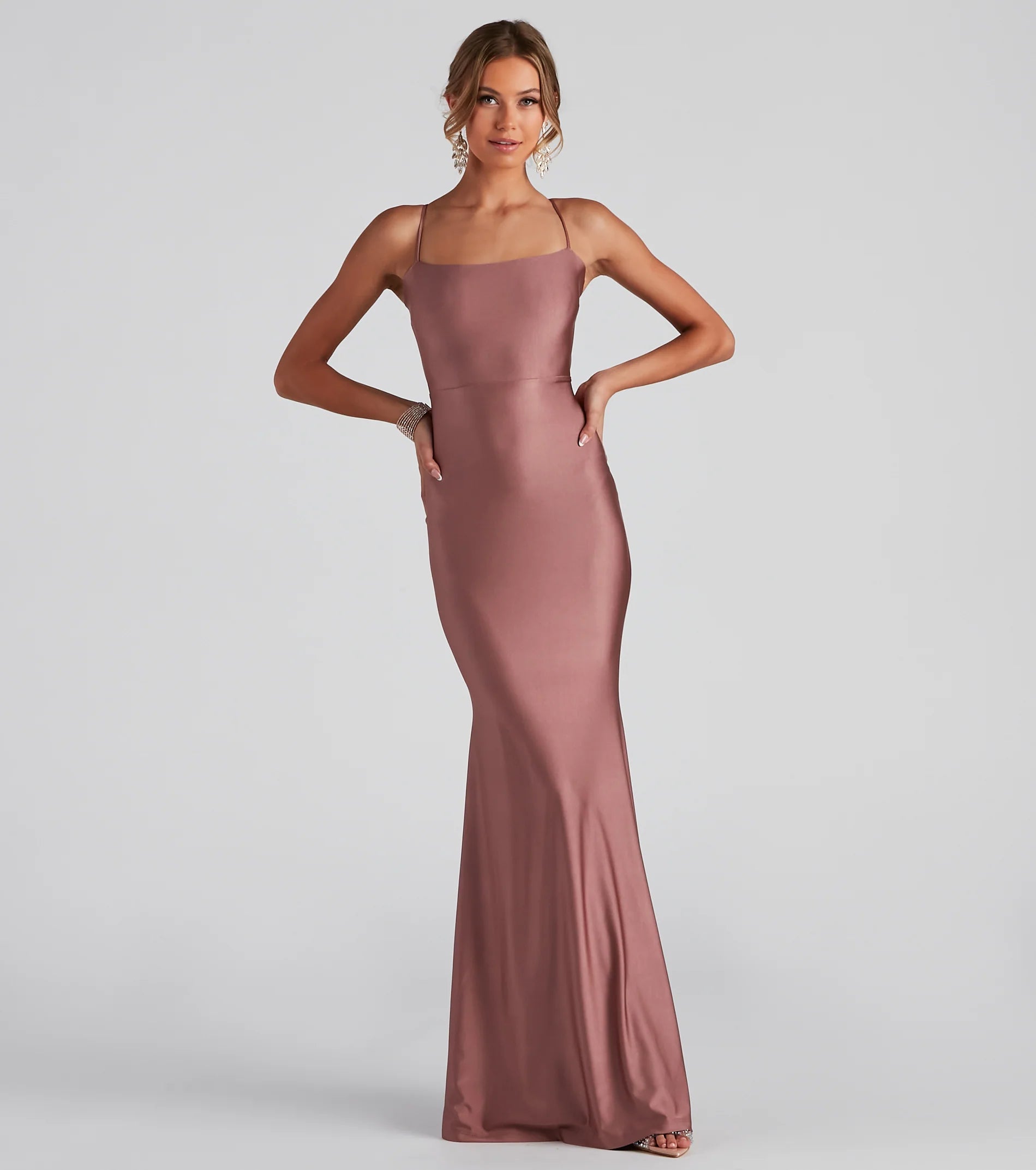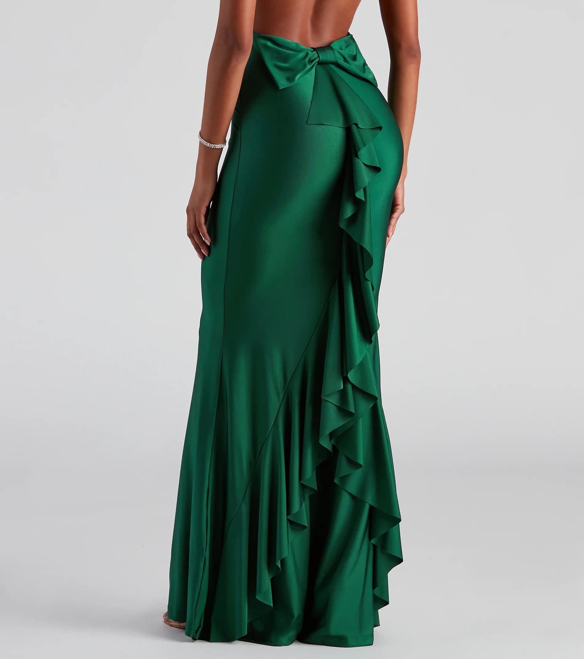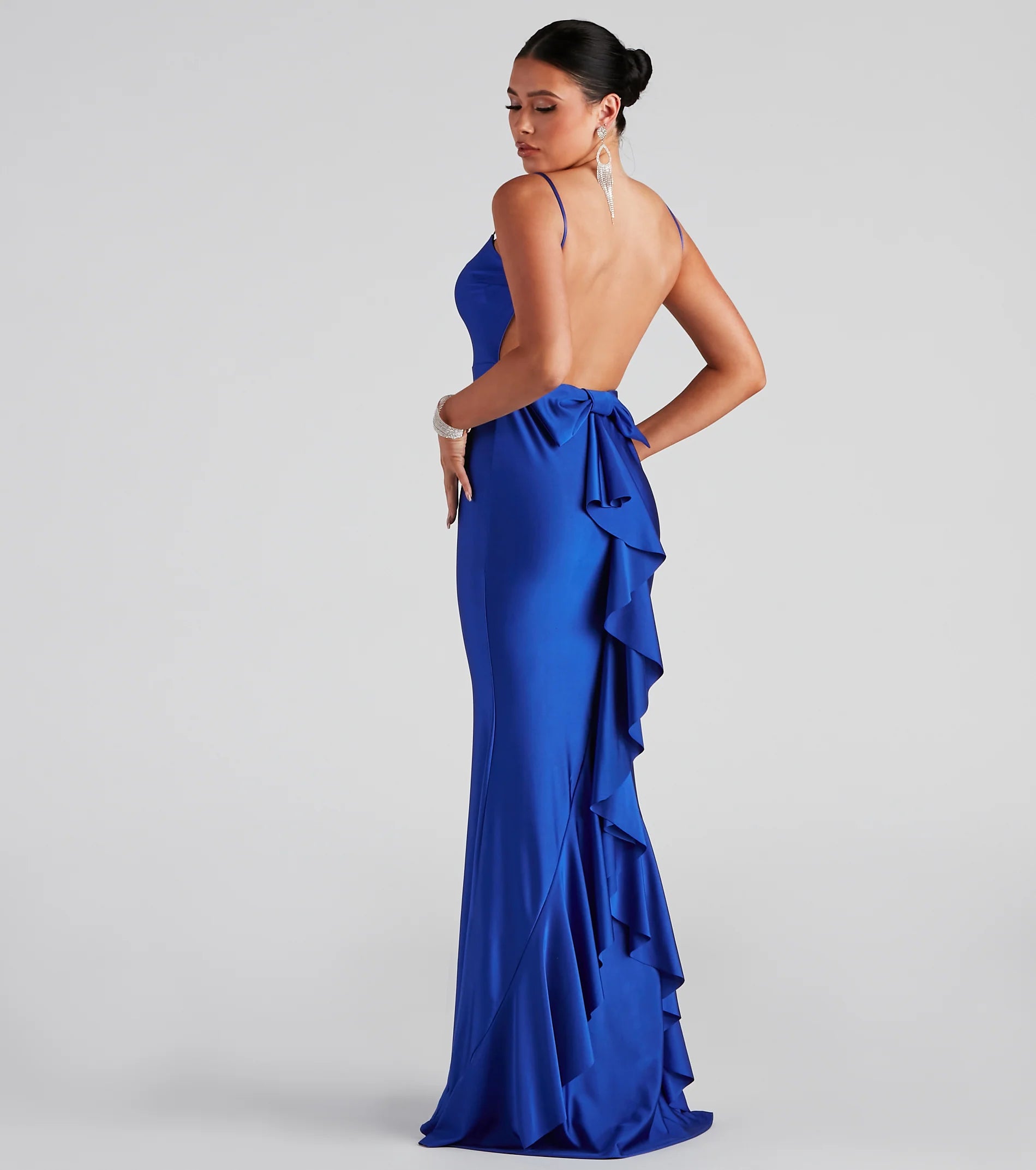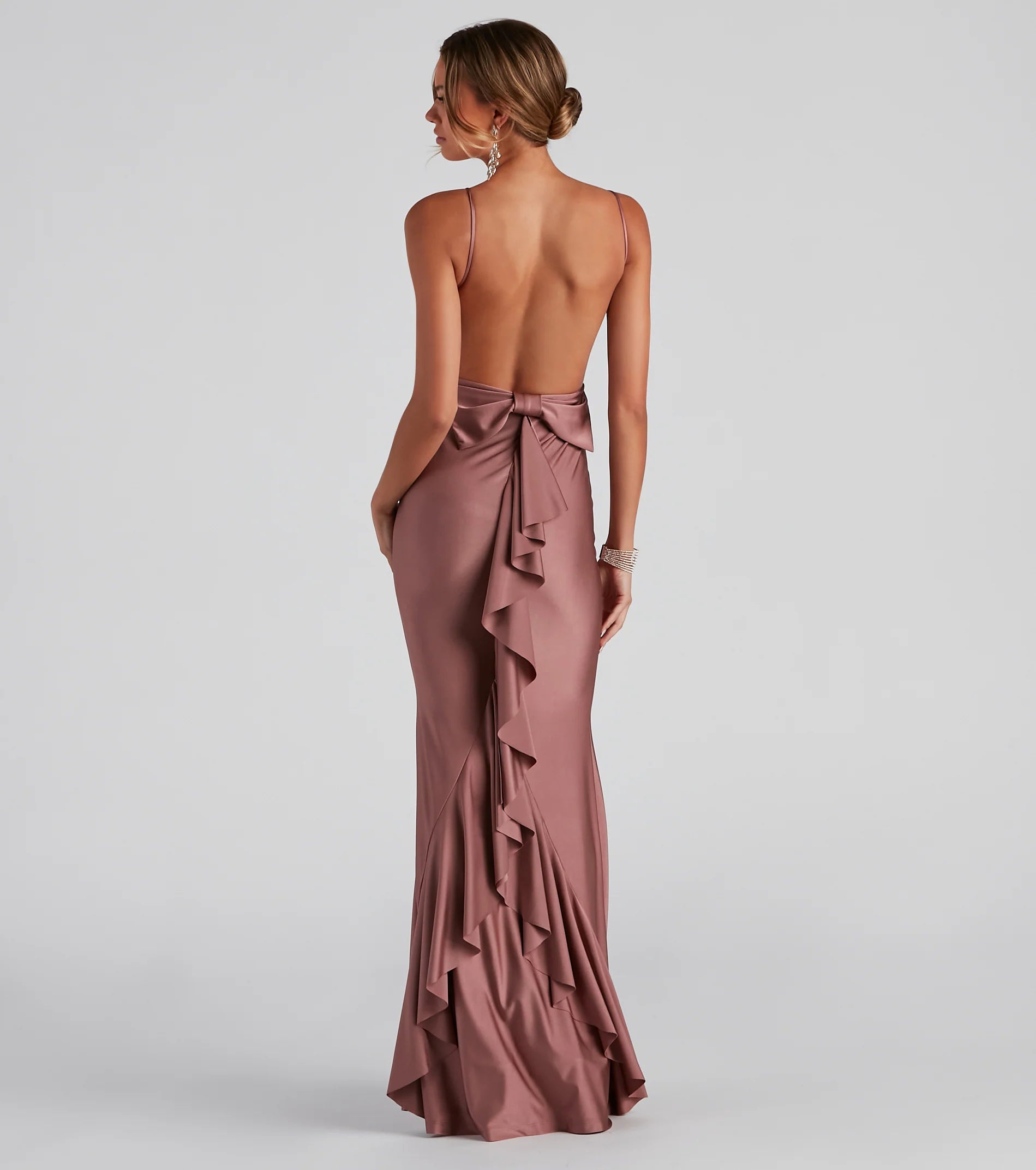 Make a head-turning impression with a formal dress that wows from the moment you enter the room! Meadow features a sleeveless square neckline, spaghetti straps, a daring open back, a fab bow at the lower back that leads to a ruffled trim, and a mermaid silhouette. The dress is composed of a smooth knit fabric that offers a form-hugging fit with a moderate stretch. Complete look with rhinestone heels and a rhinestone clutch.