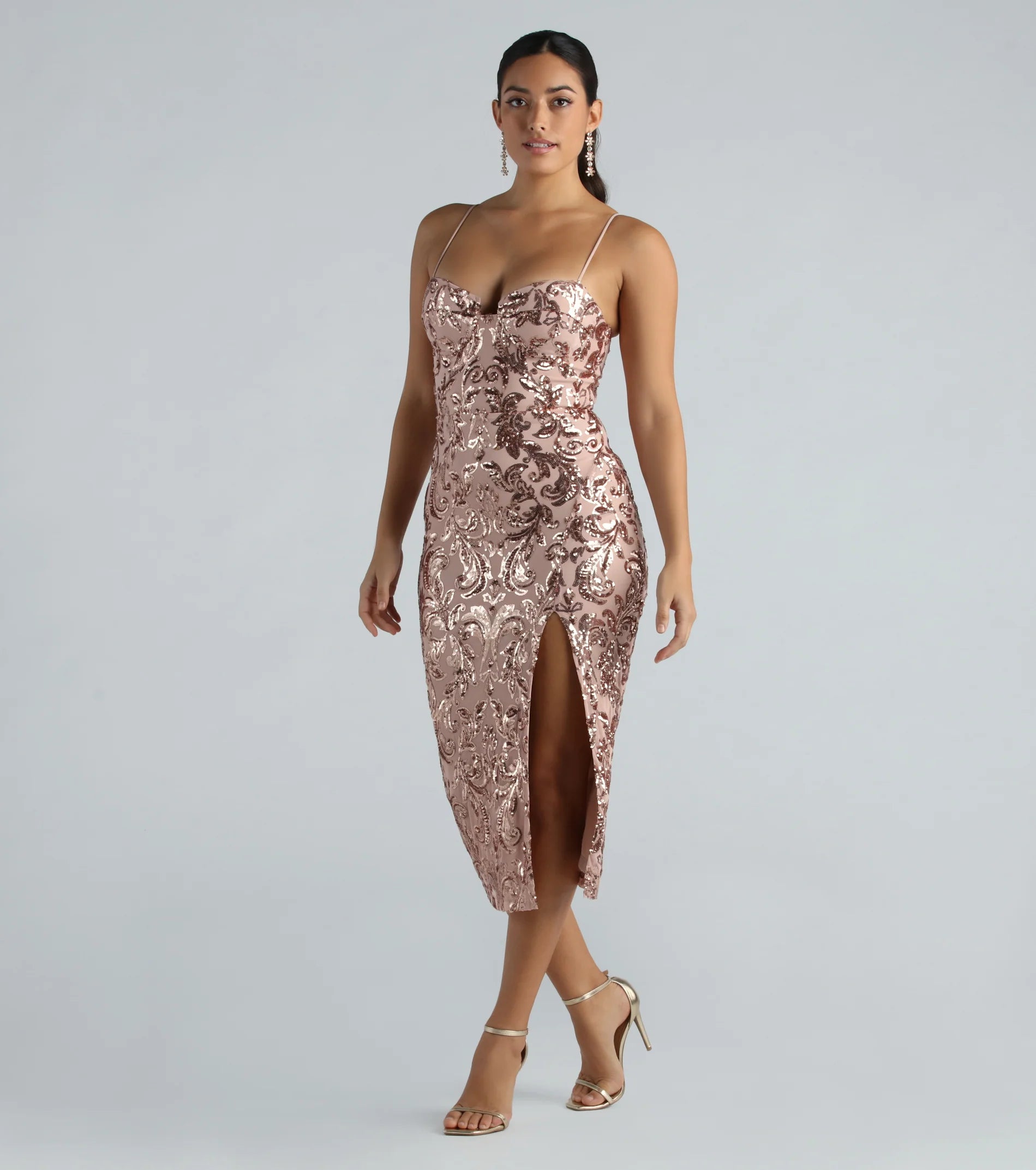 Radiate sexy elegance in the Meilani formal midi dress perfect for serving major looks as a wedding guest or attending a banquet dinner! She features a sweetheart neckline with a square cutout, adjustable spaghetti straps, a padded and underwire bust, a bodycon silhouette that hugs your gorgeous curves, and a flattering front slit and midi-length hem. The formal dress is designed with a sparkly sequin-scroll pattern on mesh fabric with a stretchy knit lining. Complete the look with fringe earrings and silver heels!