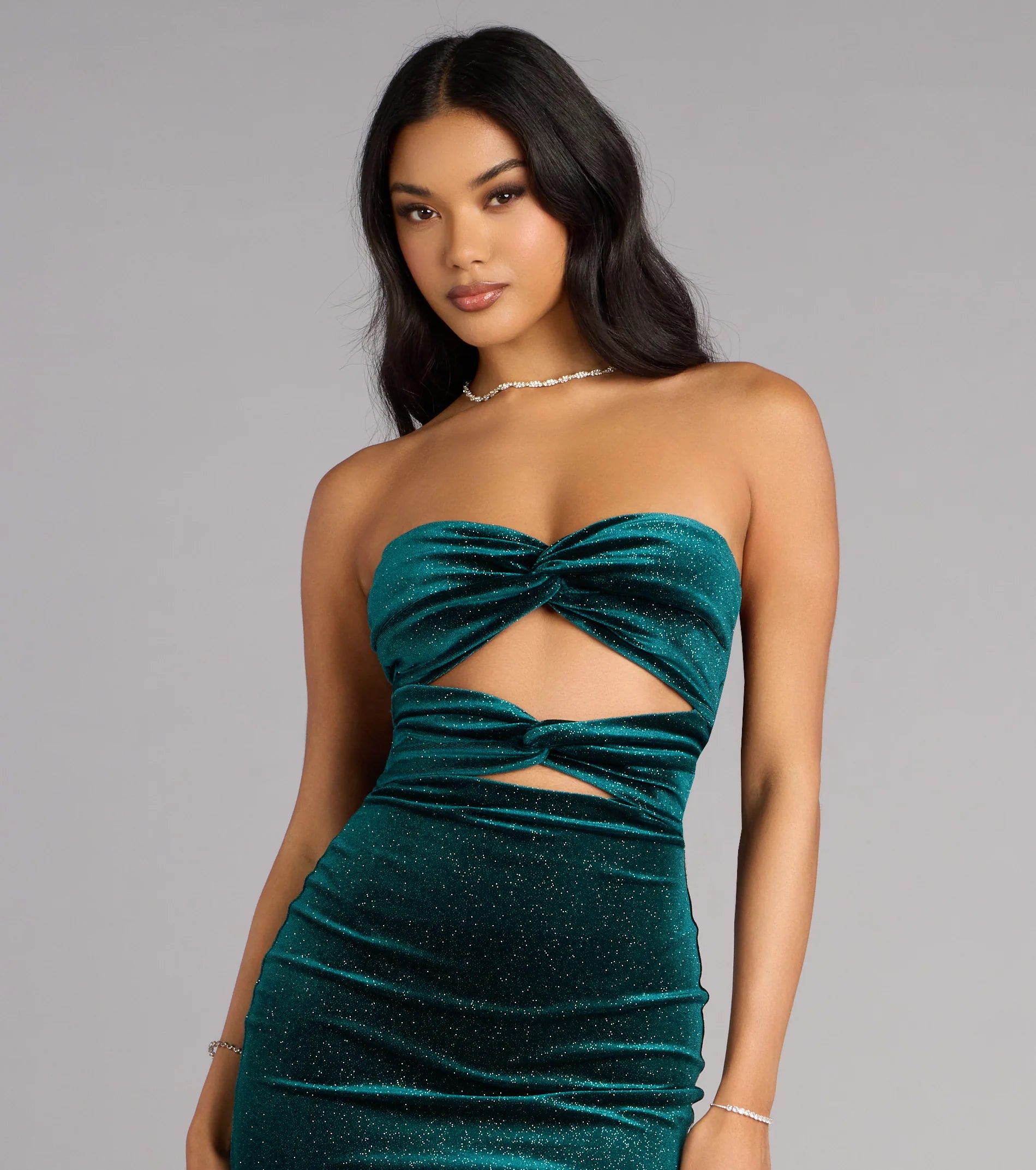 All eyes on you—that’s the assignment. This glitter velvet mini dress shines with bold cutouts and a body-hugging fit that feels made for your next night out.