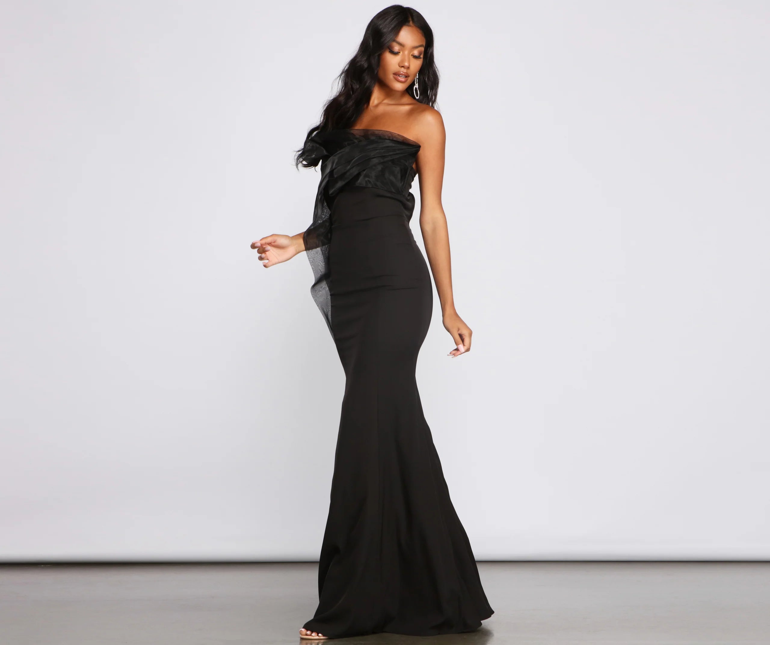 Radiate elegance with a formal dress that truly captivates. Milena features an off-the-shoulder neckline, a pleated taffeta accent at the bodice, and a curve-hugging mermaid silhouette. The dress is composed of a lined crepe fabric that offers a form hugging fit with a moderate stretch. Complete look with a rhinestone bracelet and heels.