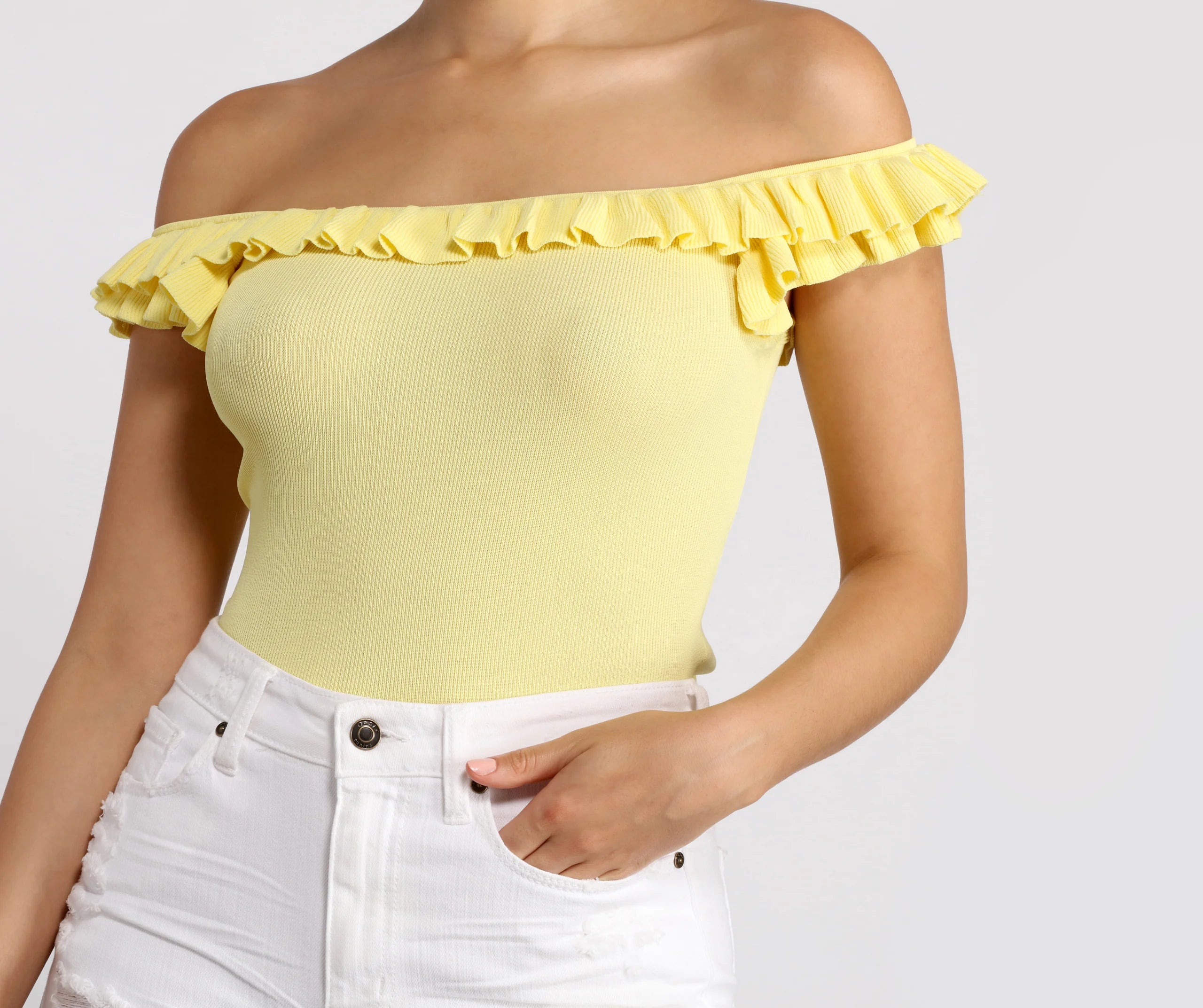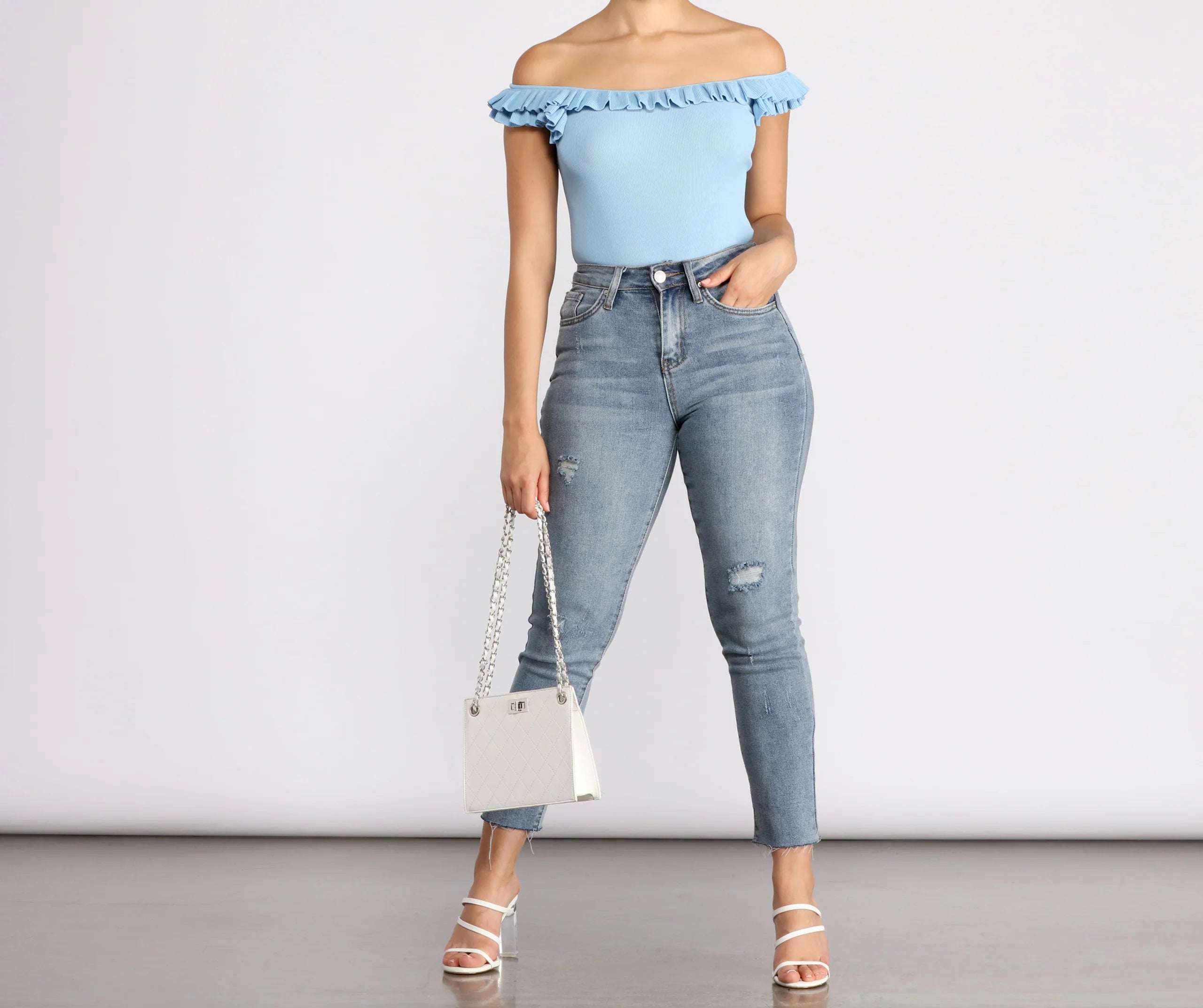 Your wardrobe is missing some ruffles! Style this pretty top with denim, heels and a trendy mini bag.