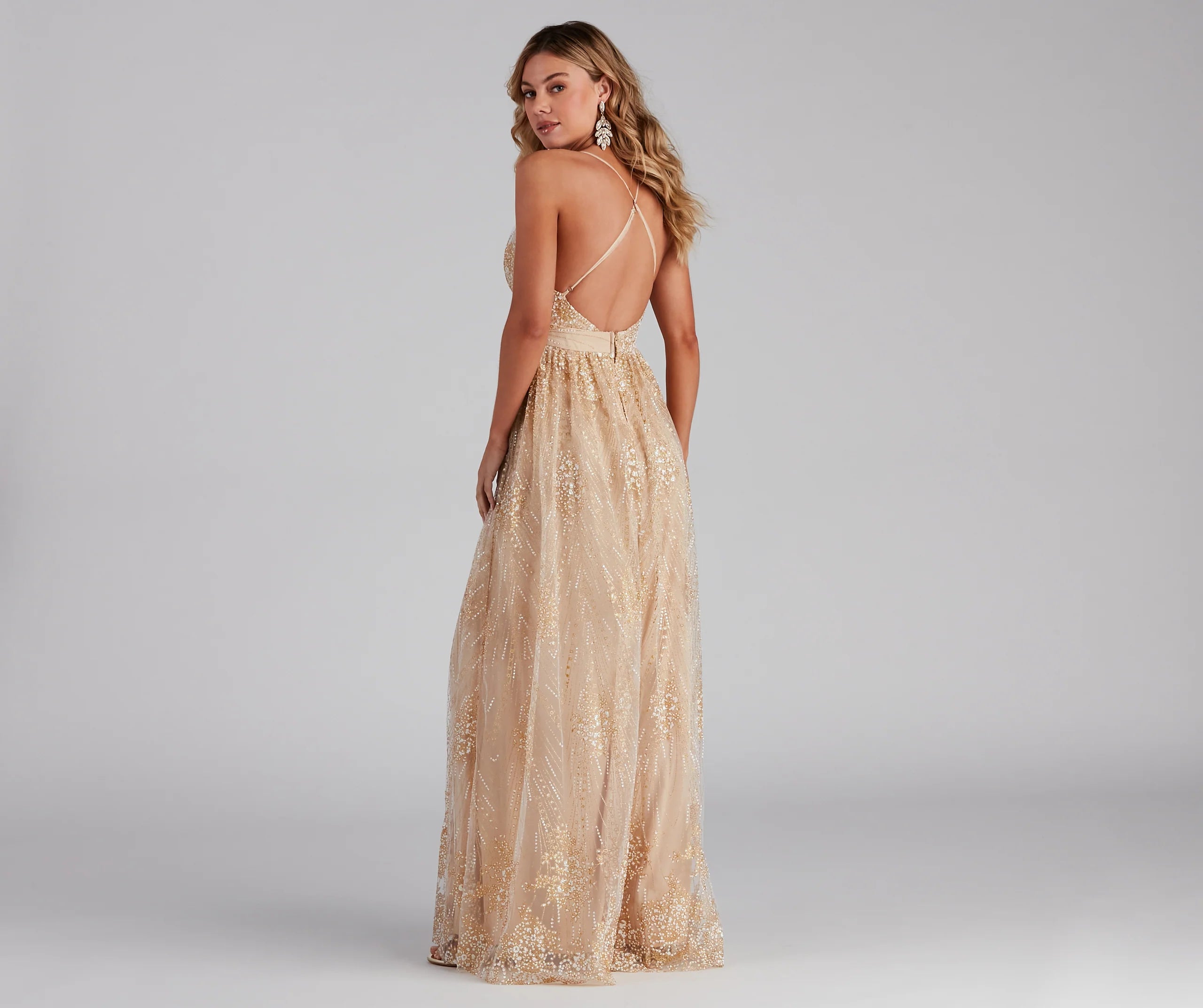 Take the plunge into glamour as you stun in our breathtaking Mona dress! She features a sleeveless bodice, a plunging V neckline with pleated dealing, and sheer adjustable spaghetti straps that cross at the back. Her slim fit waist leads to a sweeping A-line silhouette. She stands out with her glitter accents and caviar beaded detailing set in a romantic pattern. The dress is composed of a lined tulle fabric that offers a relaxed fit with minimal stretch. The knit lining includes two high slits to reveal a hint of skin under the semi-sheer tulle fabric. Complete your gorgeous look with rhinestone duster earrings and a new pair of heels.