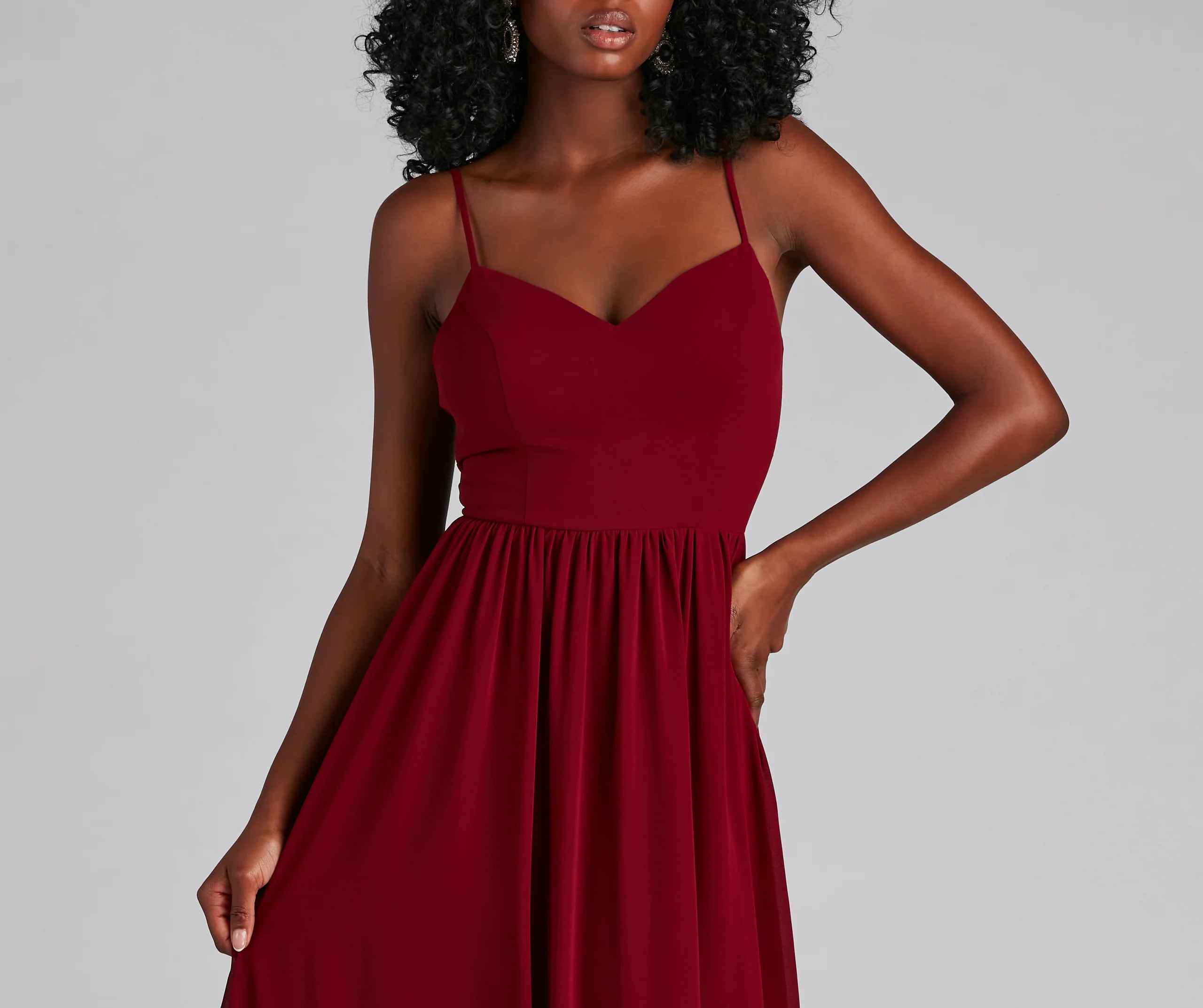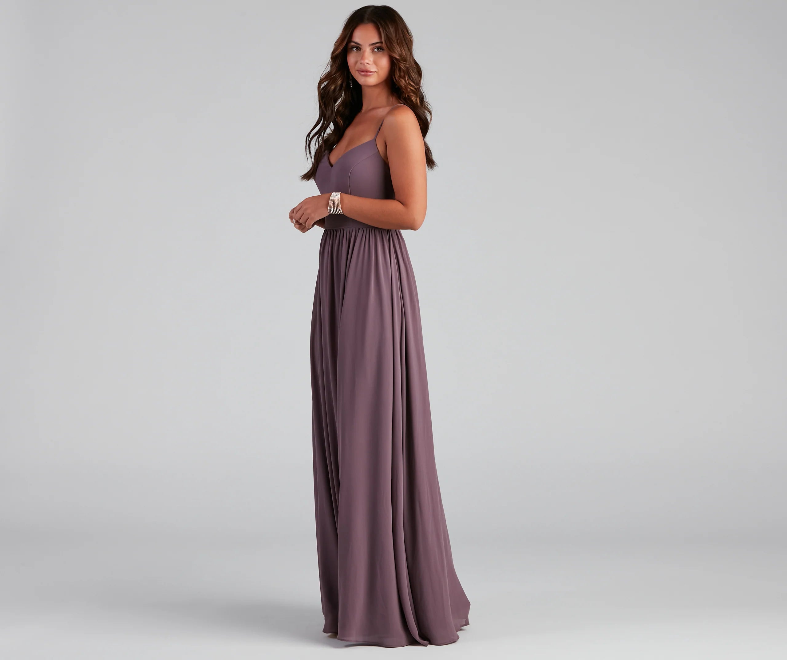 This prom season, showcase your effortless beauty in the floor-sweeping Mya formal dress! She features a sleeveless sweetheart neckline with a padded bust, adjustable spaghetti straps for a customized fit, and a chic low-back design. Her high waist seam flows out to a floor-length A-line silhouette with pretty pleated detailing. The sheer chiffon fabric includes a full woven lining. Style this dress with a sparkly embellished cuff for the perfect prom look.