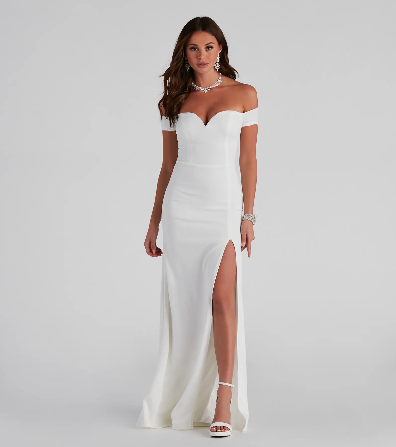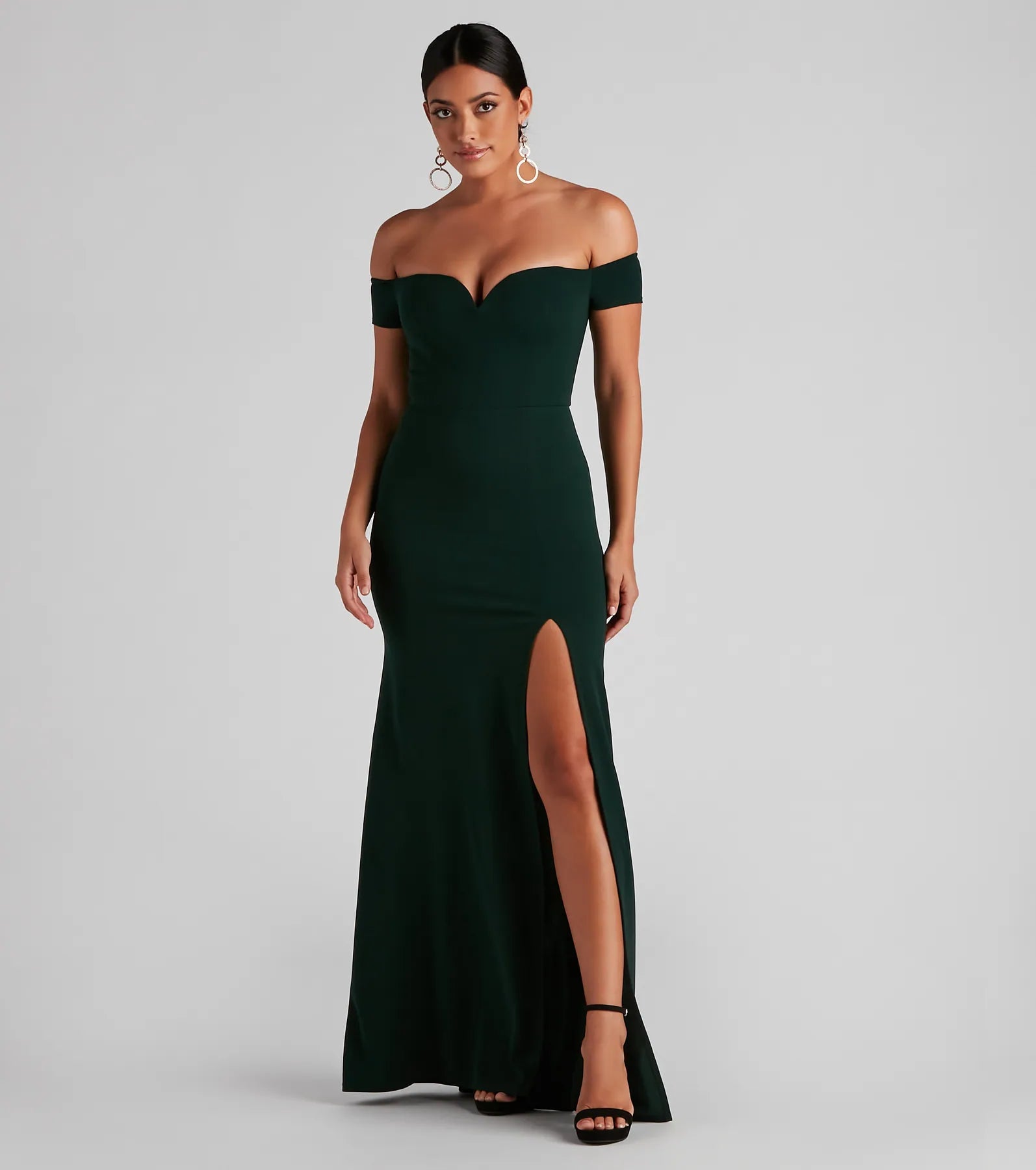 The Myra formal dress brings all the luxe, elevating your evening with timeless elegance! The long formal dress features a sweetheart neck with a built-in padded bust that offers support to her flattering, off-the-shoulder neckline with short-sleeve cuffs. The flattering, relaxed fit bodice leads to a curve-hugging floor-length mermaid silhouette that is accented with a sexy high side slit. Complete your captivating formal outfit with dazzling duster earrings and open-toe heels.