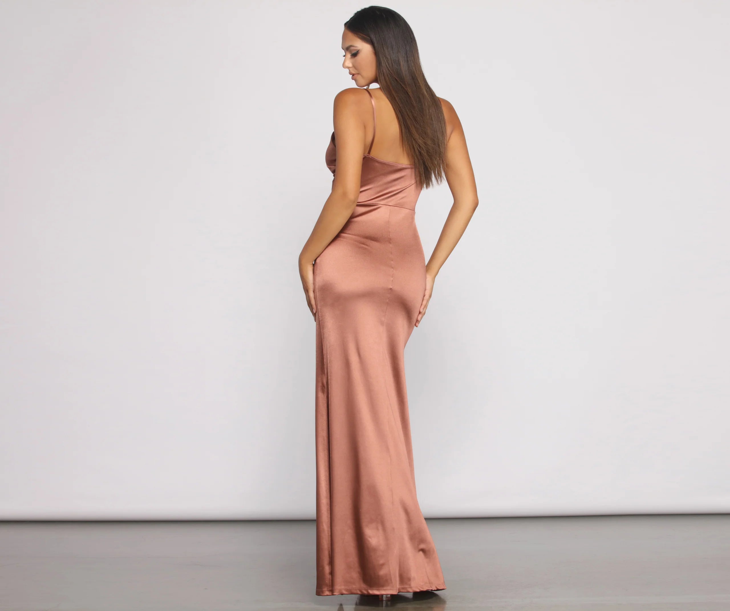 Keep it sleek in our Nikita dress that brings the elegance to your formal evening. She features a plunging sleeveless wrap V-neckline, padded cups that eliminate the need for a bra, sleek spaghetti straps, a ruched silhouette that enhances curves, and a floor-length silhouette with a dramatic asymmetrical high slit. Complete your look with rhinestone earrings and clear heels.