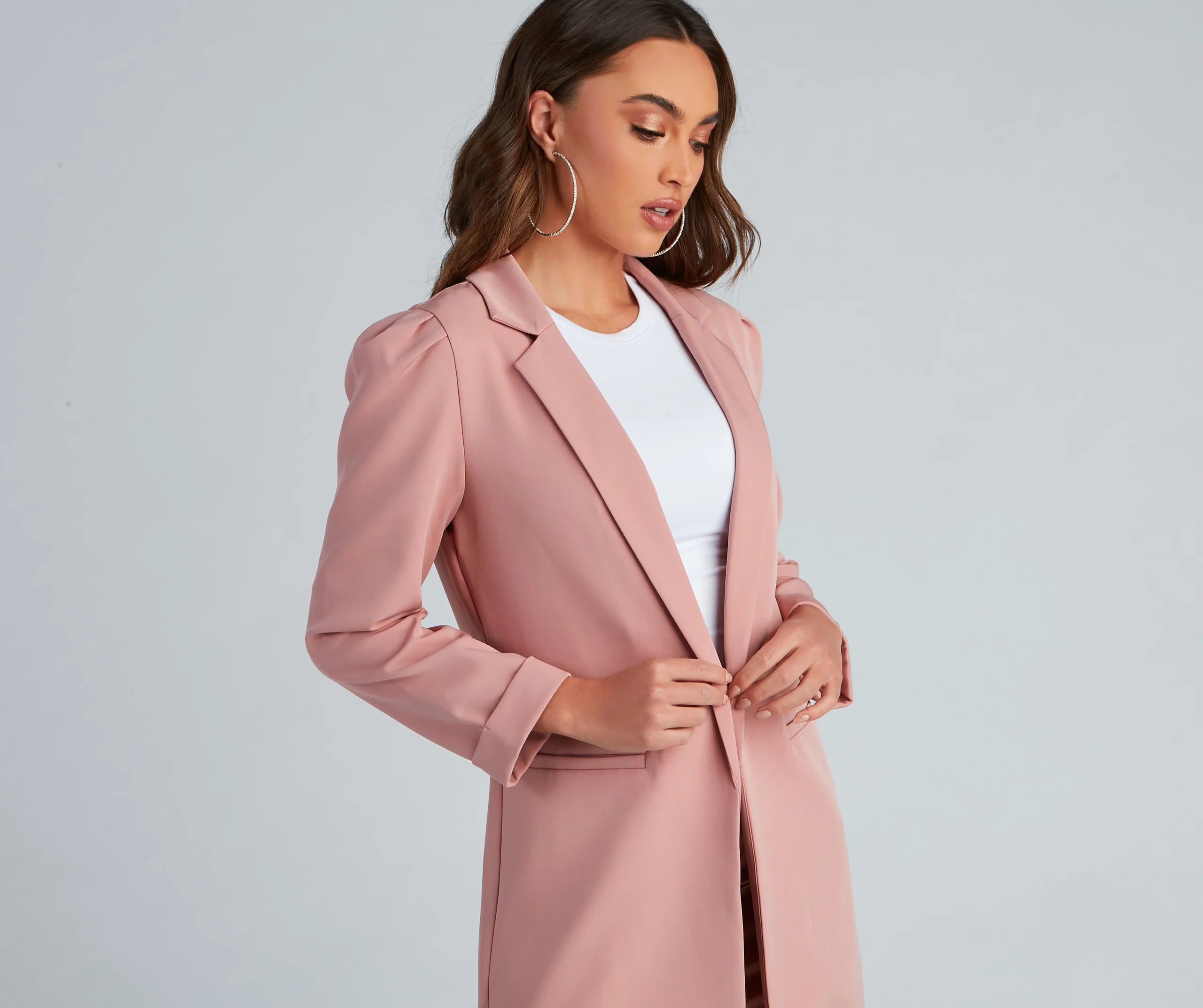 The perfect blazer for that nine-to-five life! It features long sleeves with puff shoulders and cuffed hems, a collared neckline, faux side pockets, and a long line hem. The blazer is composed of smooth fabric with no stretch. Complete the look with knee-high boots.