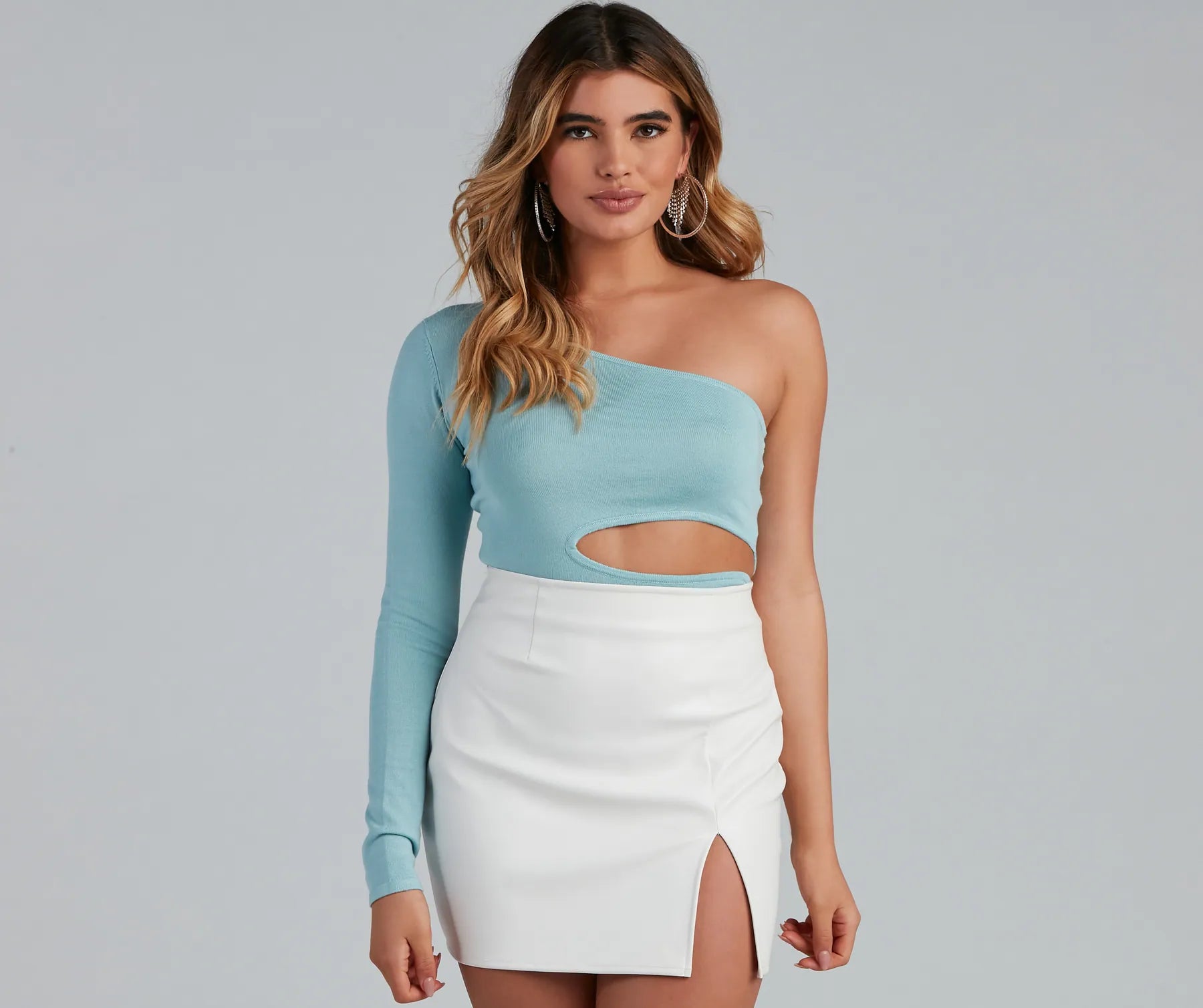 This alluring one-shoulder top is perf for a night out with the girls! It features a long sleeve and a waist cutout for a show of skin on the cropped hem. Composed of a nylon-knit fabric with a moderate stretch. Style with faux leather pants and heels.