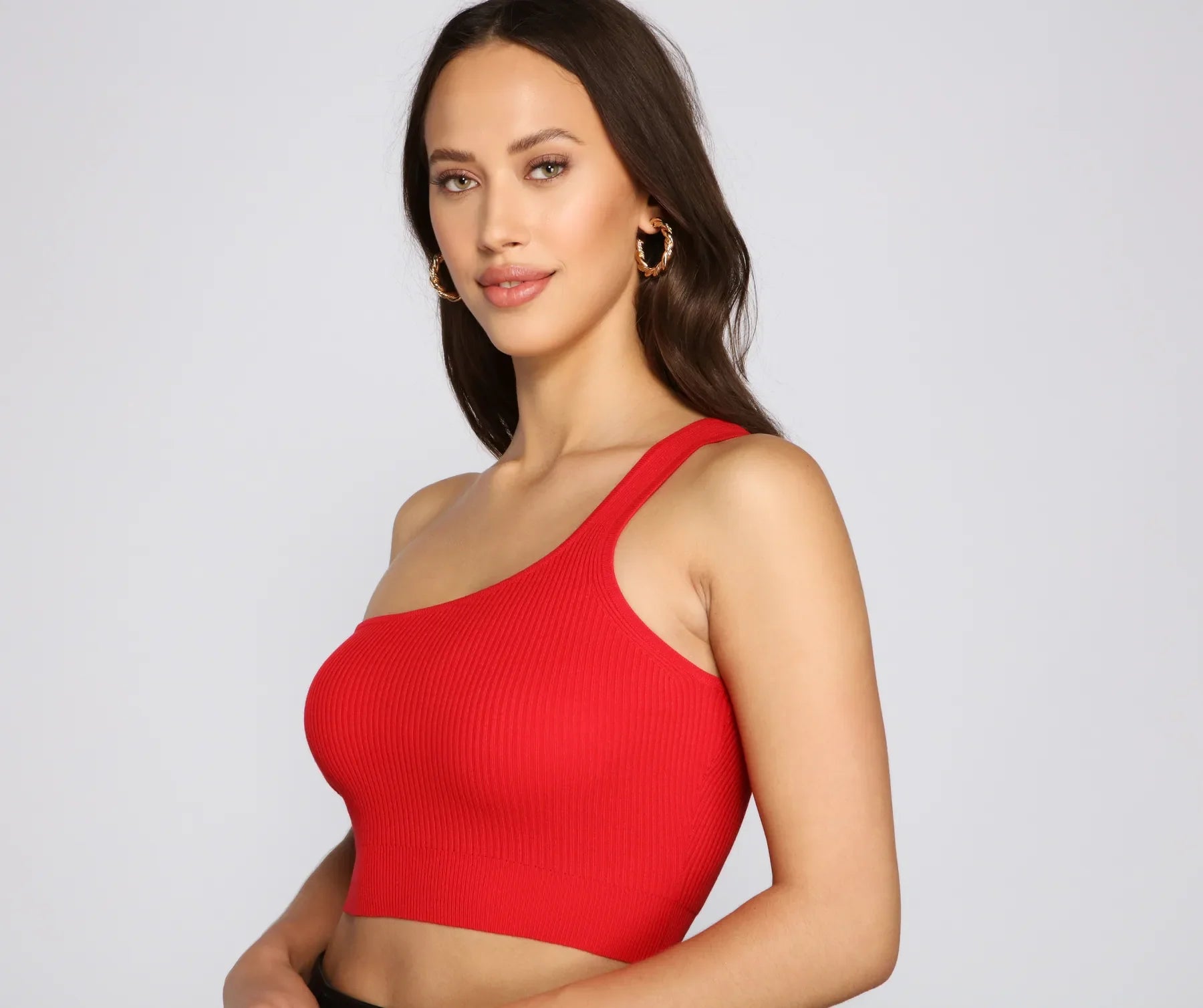 Keep it effortlessly chic with a cute crop top! The crop top features a one-shoulder neckline, supportive-tank shoulder strap, and a cropped hem. The top is composed of a ribbed knit fabric that offers a form hugging fit with a moderate stretch. Complete look with a high waist skirt.