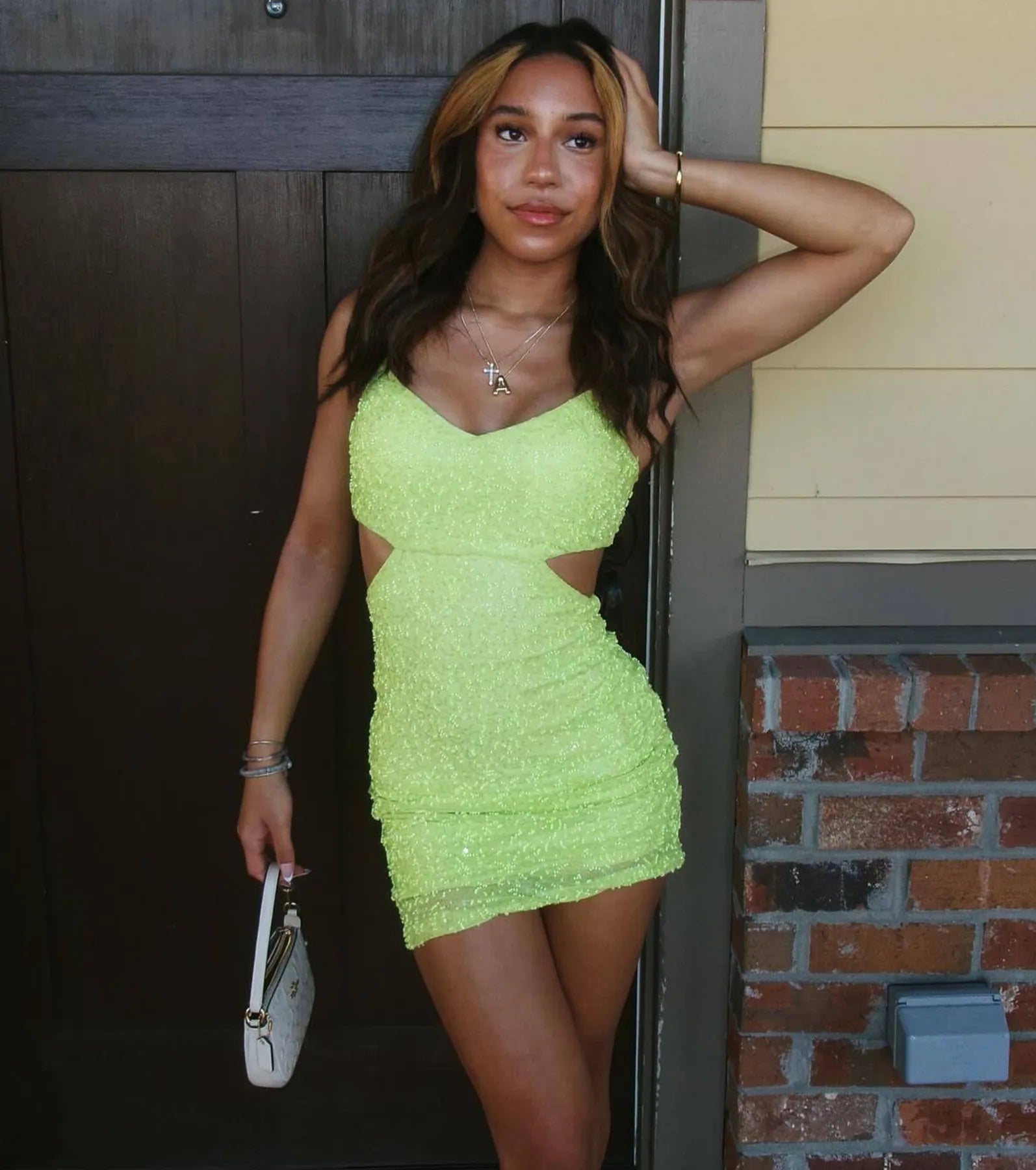 Bring a bold and sexy look in the Penny cutout mini dress to bachelorettes and parties! The mini dress boasts a sultry V-neckline and bodycon silhouette covered in sequins and beaded embroidery. Pair with platform heels.