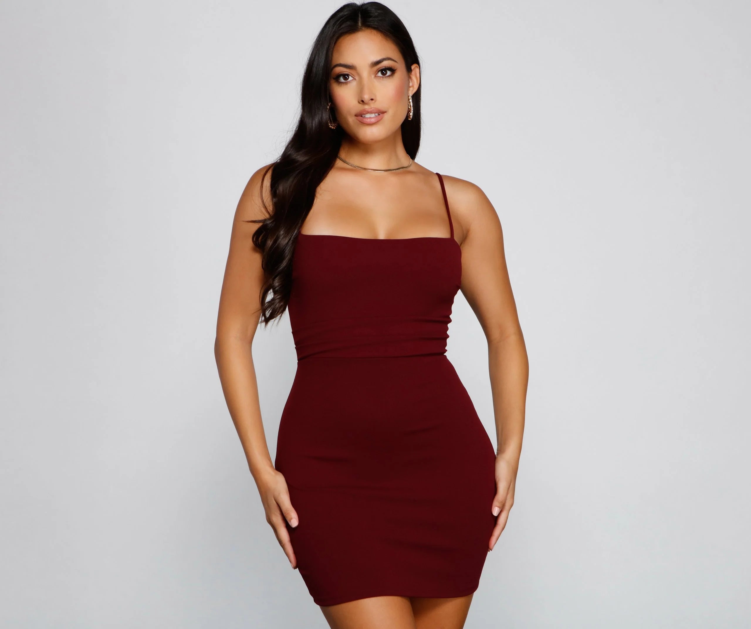 Play it cool with this fab mini dress that is part casual, part chic! The dress features a sleeveless square neckline, spaghetti straps, pleating at the bodice, and a mini-length silhouette. The dress is composed of a crepe fabric that offers a form hugging fit with a moderate stretch. Complete look with mules and a clutch.