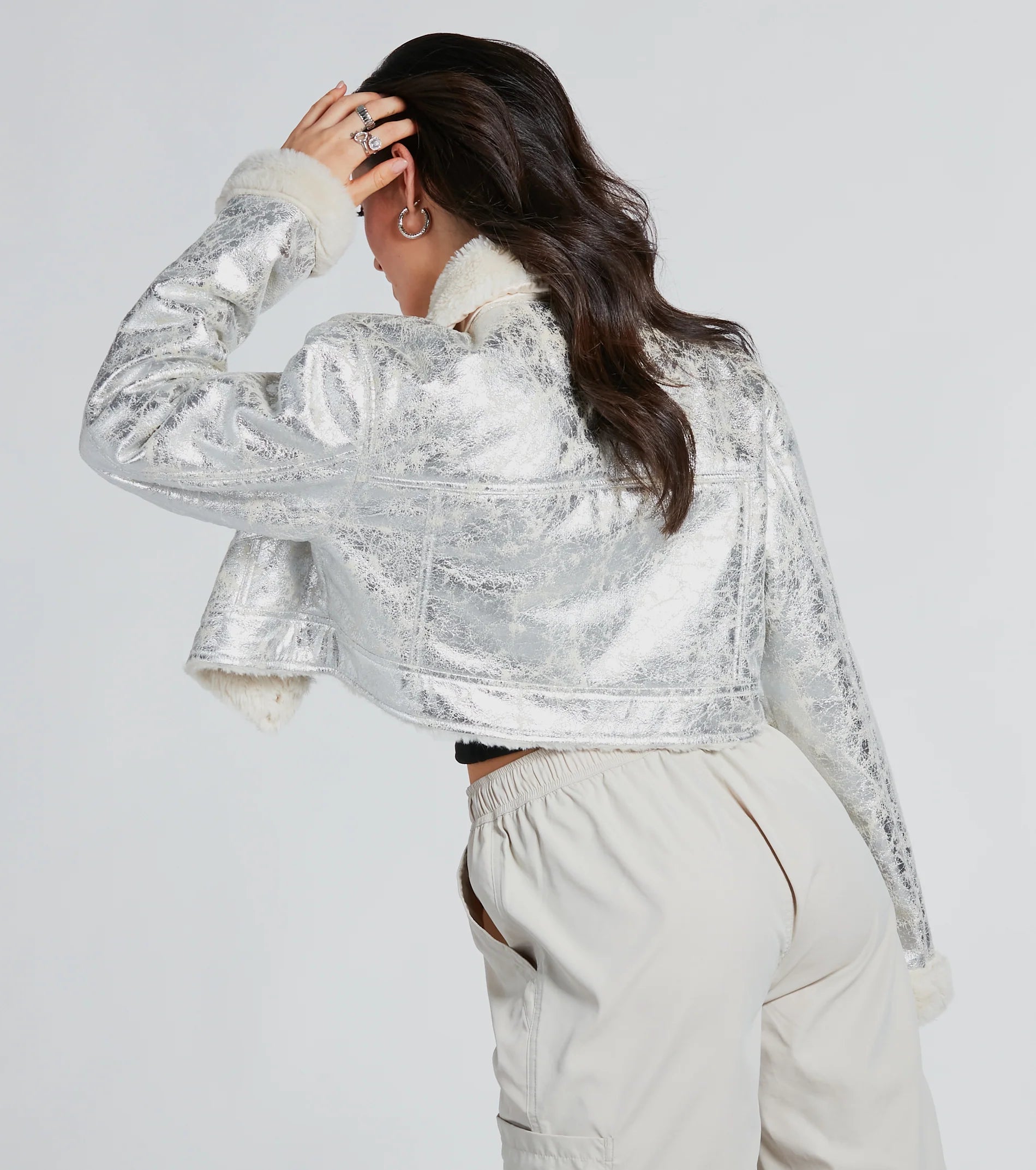 Layer on this metallic trucker jacket to let your inner pop diva shine! It features faux fur-lined long sleeves, a faux fur collar with satin lining, snap-button down front closures, flap satin-lined pockets, and a cropped hem. Complete the look with a chic faux leather skirt for a concert or holiday party!