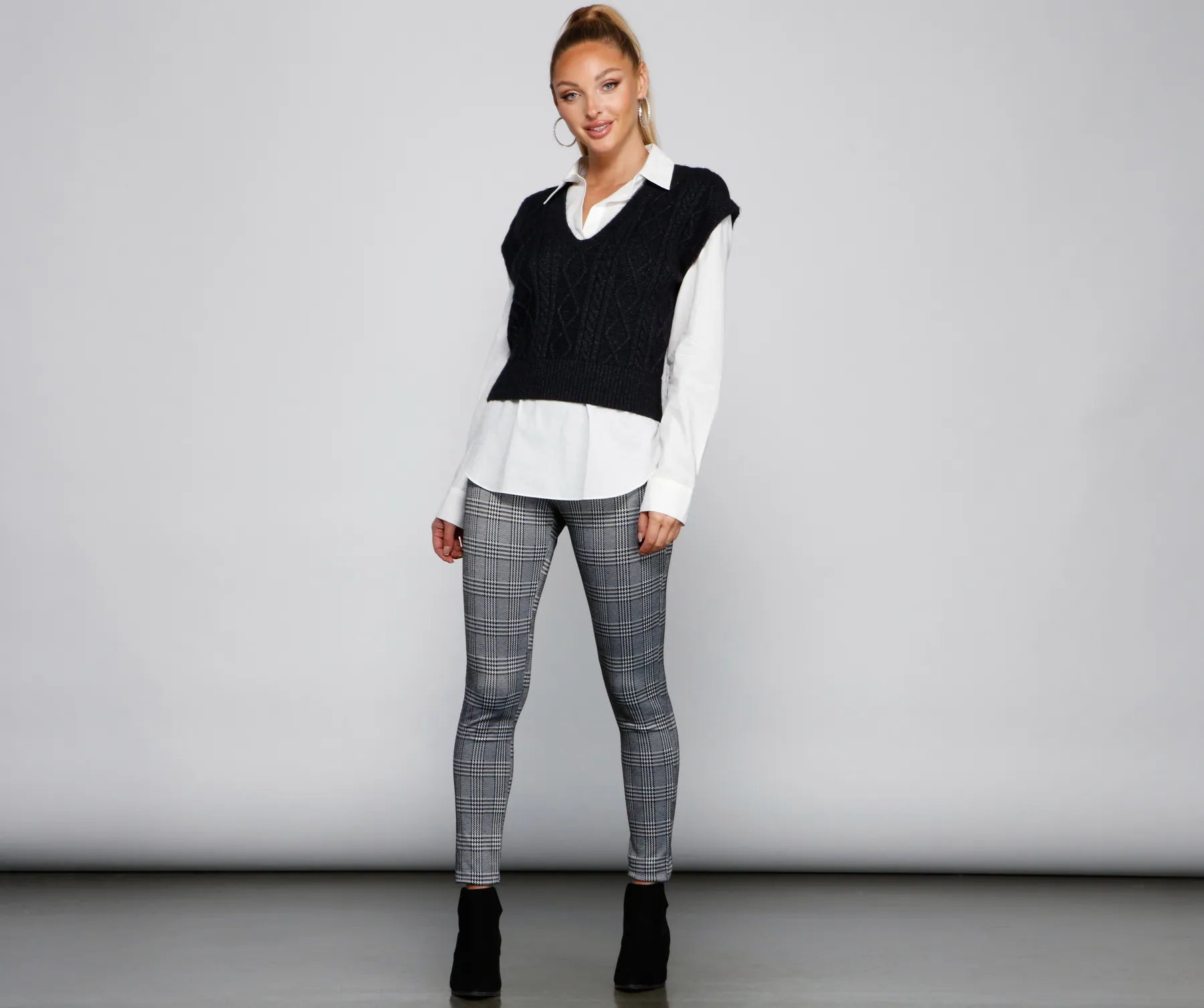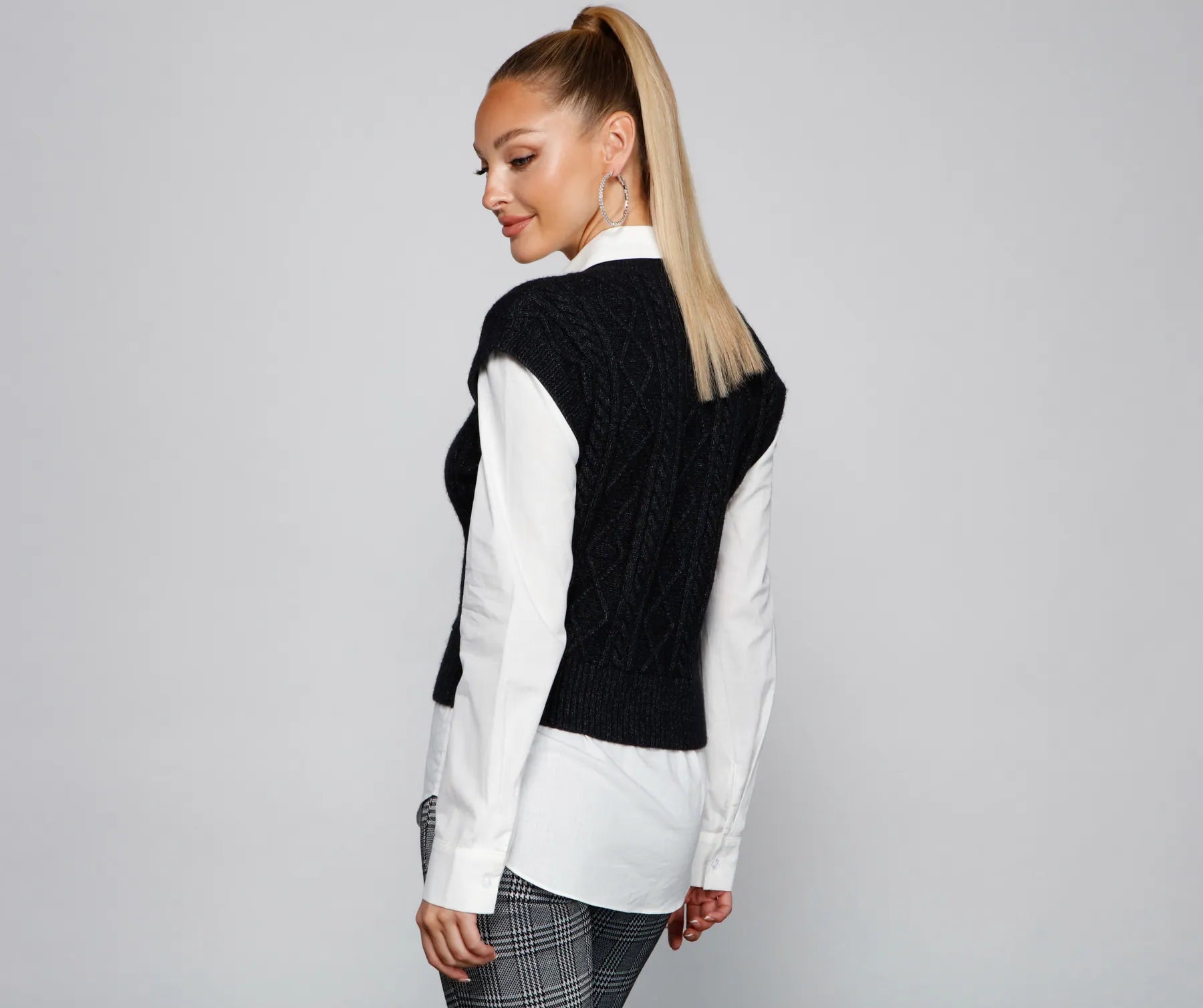 Showcase that preppy-chic vibe that is trending this fall with this adorable tunic. It features a layered design with a collared V-neckline, long sleeves with single-button details, a sweater vest overlay with a cable knit pattern, and a long hem to create the illusion of a layered look. Style this tunic with black leggings and booties.
