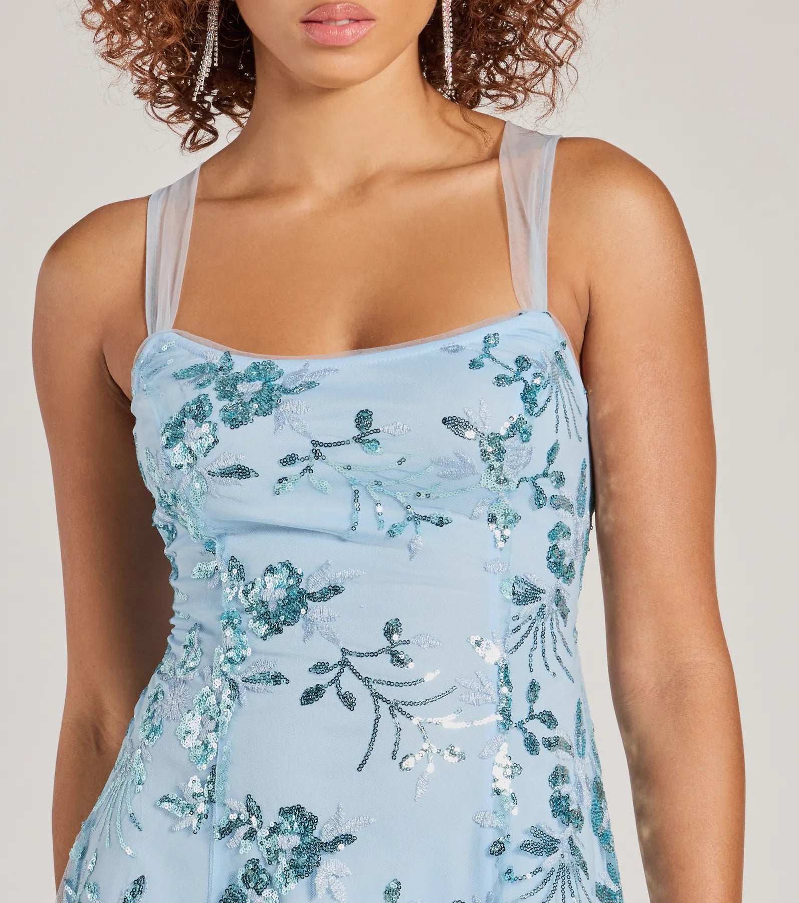 Radiate pretty elegance in this sleeveless mini dress featuring tulle shoulder straps that shape the striking lace-up back design and a flattering A-line silhouette. The sheer mesh fabric is decorated with a floral sequin embellished pattern perfect for a school dance or birthday.