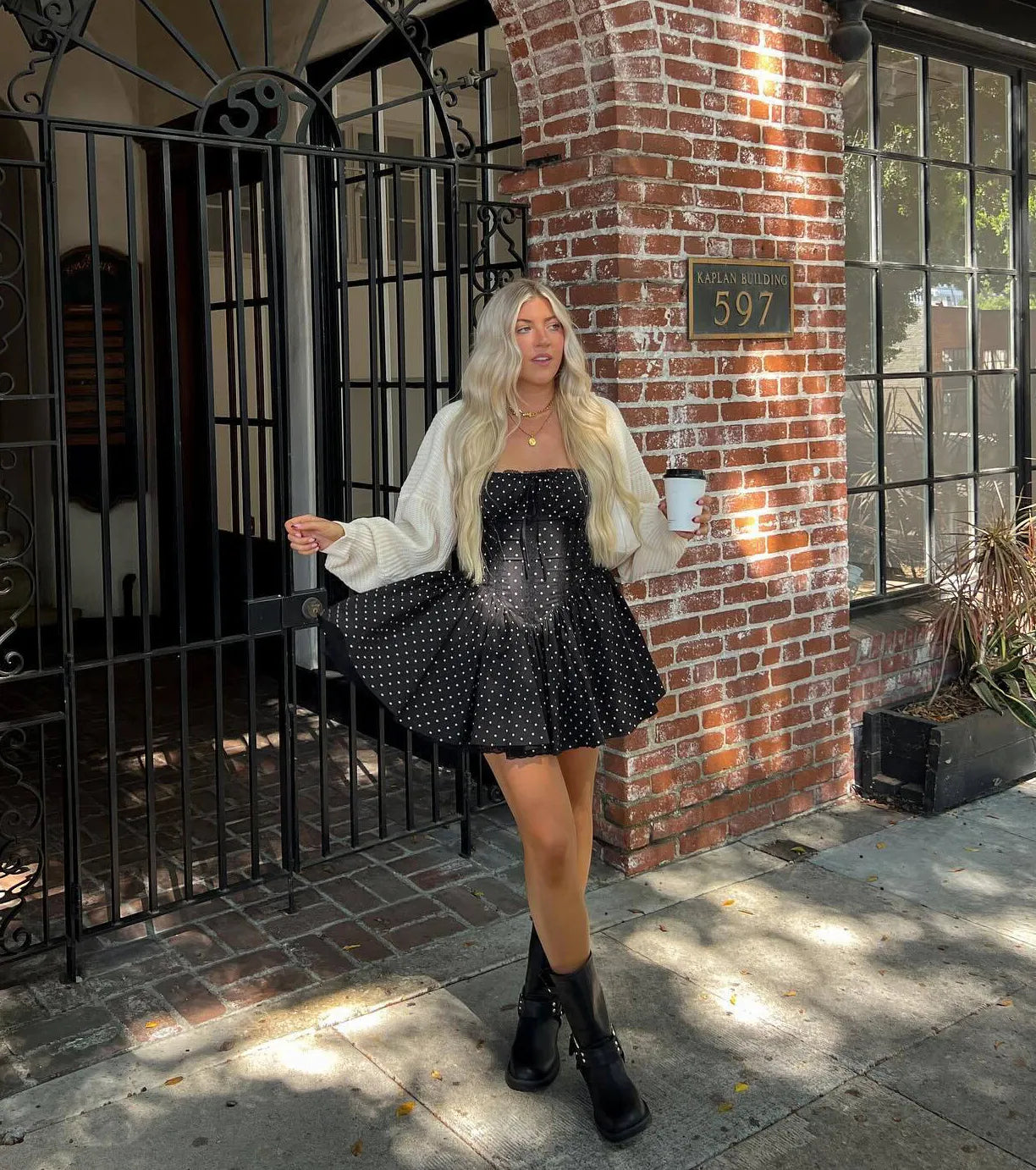 The pretty vibes of this polka dot skater dress are unmatched! The sweet dress features a corset bodice that snatches your figure while the lace-up back grabs all the attention. Complete the look with boots.