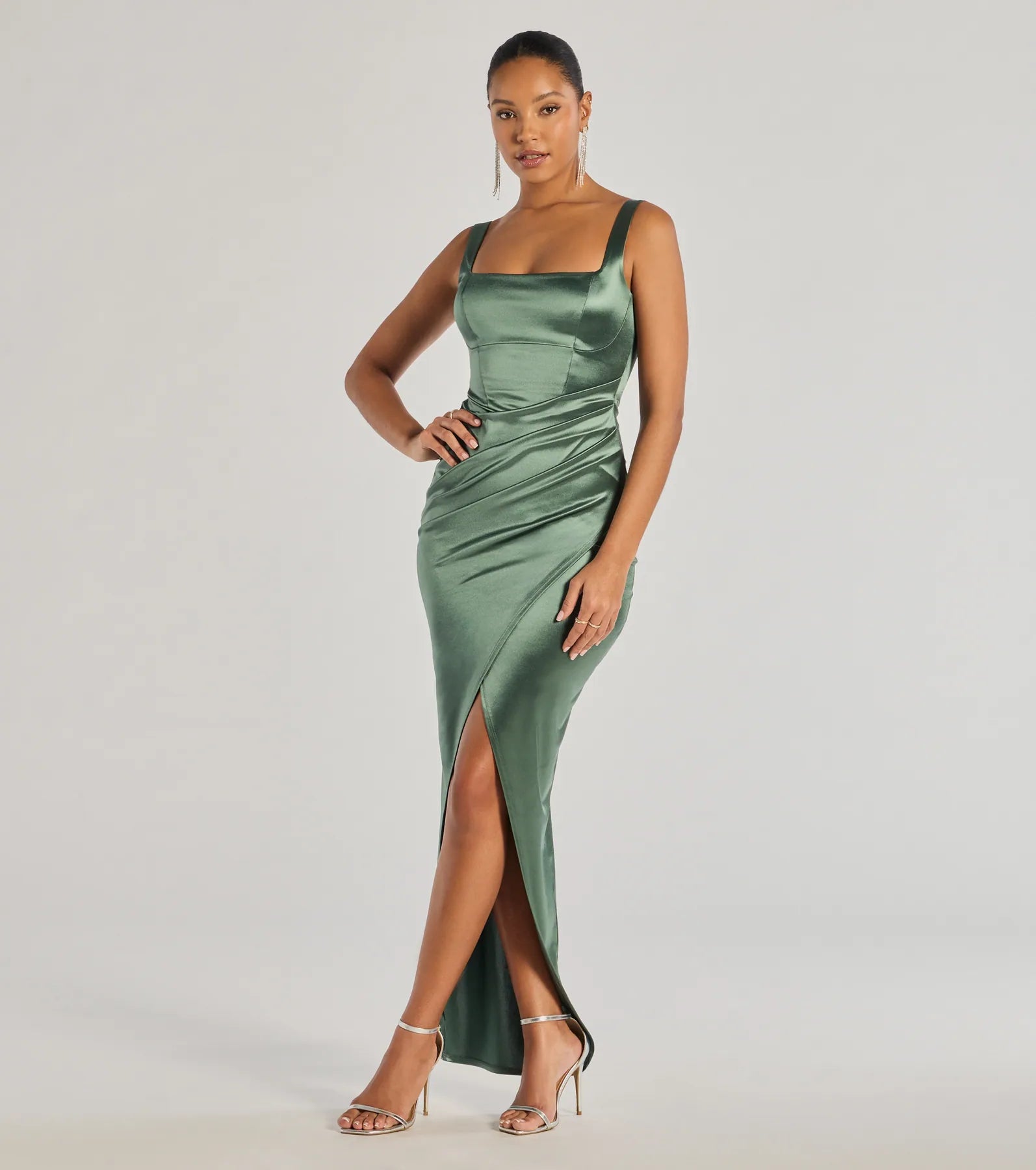 Effortlessly alluring, the Rebecca satin slim-fit formal dress is a must-have for weddings, parties, or any special affair. She features a sleeveless square neck and back design, tank shoulder straps, a corset-inspired bodice with a fitted high waist seam, a floor-length hem with a faux wrap-front creating a slit, ruched detailing, and a slim-fit silhouette. The silky satin-knit fabric offers a moderate stretch. Complete your look with this chic formal dress with platform heels.