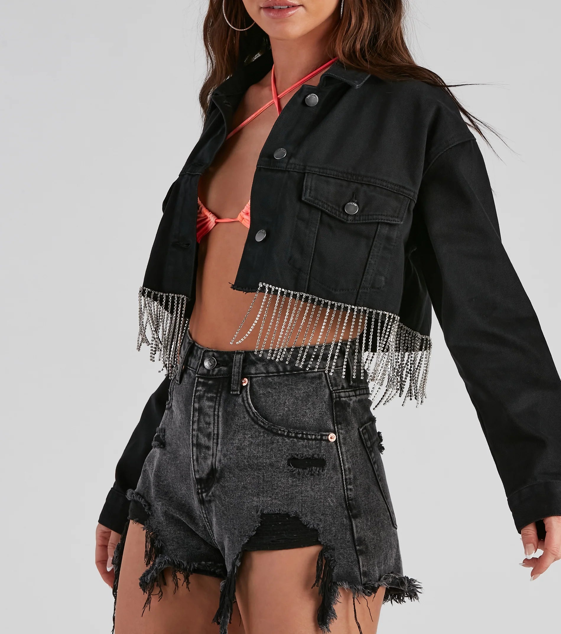 Elevate your fit in this rhinestone fringe denim jacket featuring long sleeves with button cuffs, a collared neckline, dual front button-down closure, and flap pockets on a cropped hem. Complete the look in a sleek bodycon dress for a night out.