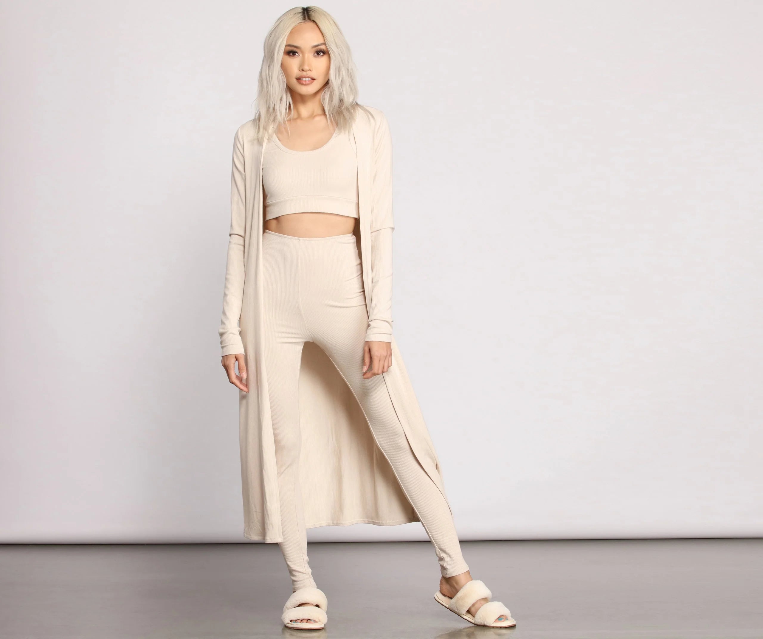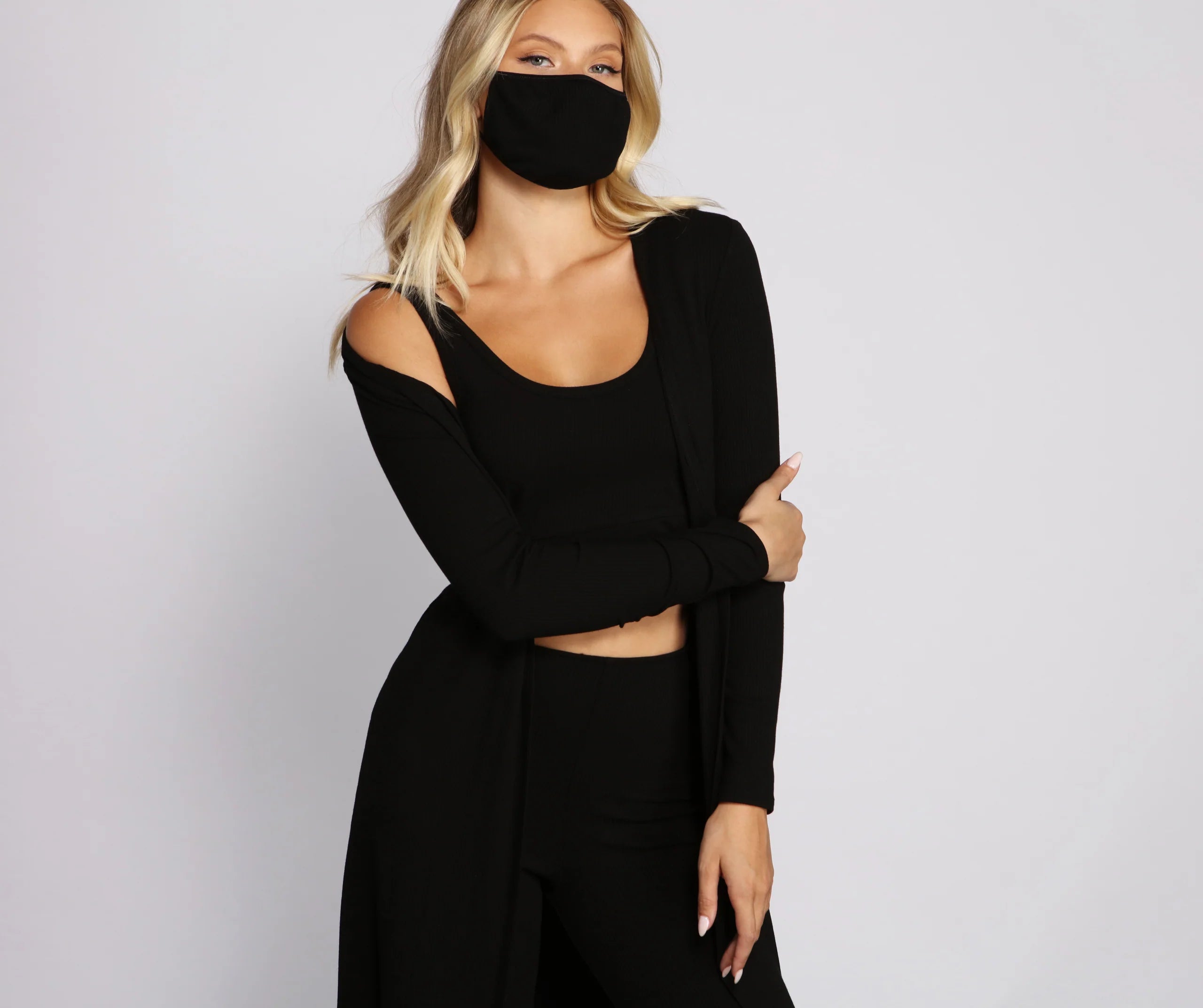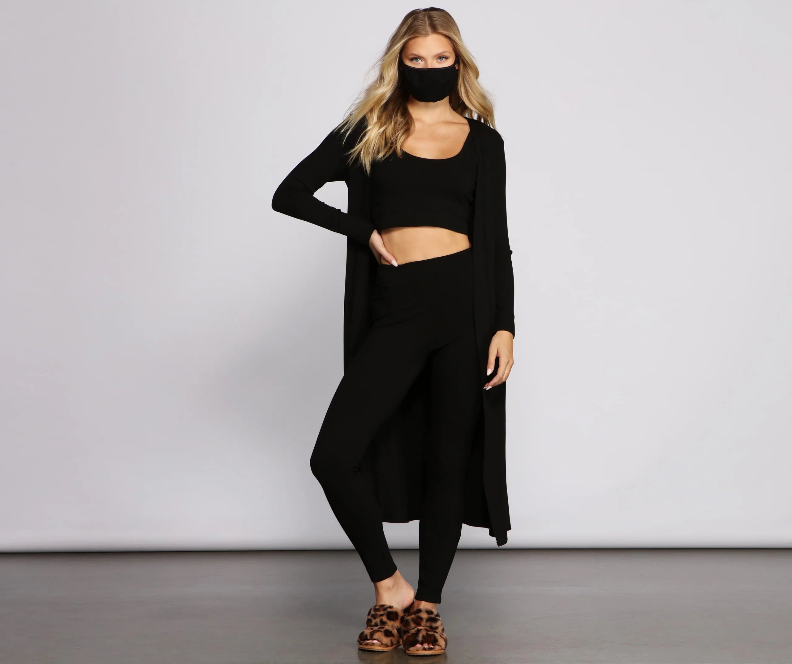 Layer up in a cute duster to lounge in! the duster features a draped open front, long sleeves, long length, and is composed of a ribbed knit fabric. Complete your look with the matching crop top, high waist leggings, and face mask.