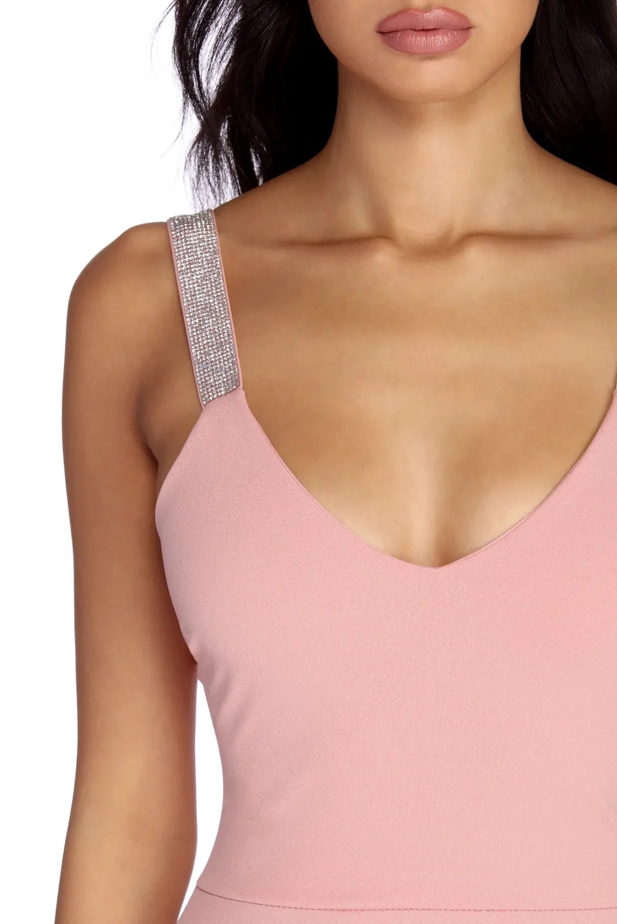 Keep it pretty in pink as you bring the glam in our charming Rose dress! She features a gorgeous pink hue, a sleeveless bodice, a V neckline and wide rhinestone embellished shoulder straps. Her slim fit bodice leads to a curve hugging mermaid silhouette that showcases every curve. Dress is composed of a crepe fabric that offers a moderate stretch.