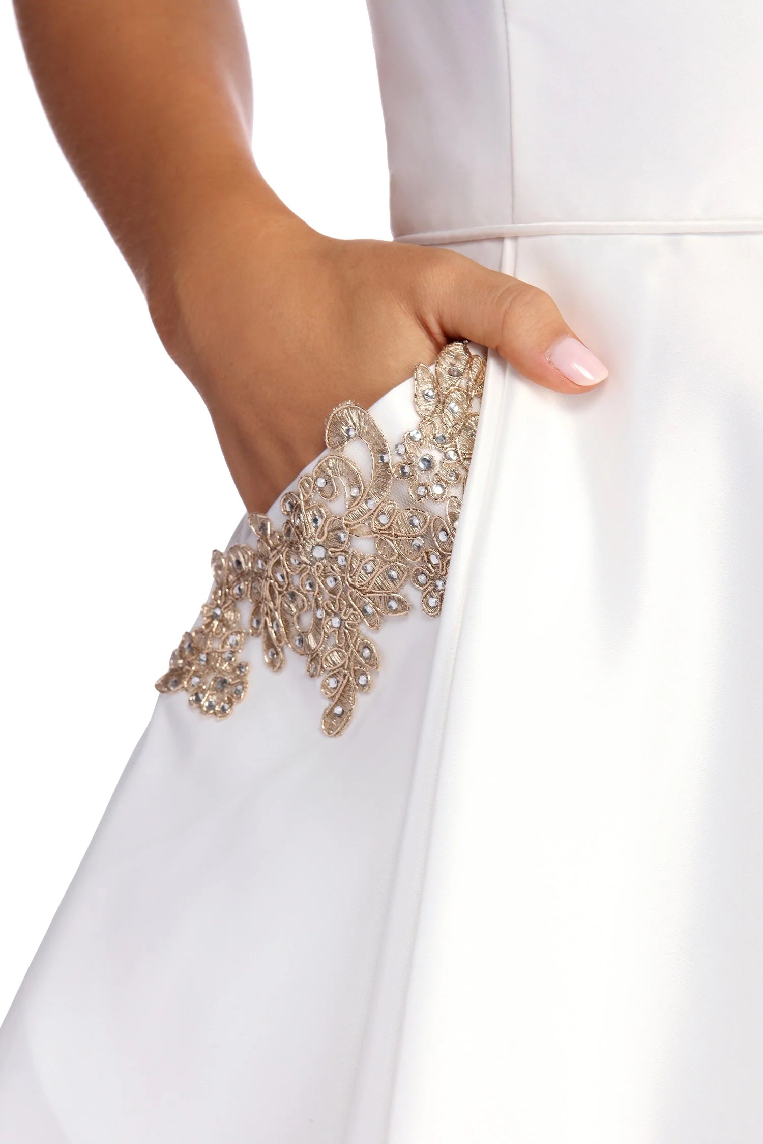 From the moment you try on Rose, you'll never want to let go! She features a strapless sweetheart neckline, a no slip strip, built in boning and padded cups. Her flared party skirt features hidden side pocket with an embroidered detail and rhinestone embellishments. She is composed of a lined satin fabric that offers a form hugging fit with minimal stretch. Includes a petticoat and back zipper closure.