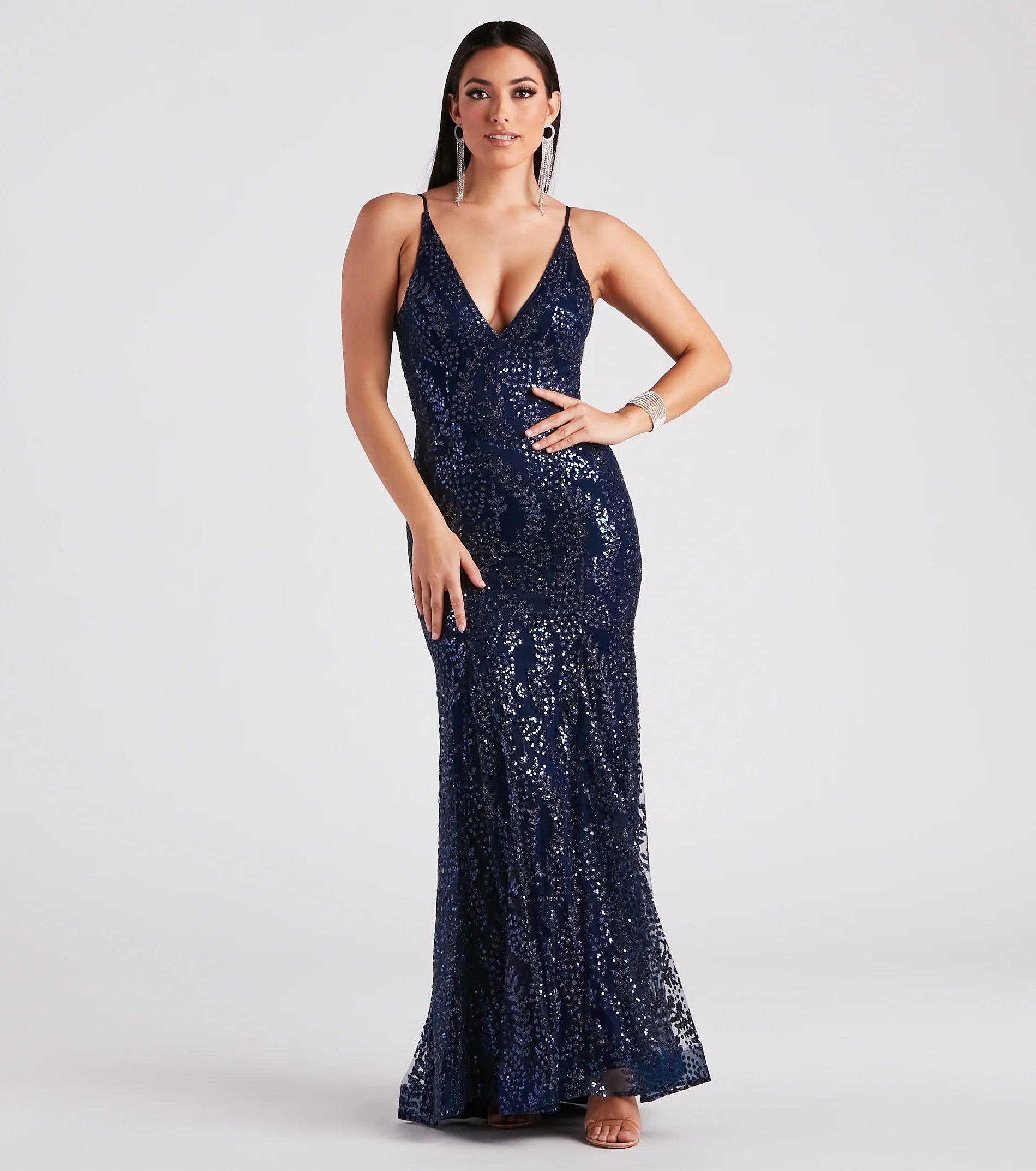 Radiate beauty and illuminate the night in the stunning Rosie formal glitter mesh mermaid dress! She features a sleeveless deep V-neckline with a padded bust, adjustable spaghetti straps, a lace-up design at the back for a customized fit, a chic lower back cutout, a form-hugging fit at the waist to accentuate your curves, and a floor-length mermaid silhouette. The lined mesh fabric features all-over glitter and sequin detailing in an intricate leaf-shaped pattern for an elegant look. Style with rhinestone fringe earrings for your next black-tie event.