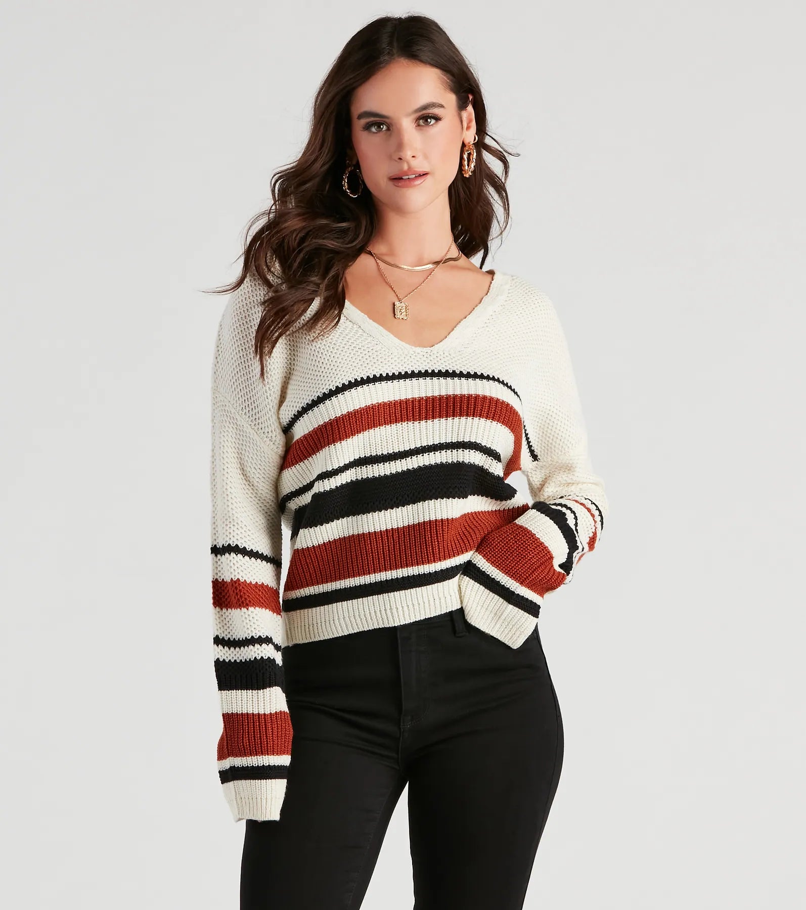 Keep it sassy in a striped sweater that is so chic! The sweater features a V-neckline, a striped design, a lattice back, and is composed of knit fabric. Complete your look with a chic high waist skirt.