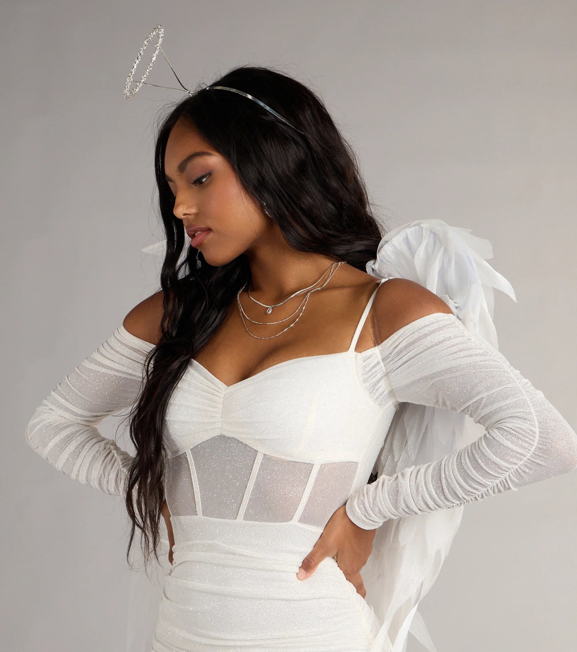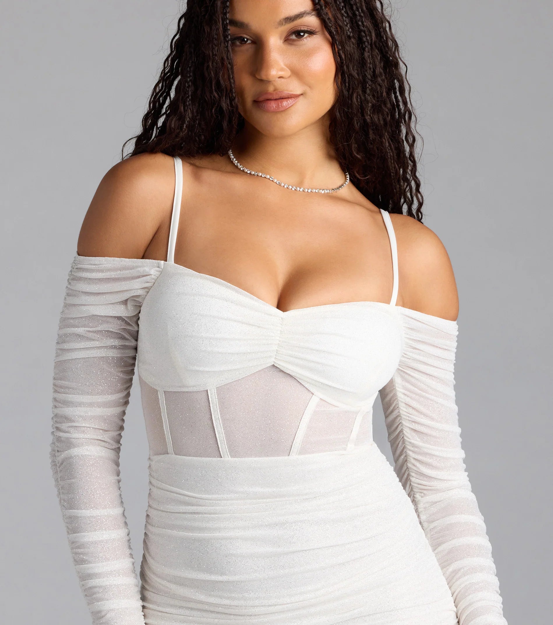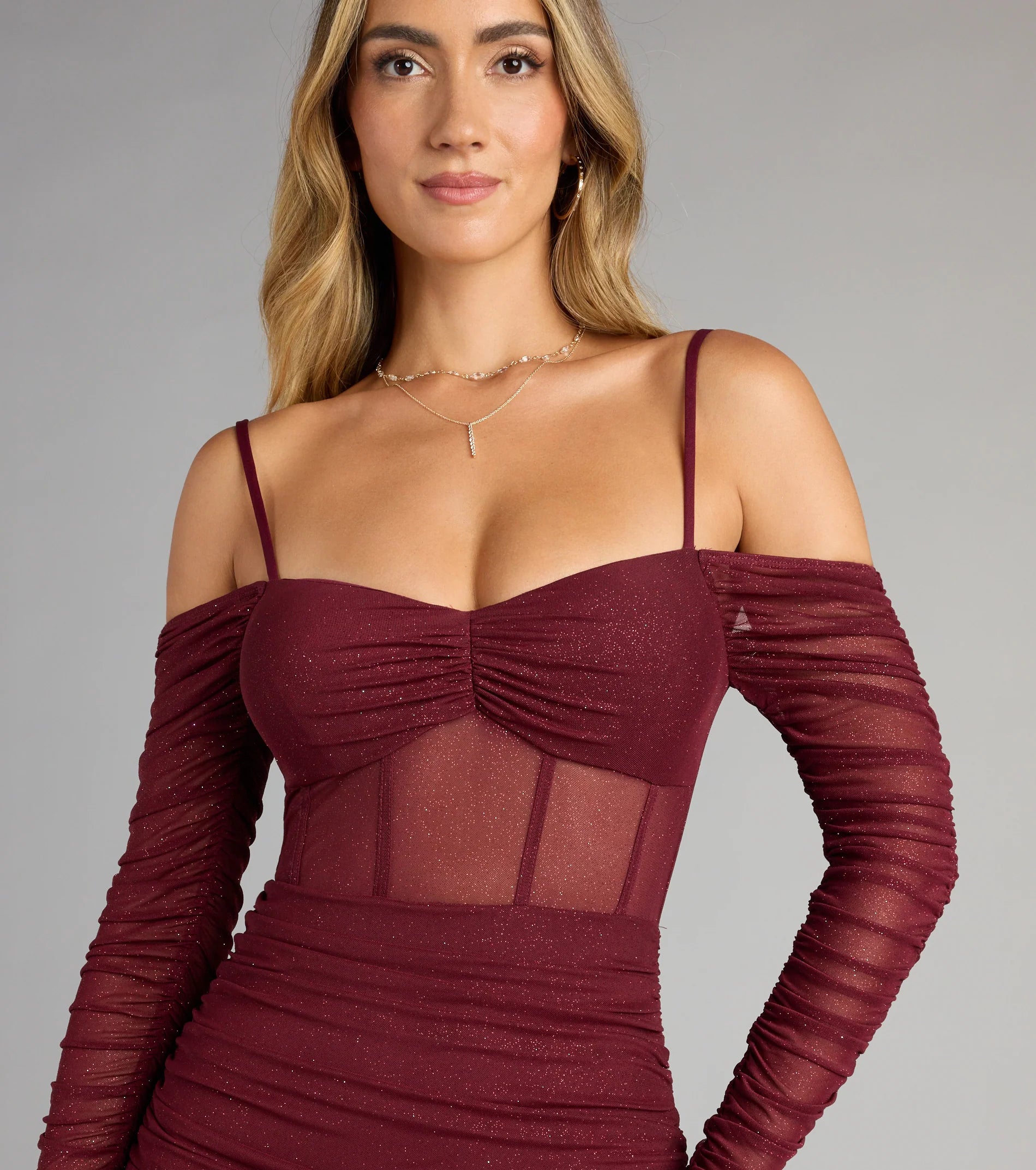 Shine on the dance floor in this glitter mini dress designed to own the spotlight! With a flirty off-the-shoulder neckline, sheer long sleeves, and a bodycon fit, you'll have every eye on you.