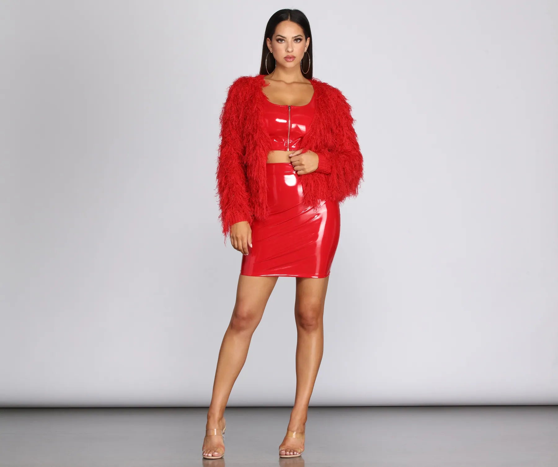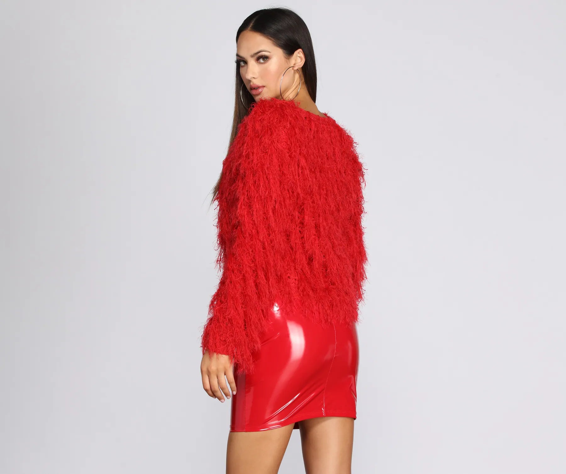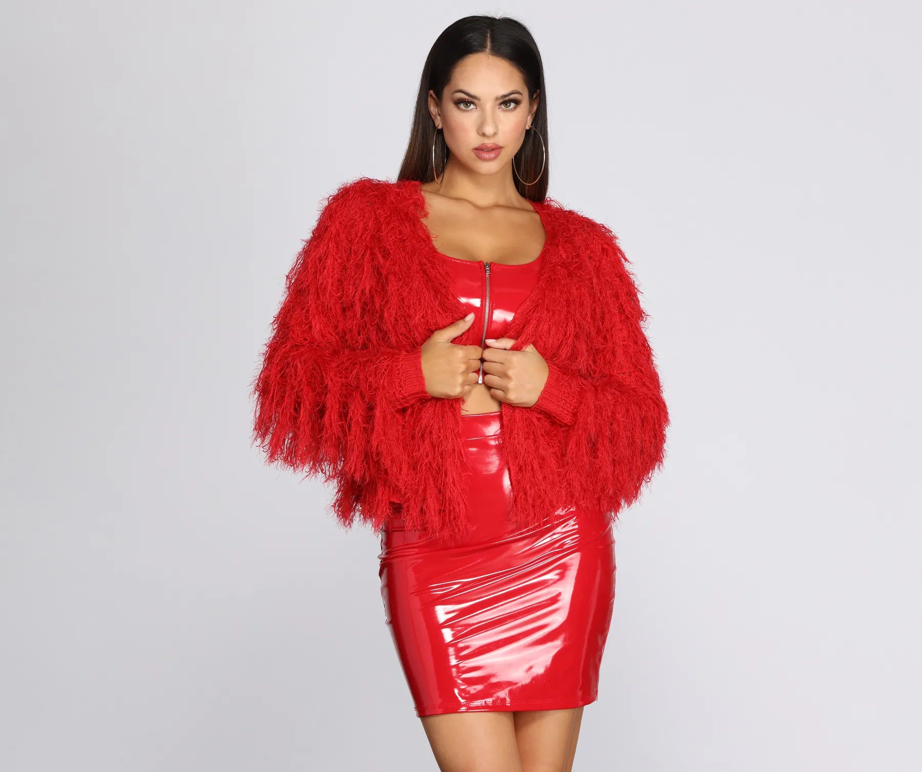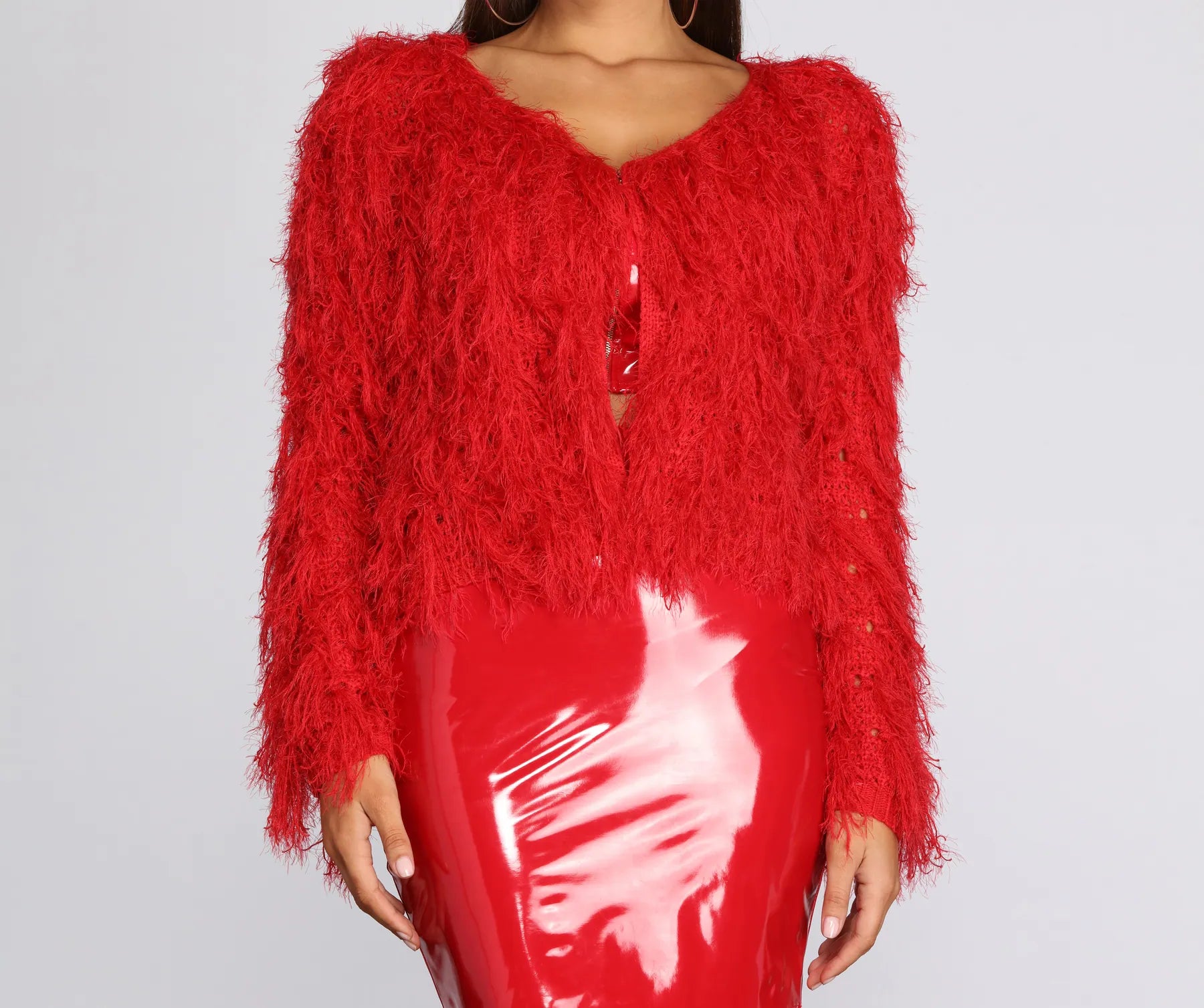Layer your look with texture! This shaggy cardigan does just that! Designed with a v neckline, long sleeves and a cropped hem. Cardigan has a hook and eye closure at the top and is composed of a woven knit material with shaggy detailing throughout.