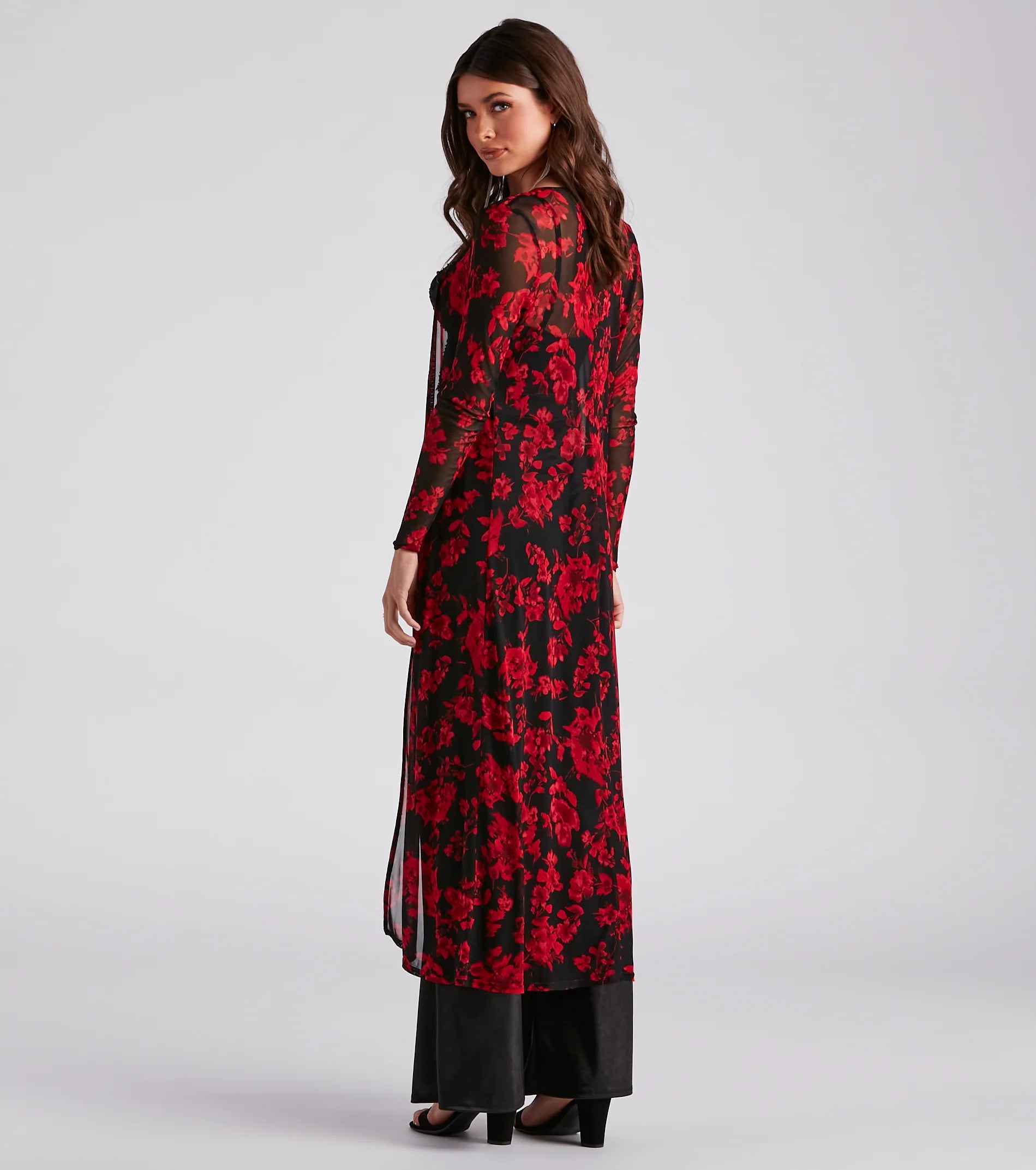 Make your point pretty clear! This floral mesh duster elevates every outfit featuring fitted long sleeves, an open-front design, and a flowy long-length hem. Complete the look with earrings and heels.