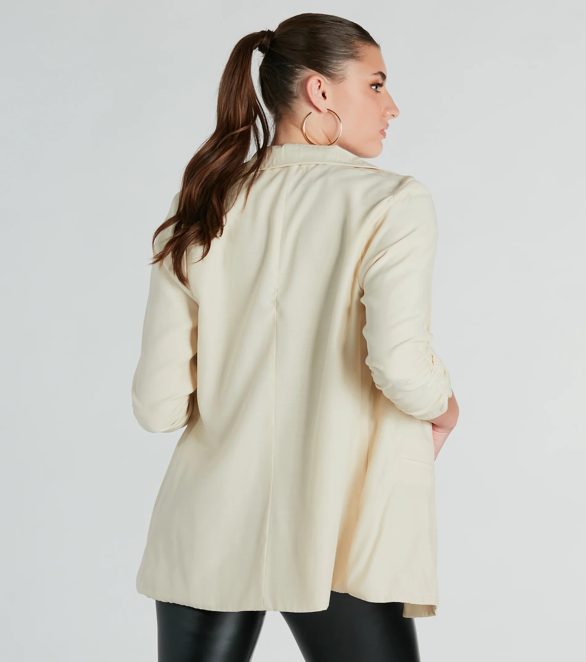 You'll be looking so chic in this ruched-sleeve woven blazer! Designed with lightweight twill fabric, it features a classic lapel collar, three-quarter-length sleeves with ruched detailing, faux front pockets, and a relaxed fit. Layer over a bodysuit with dress pants styled with mules for the office.