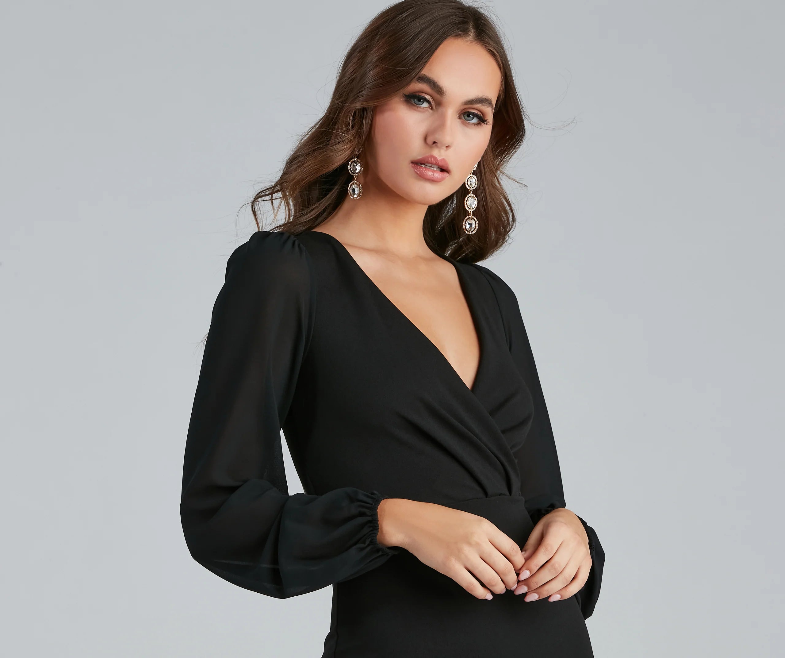 Keep the night short and sweet in this fab mini dress! It features a v-neckline, balloon long sleeves, and a wrap-fitted bodice on a bodycon silhouette. Composed of a crepe fabric. Style with sparkly statement earrings.