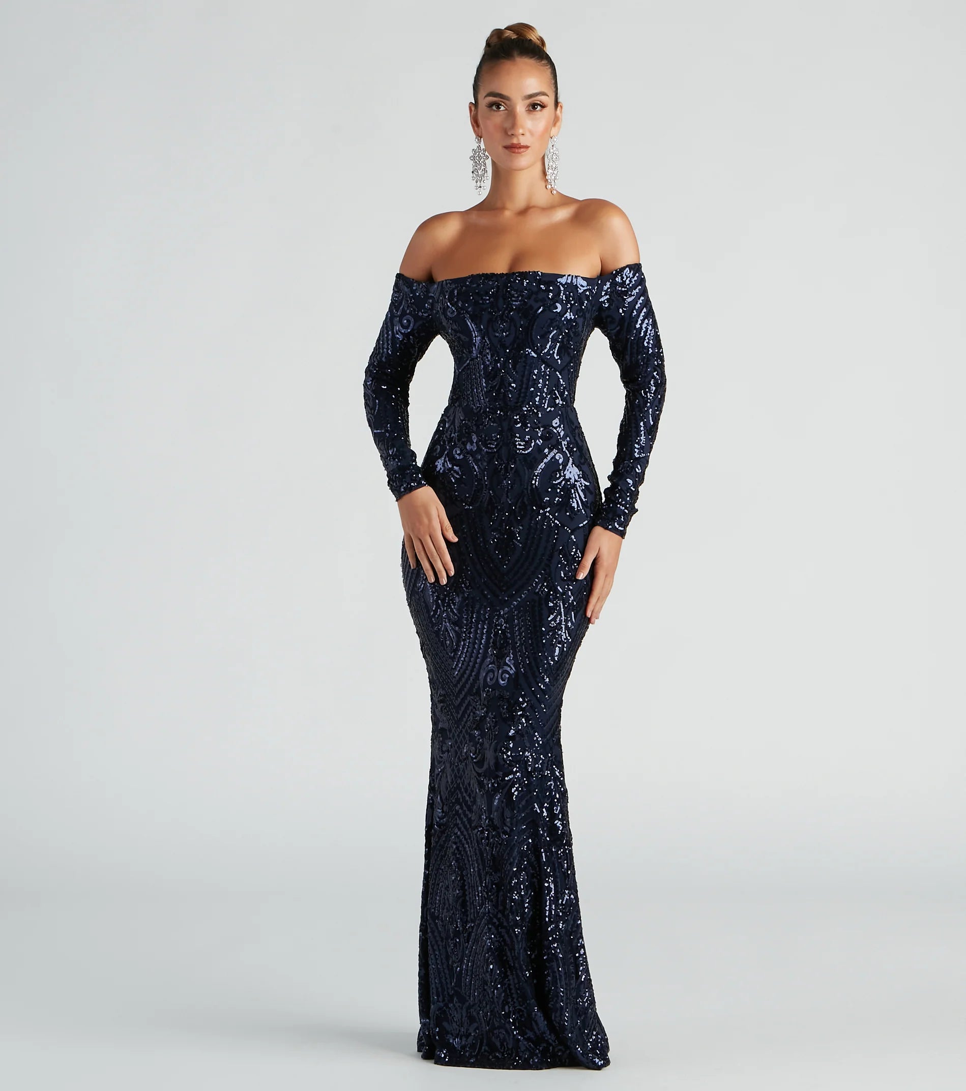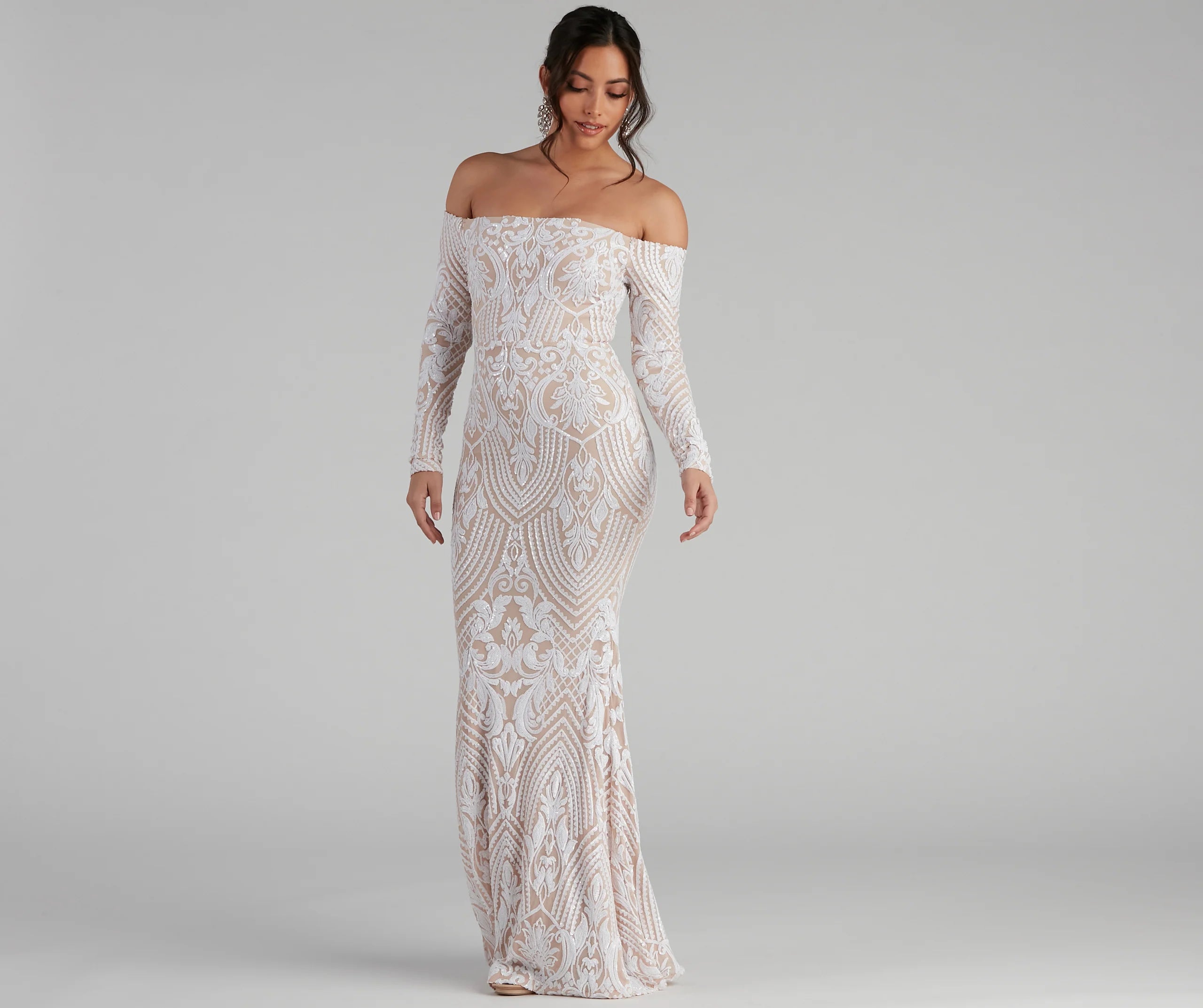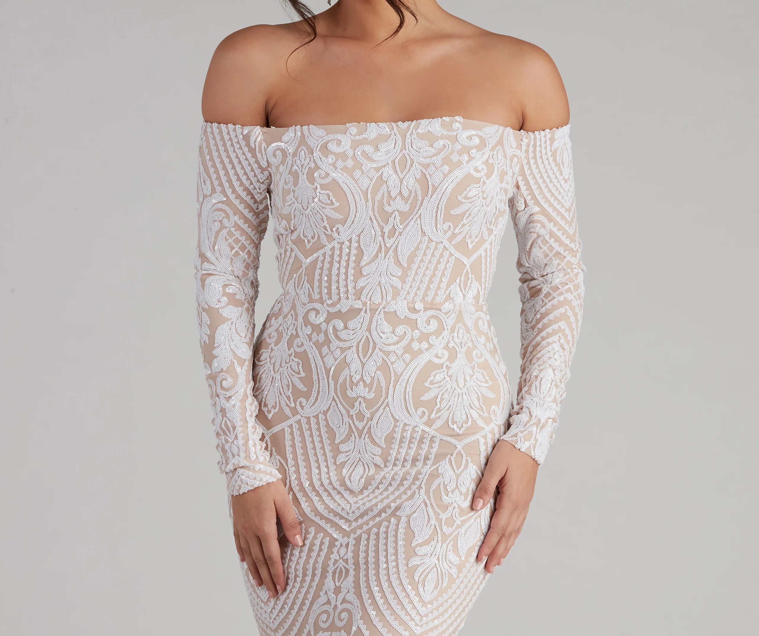 Be a total sequin stunner in our Sierra formal dress! She features an off-the-shoulder square neckline, long fitted sleeves, a back zipper, and hook and eye closure, and a high waist seam. Her long floor-length skirt flows down beautifully and has a flattering, form-fitting look. The dress is composed of a sheer mesh fabric adorned with all-over sequins in an intricate pattern and includes a stretchy knit lining. Style this dress with rhinestone statement earrings and a sparkly evening bag.