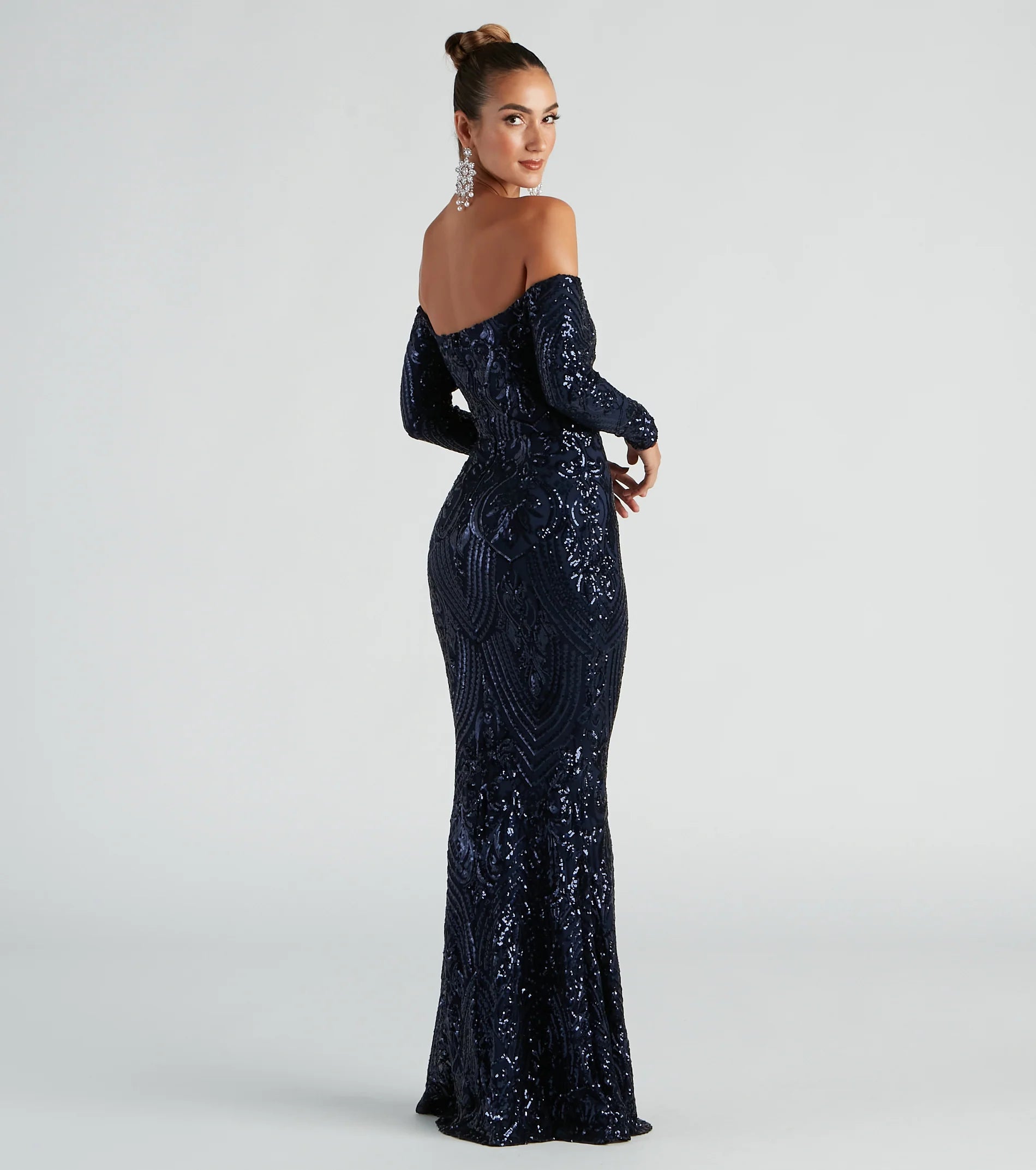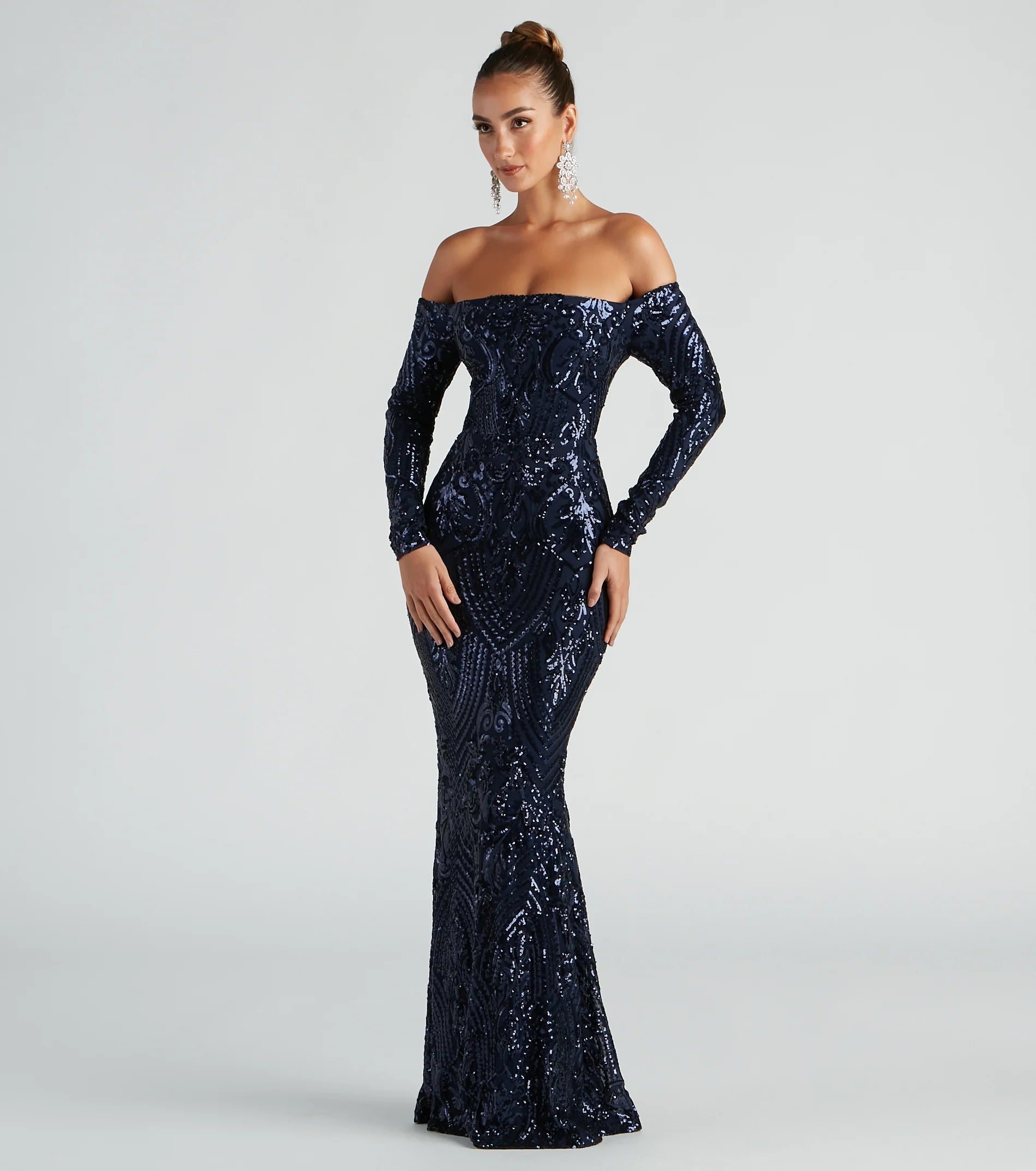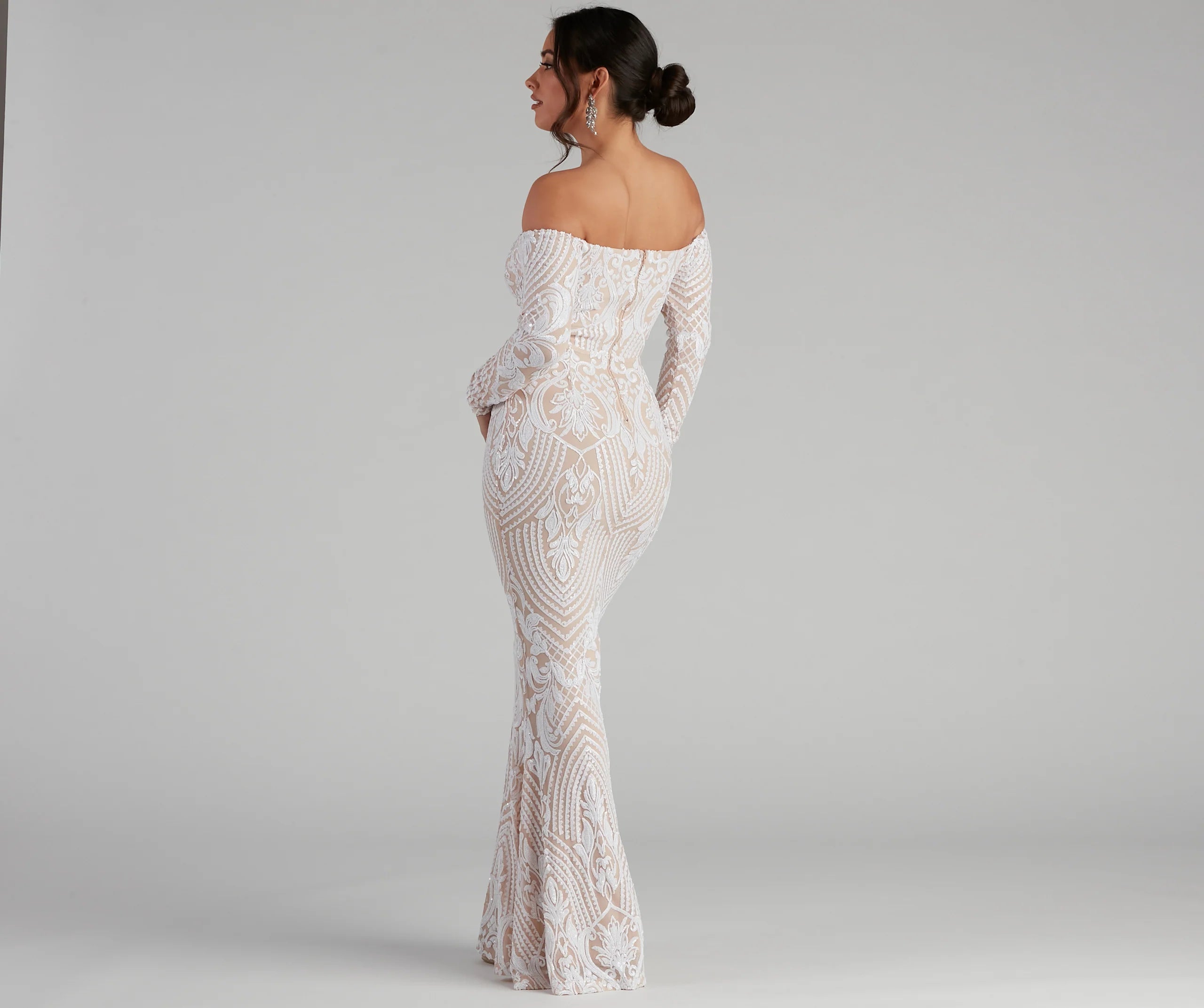 Be a total sequin stunner in our Sierra formal dress! She features an off-the-shoulder square neckline, long fitted sleeves, a back zipper, and hook and eye closure, and a high waist seam. Her long floor-length skirt flows down beautifully and has a flattering, form-fitting look. The dress is composed of a sheer mesh fabric adorned with all-over sequins in an intricate pattern and includes a stretchy knit lining. Style this dress with rhinestone statement earrings and a sparkly evening bag.