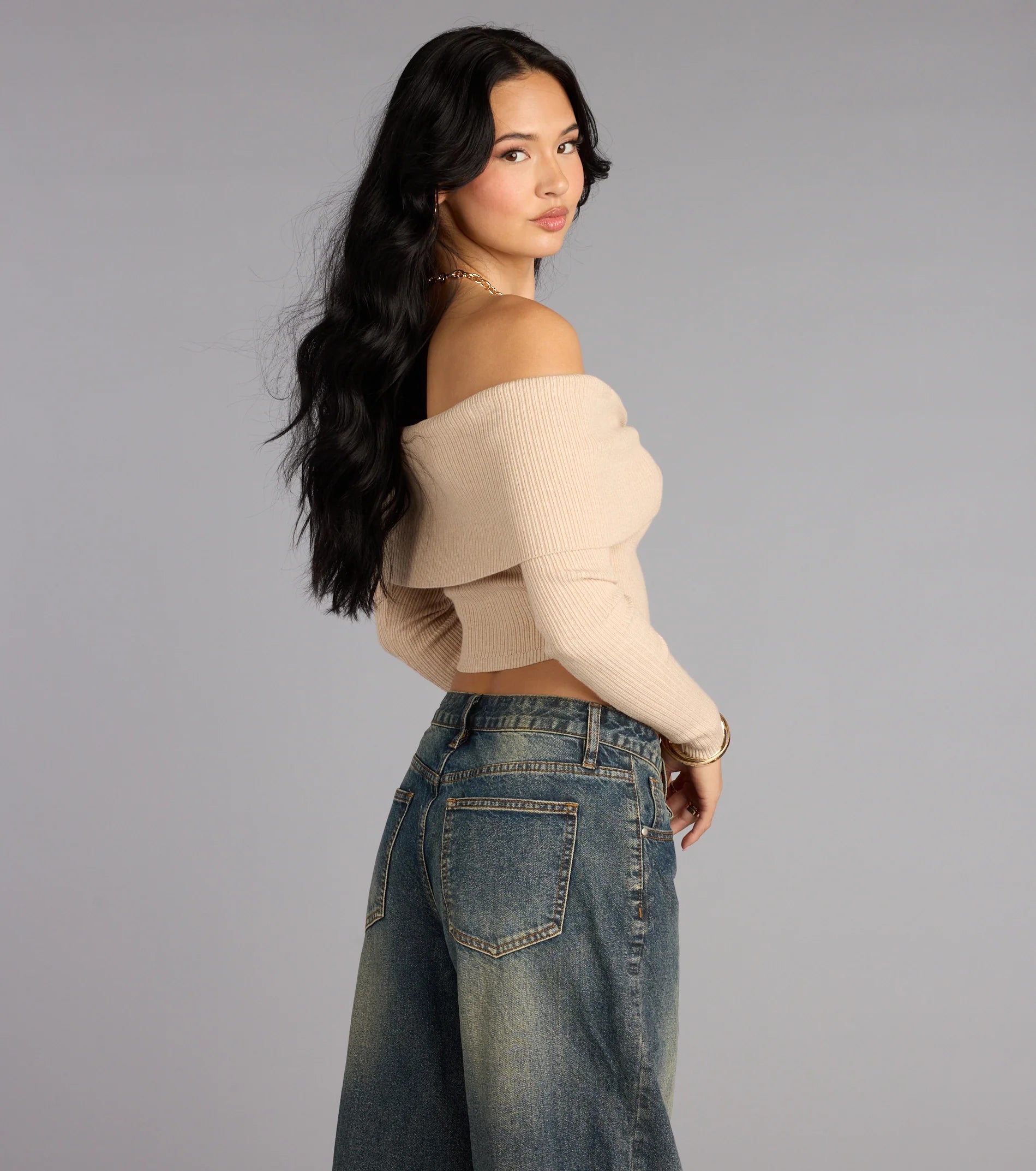 Cozy meets flirty—this rib knit crop sweater top brings soft texture and an off-the-shoulder foldover neckline that feels made for fall nights.