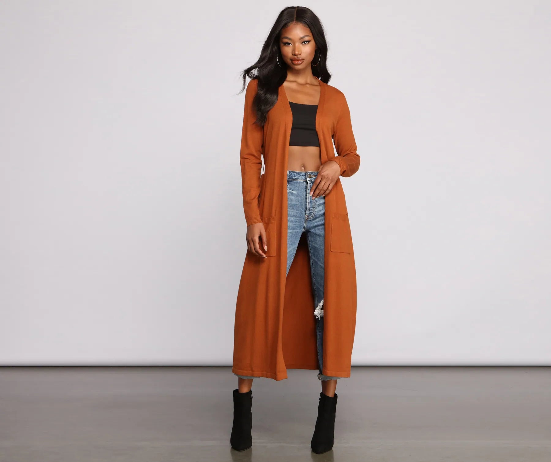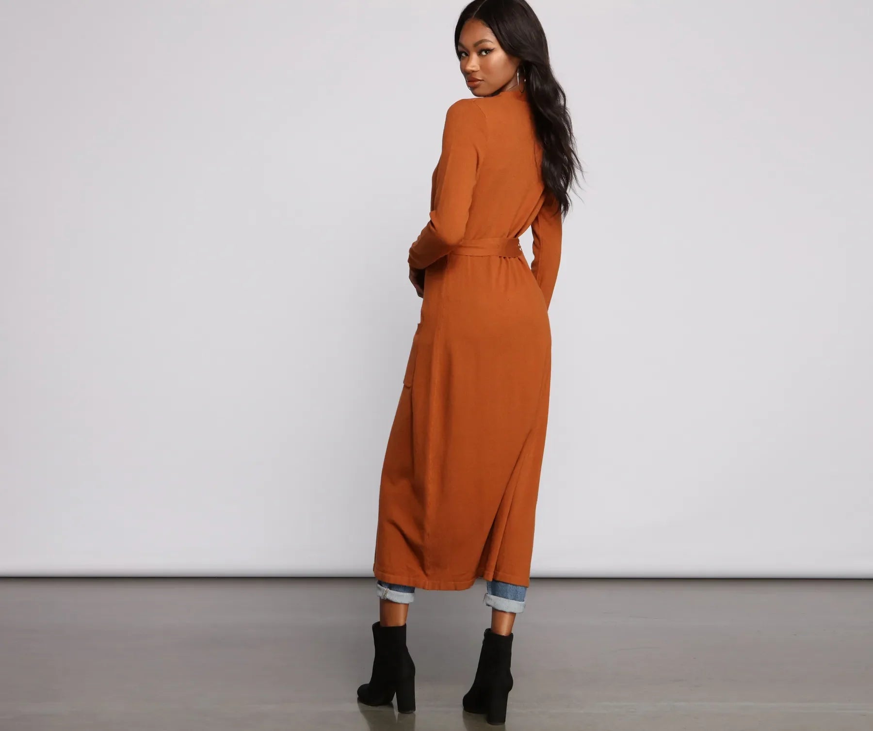 Get tied to this chic duster to layer all your favorite looks this season! The duster features a draped open front, a tie waist belt, front pockets, long sleeves, and a mid-calf length. The duster is composed of a knit fabric that offers a relaxed fit. Complete look with a crop top and ankle booties.