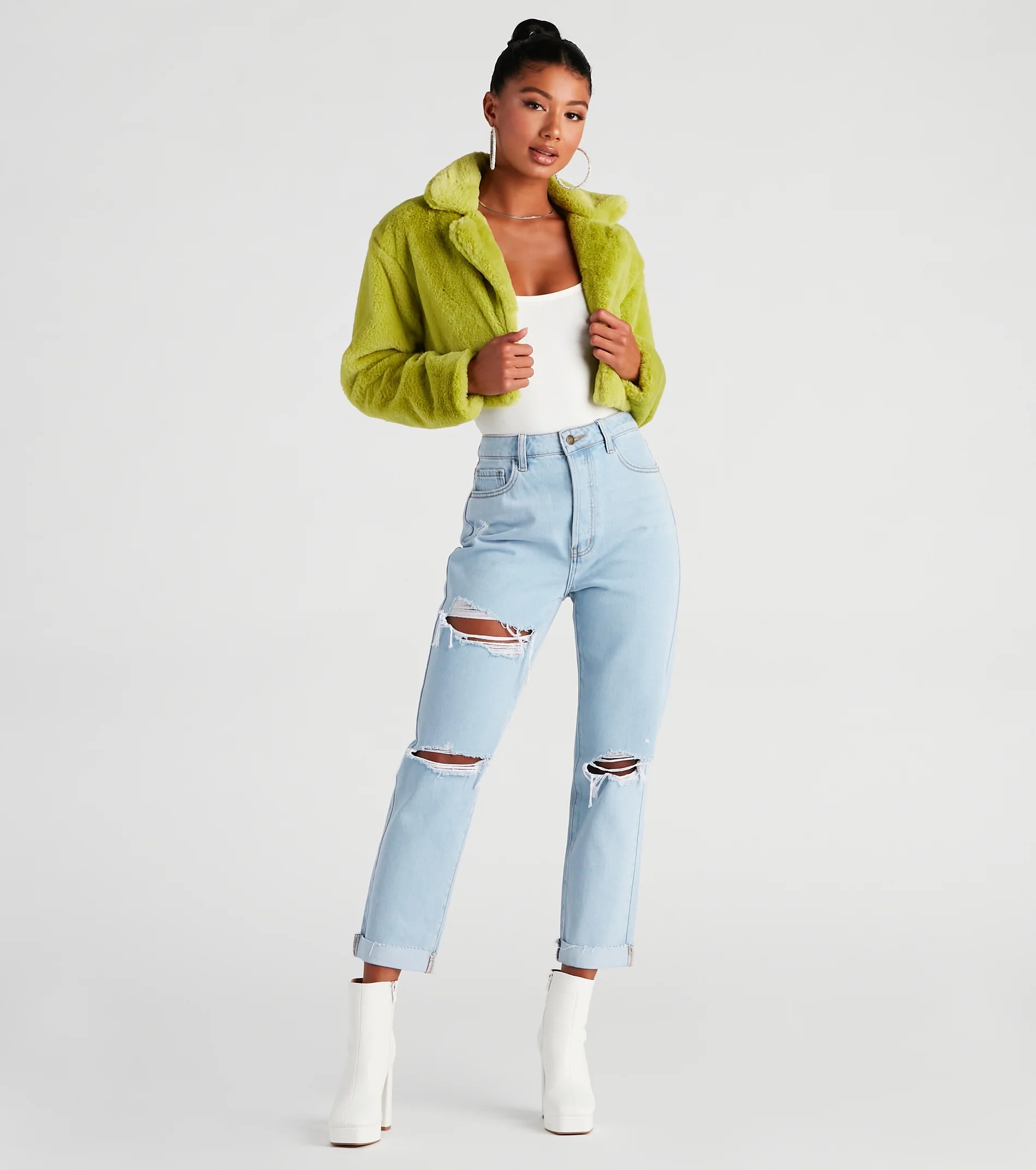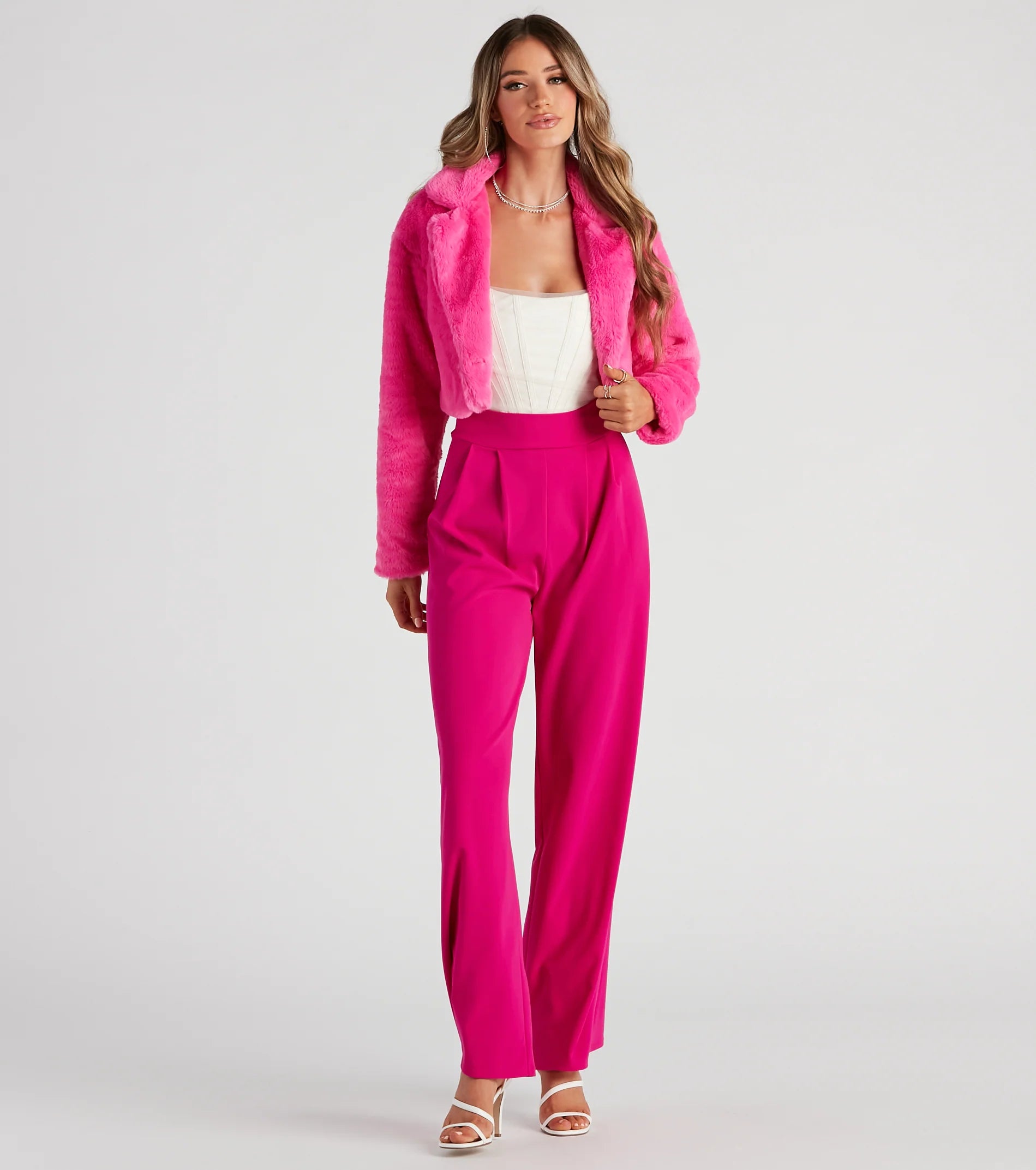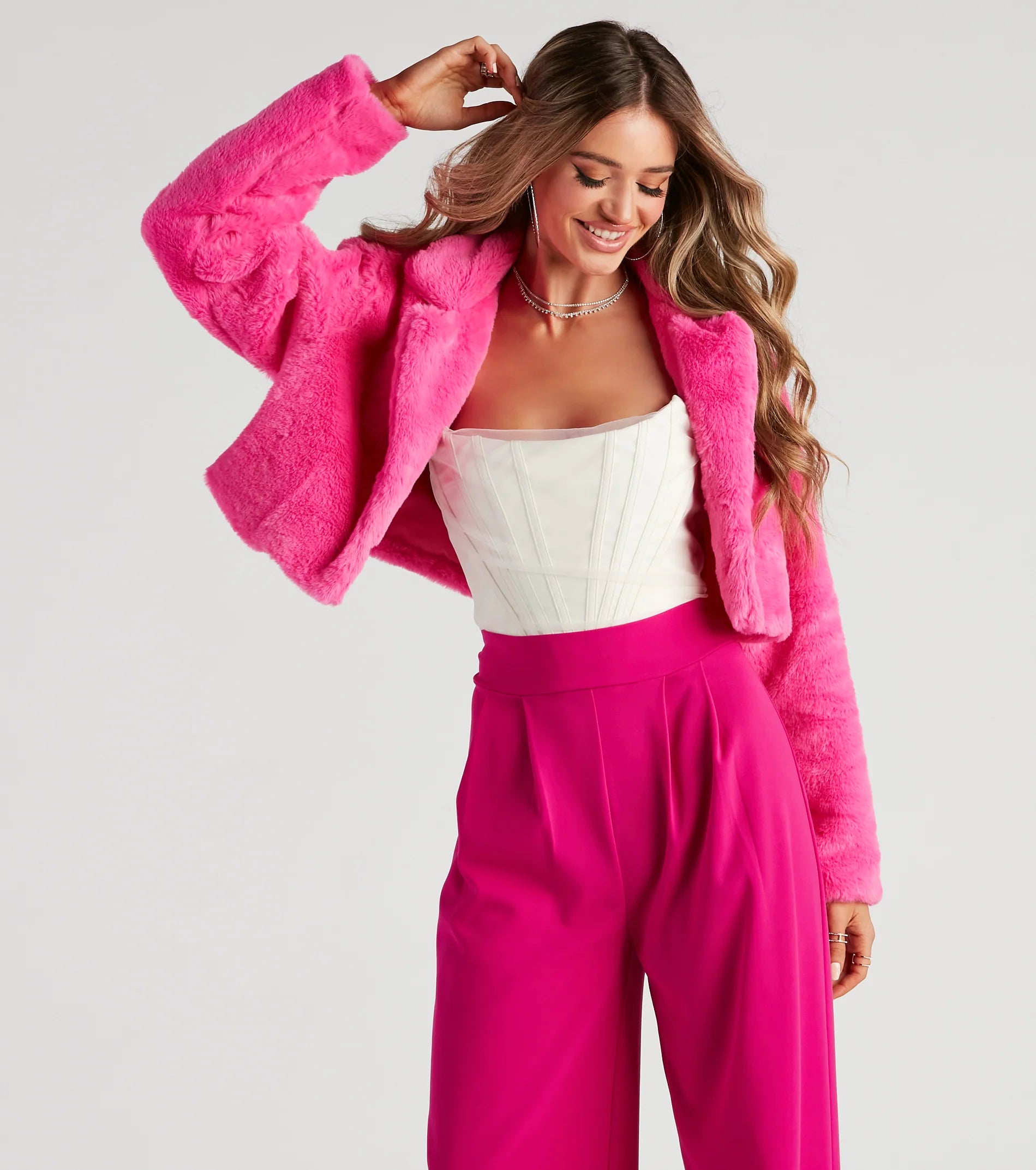 So fluffy and really cute! Layer on this faux fur crop blazer featuring long sleeves, a lapel collar neckline, and an open-front design. Style with trouser pants to complete the look!