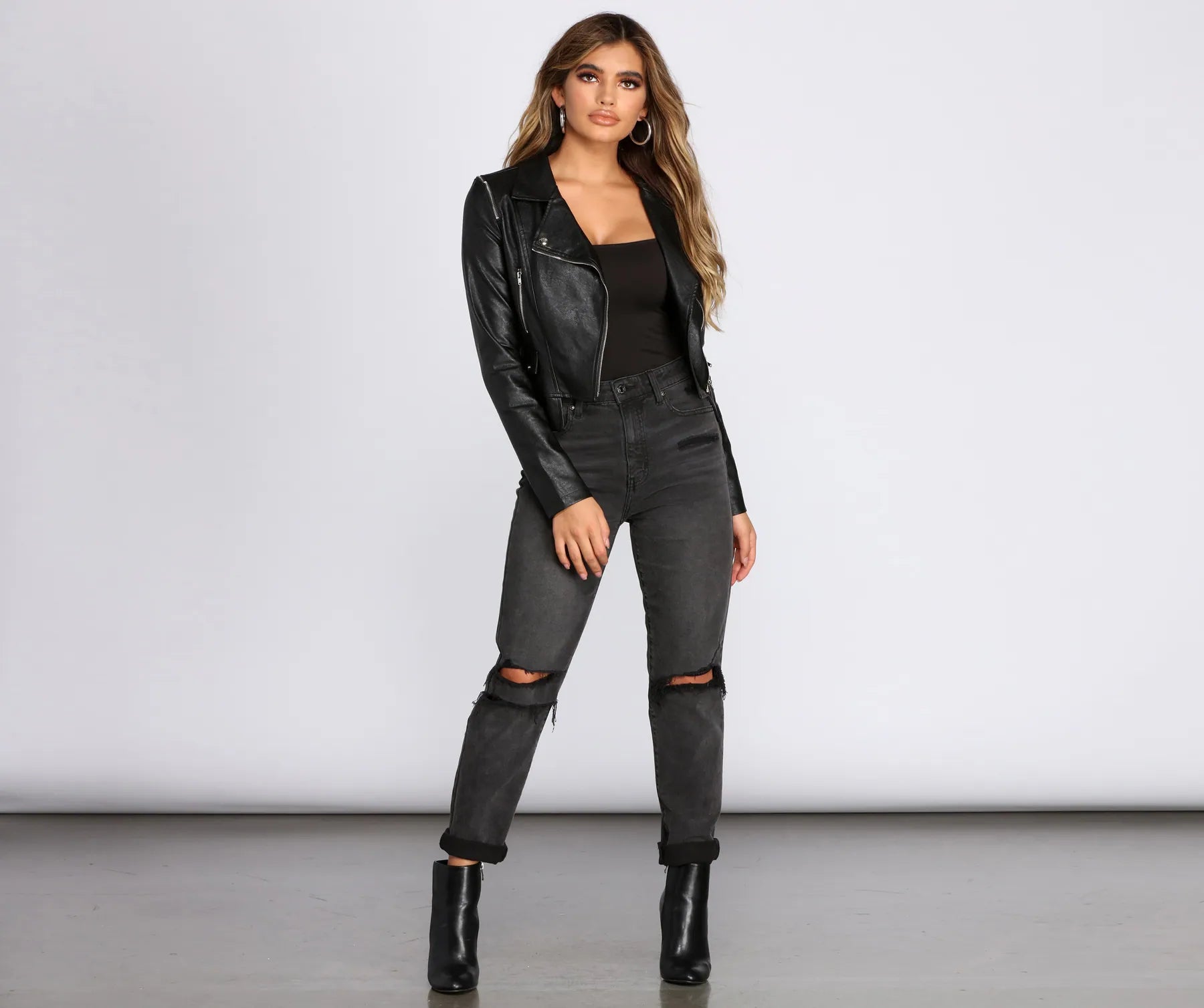 It's all in the zipper details! This moto jacket is a must for a chic and sleek vibe. Layer this jacket for a night out with the squad. The jacket features an asymmetrical zipper front, small zippered pockets, zipper details on the shoulder, a cropped, form-hugging fit, and is composed of faux leather fabric. Complete your look with high waist denim jeans and sleek hoops.